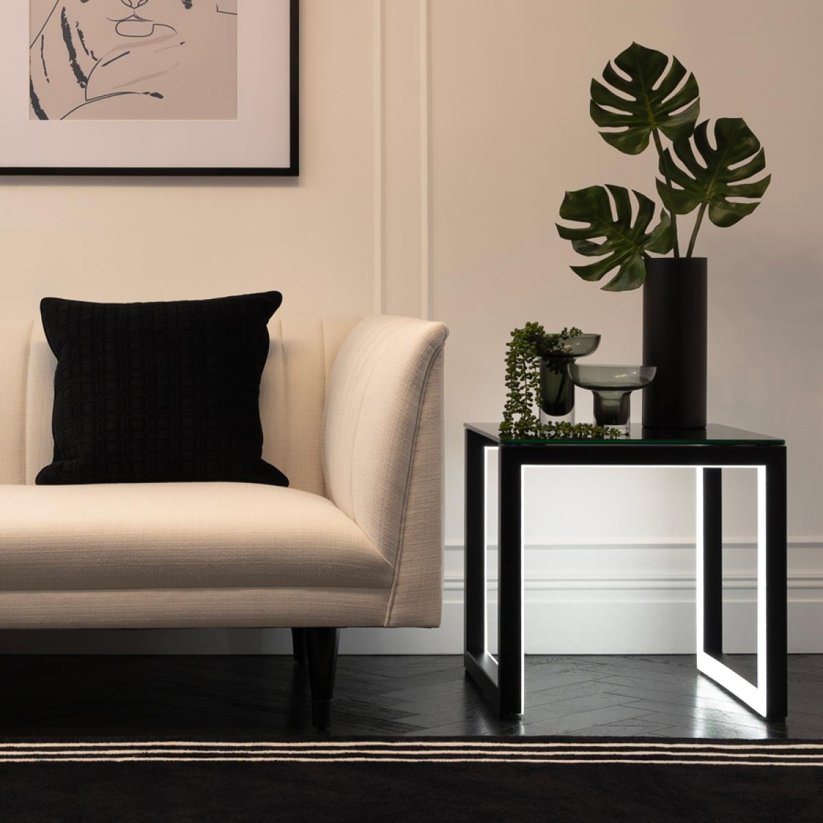 A sleek, unique and eye-catching side table with built-in lighting. Chunky toughened black glass surface. Black powder coated steel base with internal LED light source and frosted acrylic diffusers. On/off/dimmer touch switch operation. Warm, neutral and cool colour temperature settings. Rechargeable via detachable USB cable ( supplied). Will provide continuous illumination for up to 48 hours when fully charged.