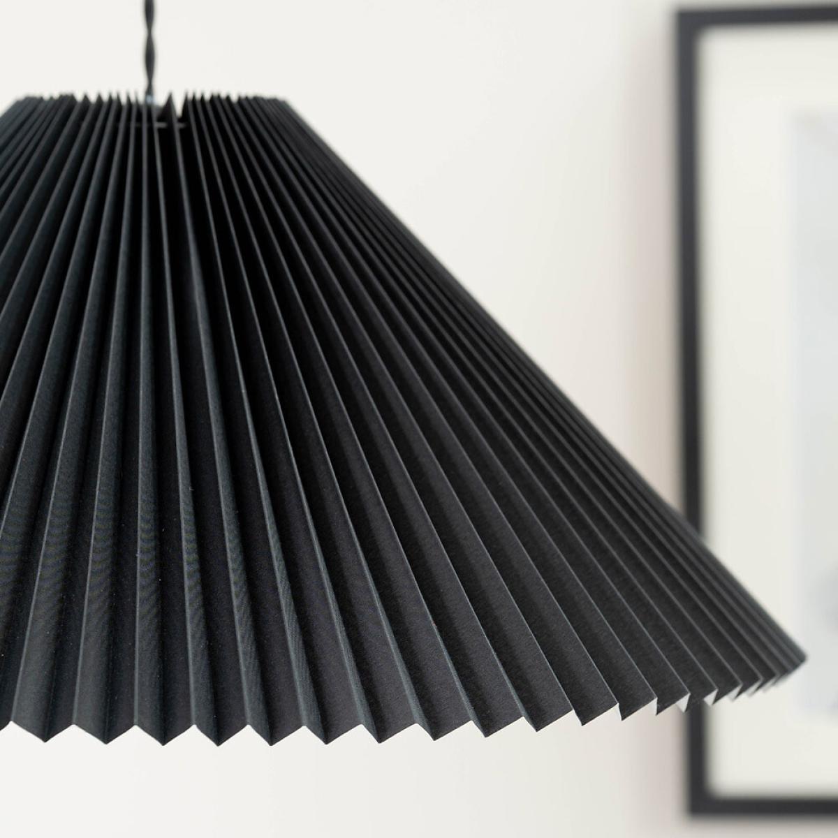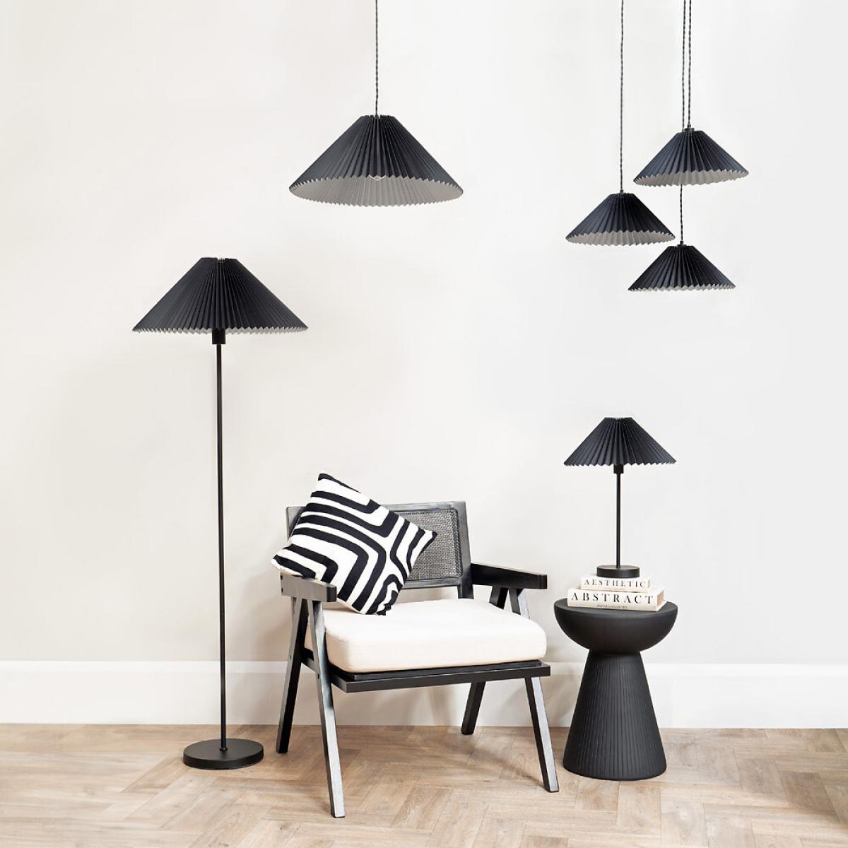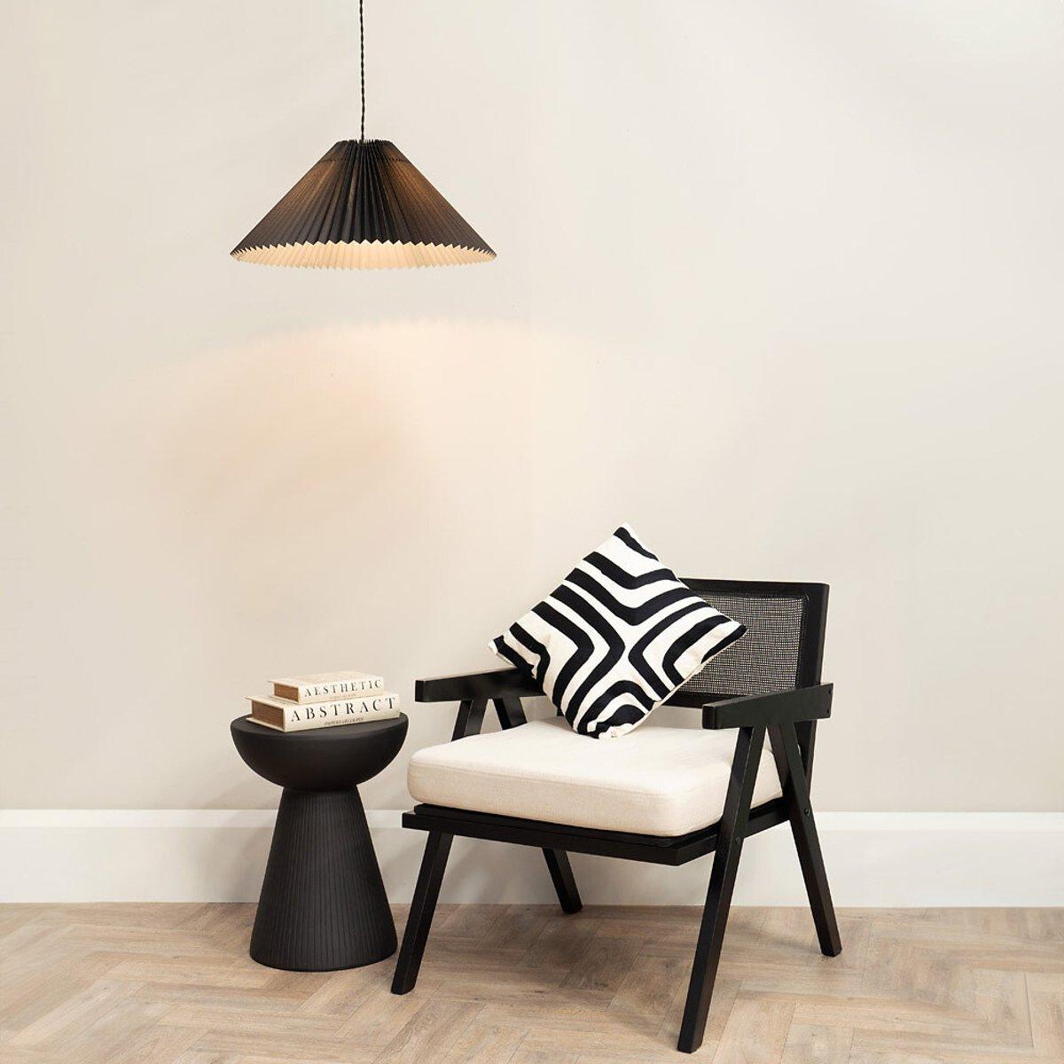 I love the Akira pendant for its sleek, contemporary silhouette that adds a stylish edge to any space. Its pleated design gives it subtle texture without overwhelming, making it versatile enough to work in a range of interiors - from minimalist and Scandinavian schemes to more eclectic settings. It’s particularly effective when hung over dining tables, kitchen islands, or even in a reading nook, creating focused lighting while adding visual interest. Practical styling tip: pair it with other black accents or geometric patterns, like the cushion shown, to create a cohesive look. Its understated elegance means it can be a statement piece without dominating the room.