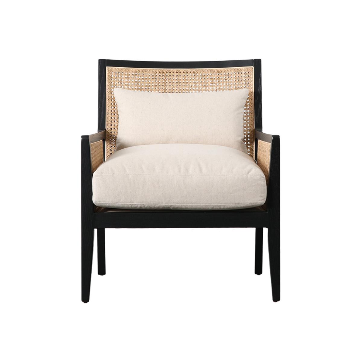 I’m a fan of the Akita chair for its straightforward silhouette and mix of materials - the cream cushion sits lightly against the natural cane back and dark-stained timber frame, so it feels both fresh and grounded. The deep seat and lumbar pillow make it a comfy occasional chair that doesn’t look overstuffed. For styling, slot it beside a slim-legged side table and a woven jute rug to form a relaxed reading corner, or pair it with a soft-grey sofa for a contemporary living area. Layer a textured throw or sheepskin over the seat, then add a couple of linen cushions in muted tones to tie everything together. It sits equally well in Scandi, coastal or laid-back boho schemes.