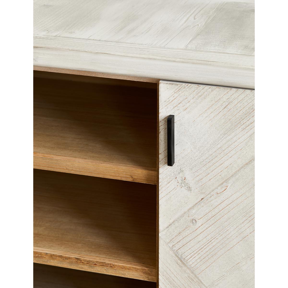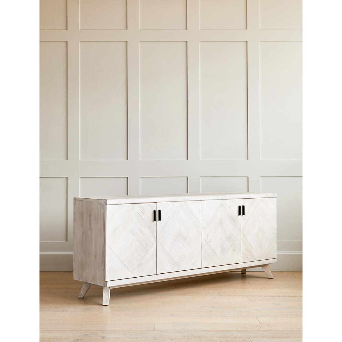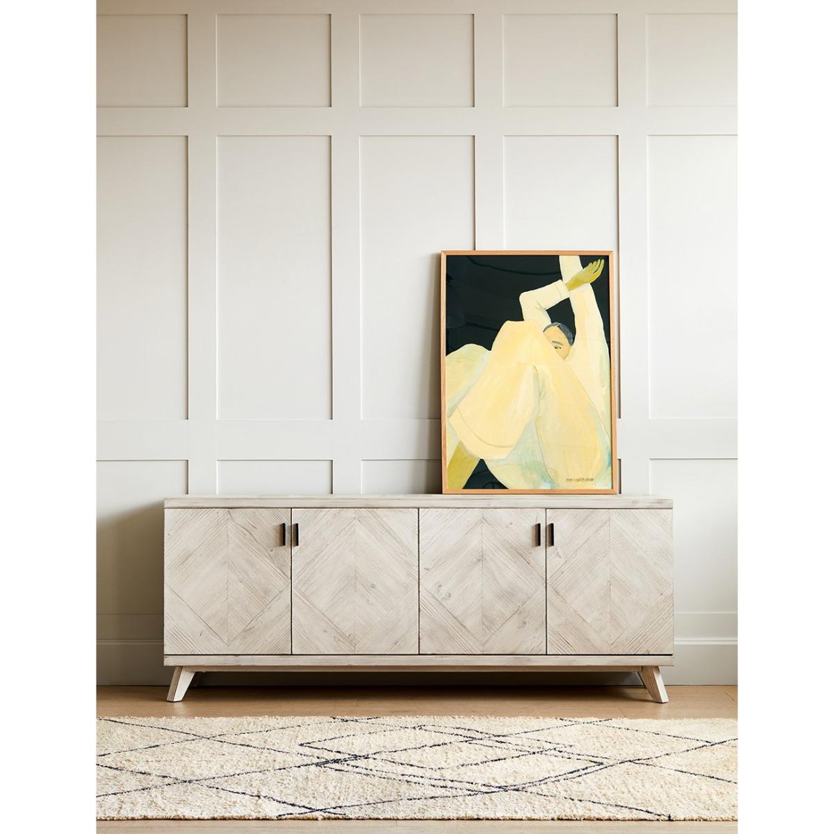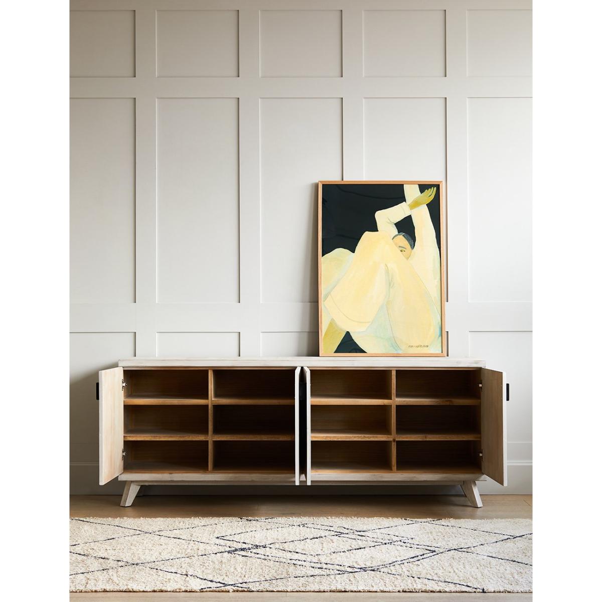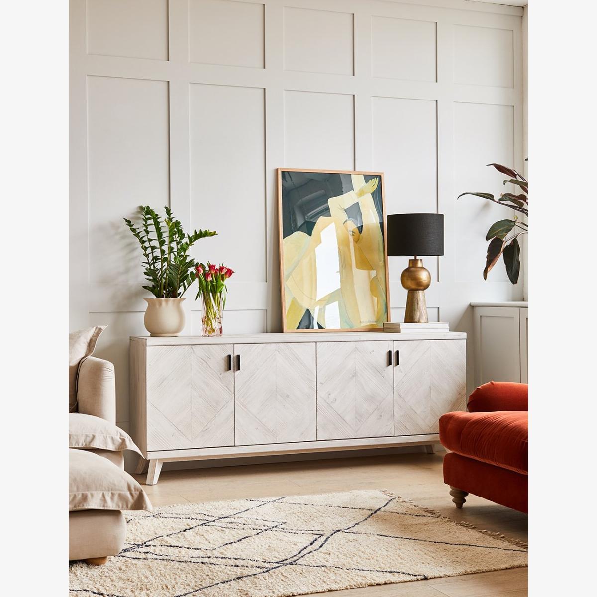 Add extra storage space to your home with the Akita Light Wood Sideboard. In a beautiful whitewash finish, this light wood sideboard is a contemporary statement piece of furniture that will look amazing in your home for years to come. With four doors and eight shelves, this sideboard has plenty of space to keep your belongings organised and your home clutter-free. The Akita Light Wood Sideboard is 2 metres wide and 80cm tall, perfect for your hallway, dining room or living area. Pair with the matching Akita TV Stand, Chest of Drawers and Console Table.
