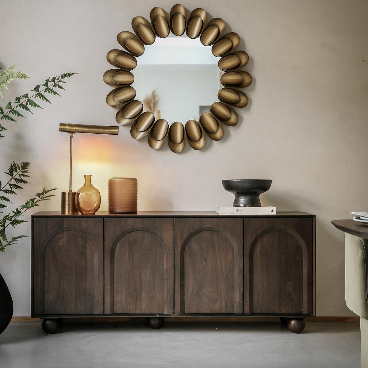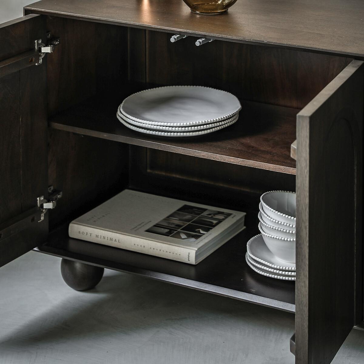 Solidly 70s and soooo retro! This gorgeous sideboard has a beautiful relieft arch design in each of the doors, finished with rounded ball feet. Internal shelves and a spacious cupboard compartment offer plenty of storage. Made with solid mango hardwood, richly grained and beautiful as well as being strong and durable, with a high lustre texture that can last for years. Mango wood has a low carbon footprint; trees reach maturity quickly and are used for furniture when they stop bearing fruit. Stylish and sustainable. Product details • Four doors • One shelf • Natural grained wood stained a dark walnut colour • Made from mango wood solids supported by mango wood veneers for additional structural support • Anti-topple kit included • Fully assembled. Product Composition - Mango Wood 100% Product Dimensions - 45 cm x 166 cm x 70 cm , Weight - 52.24 KGLeg / Feet Height - 10 cm Clearance to Floor - 10 cm. Internal Cupboard Size - W80 x D39 x H57.5 cm Distance between shelves - 27.7 cm Package Dimensions - 176 cm x 75 cm x 55 cm, Weight 59.75 KGThis product will be dispatched by one of our trusted suppliers. You’ll be contacted by their selected courier about your delivery. Please note: this product cannot be delivered to all Offshore Islands, Northern Ireland or Republic of Ireland. GALLE01