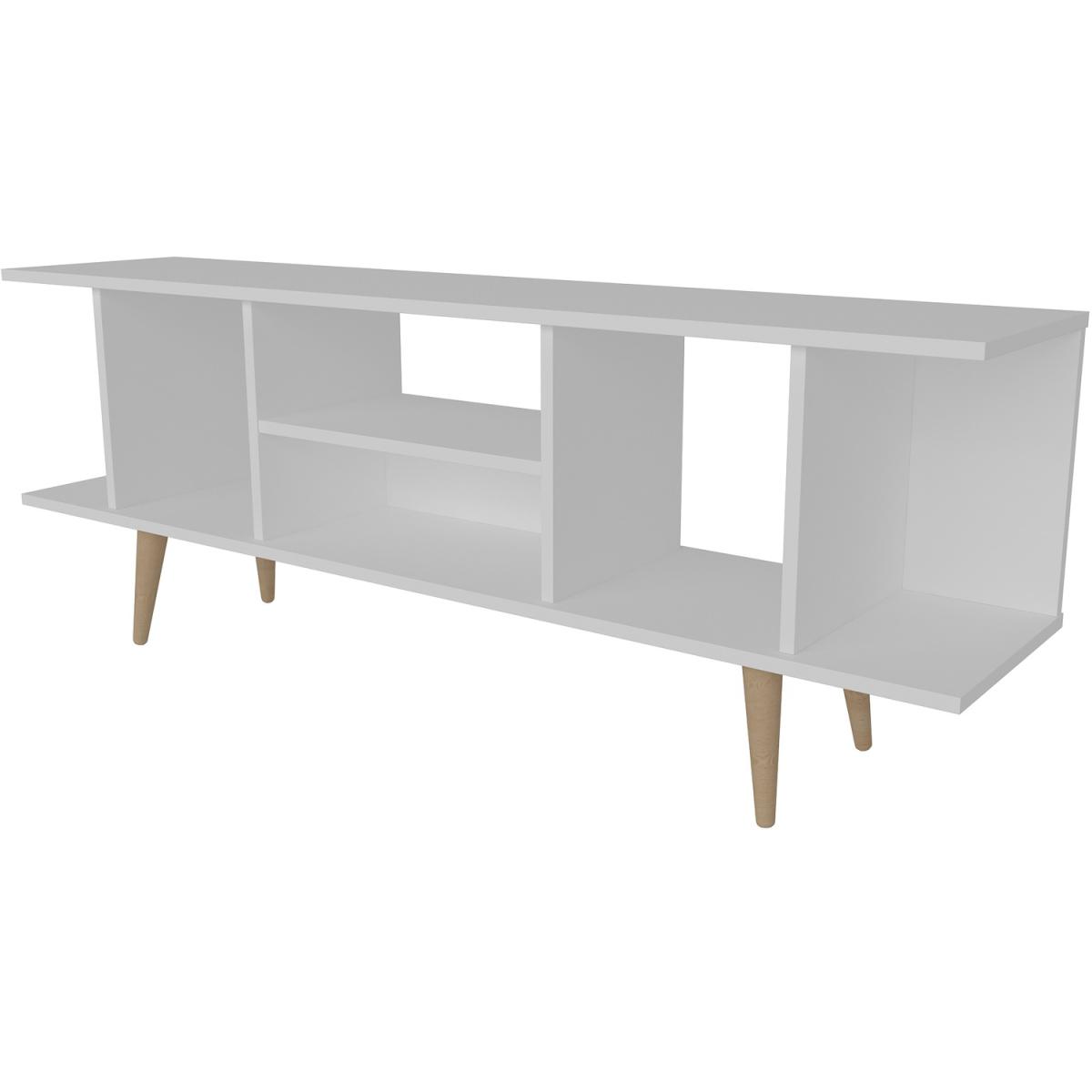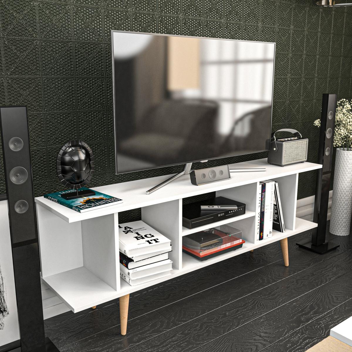 Akya 160cm wide TV stand and media console is designed for larger living rooms and can accommodate TVs u to 72". The media stand provides a lot of space for storage with its open shelves. The TV cabinet has 5 solid wood legs. It is made of an 18mm thick standard quality melamine coated particle board and banded with PVC edge banding tape. It is manufactured using eco-friendly and health-friendly TSE certified materials.