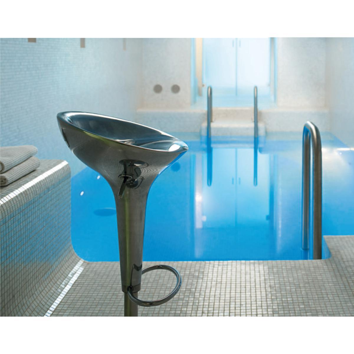 A new version very design of famous Bombo Stool. The seat is in polished die-cast aluminium, the base and the frame are in stainless steel. A look very connected for this swivelling and adjustable stool in height, conceived for the inside as for the outside.