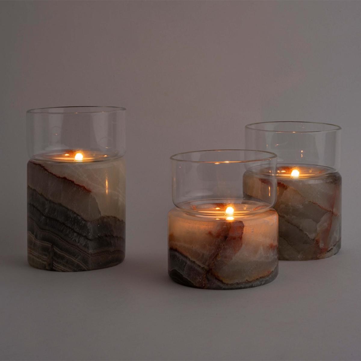 This set features three hand-carved marble candle holders, top with a clear borosilicate glass shade. This type of glass resists direct flame and thermal shock, which makes it perfect for a garden, a terrace or any interior. It includes the wax of the three candles that fit with the perfect size. Designed to conventional measurements And replacements can be obtained anywhere and at a low cost. Sanctuary candles gracefully decorate all spaces. They are ideal to complete the decoration of the house. Currently available in different colors.