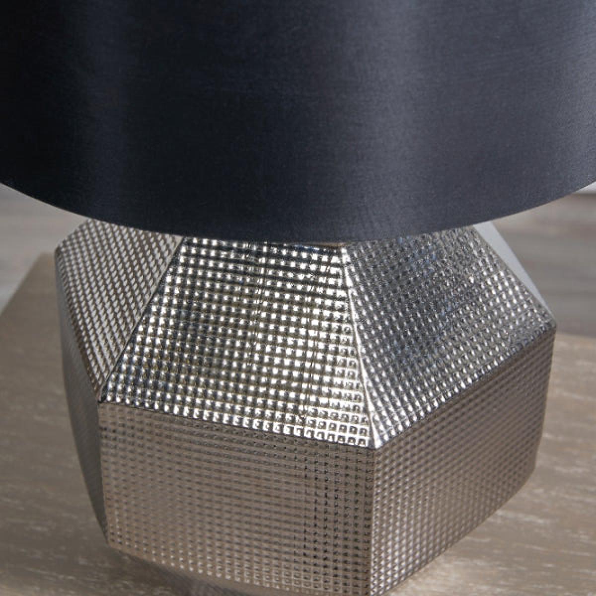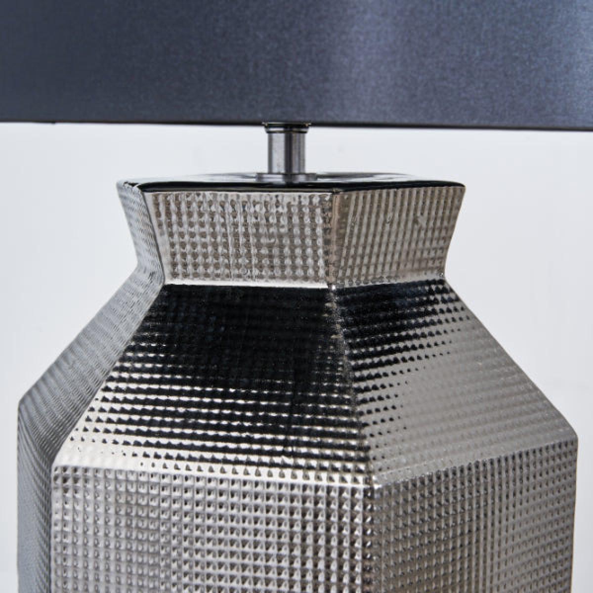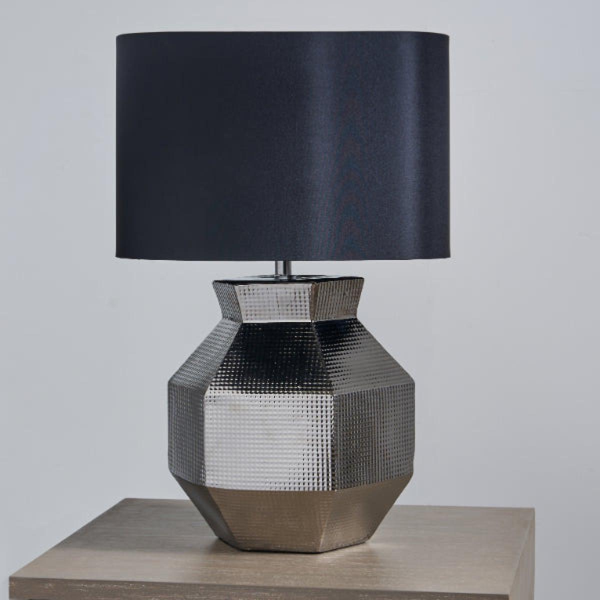 Modern silver table lamp boasting black circular shade Sleek and modern, the Alada features a silver hexagon style ceramic base with textured detailing and black cotton circular shade. The perfect table lamp to complement both traditional and modern interiors, the Alada will complete any lounge, hallway or bedroom.   Modern silver table lamp boasting black circular shade Sleek and modern, the Alada features a silver hexagon style ceramic base with textured detailing and black cotton circular shade. The perfect table lamp to complement both traditional and modern interiors, the Alada will complete any lounge, hallway or bedroom.