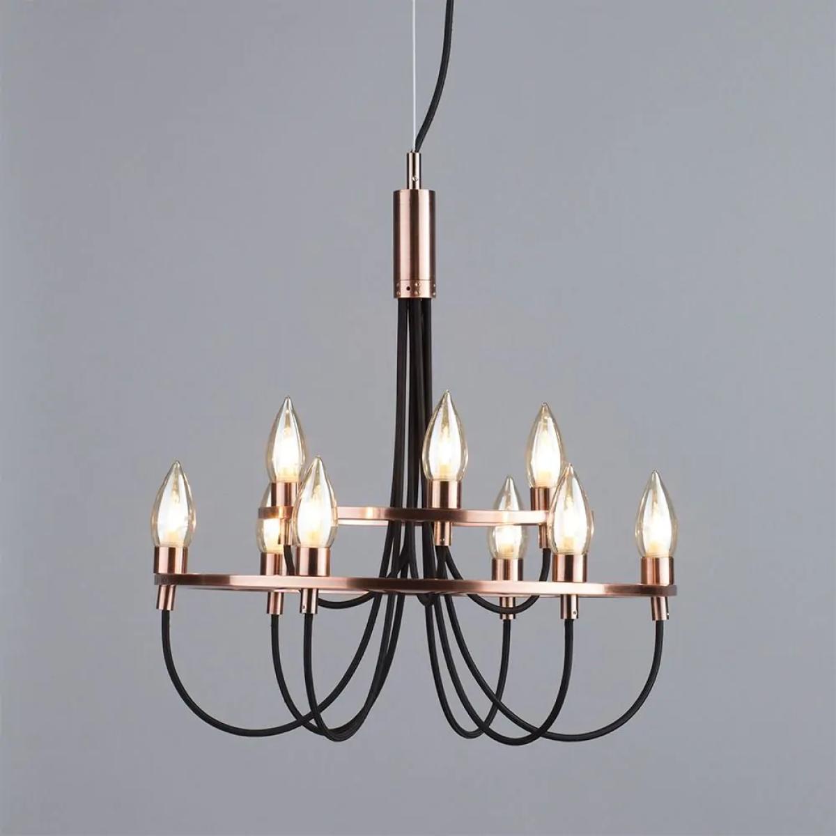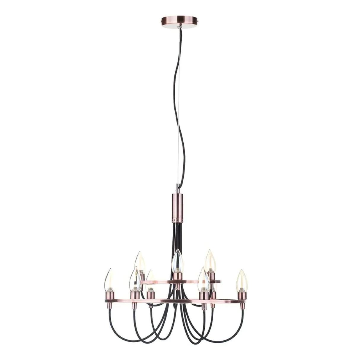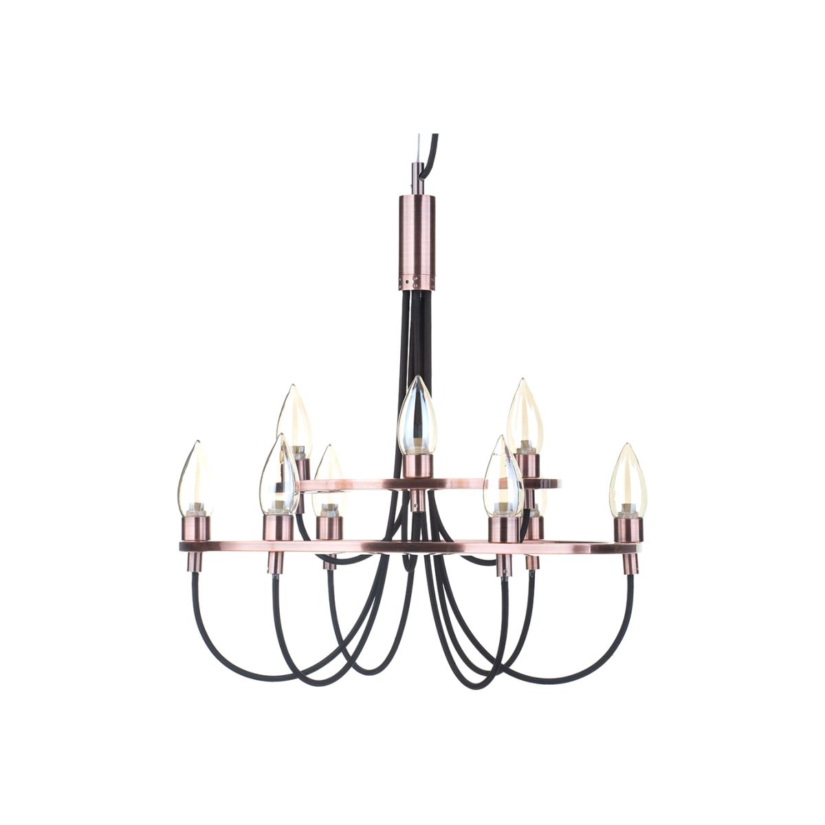 Alana is a statement chandelier with an industrial twist, bringing a fantastic urban style to your interiors with a practical spread of light thanks to the 9 light structure. With a combination of black cable and copper accents, this stunning piece is perfect for use over a dining room table or as a statement piece in the bedroom, giving a distinctive industrial theme to the space. This fitting features 9 lights in a 2 tier structure, so you’ll be sure to get a fantastic coverage of light within the interior that gives an ambient, yet still practical style of illumination to your home.