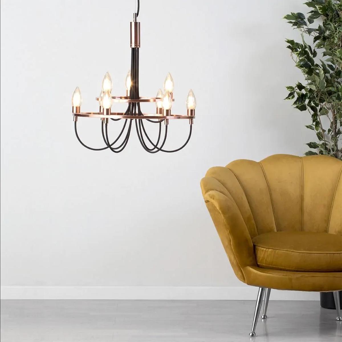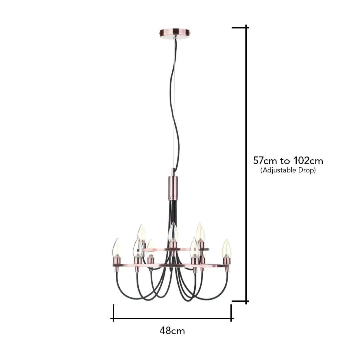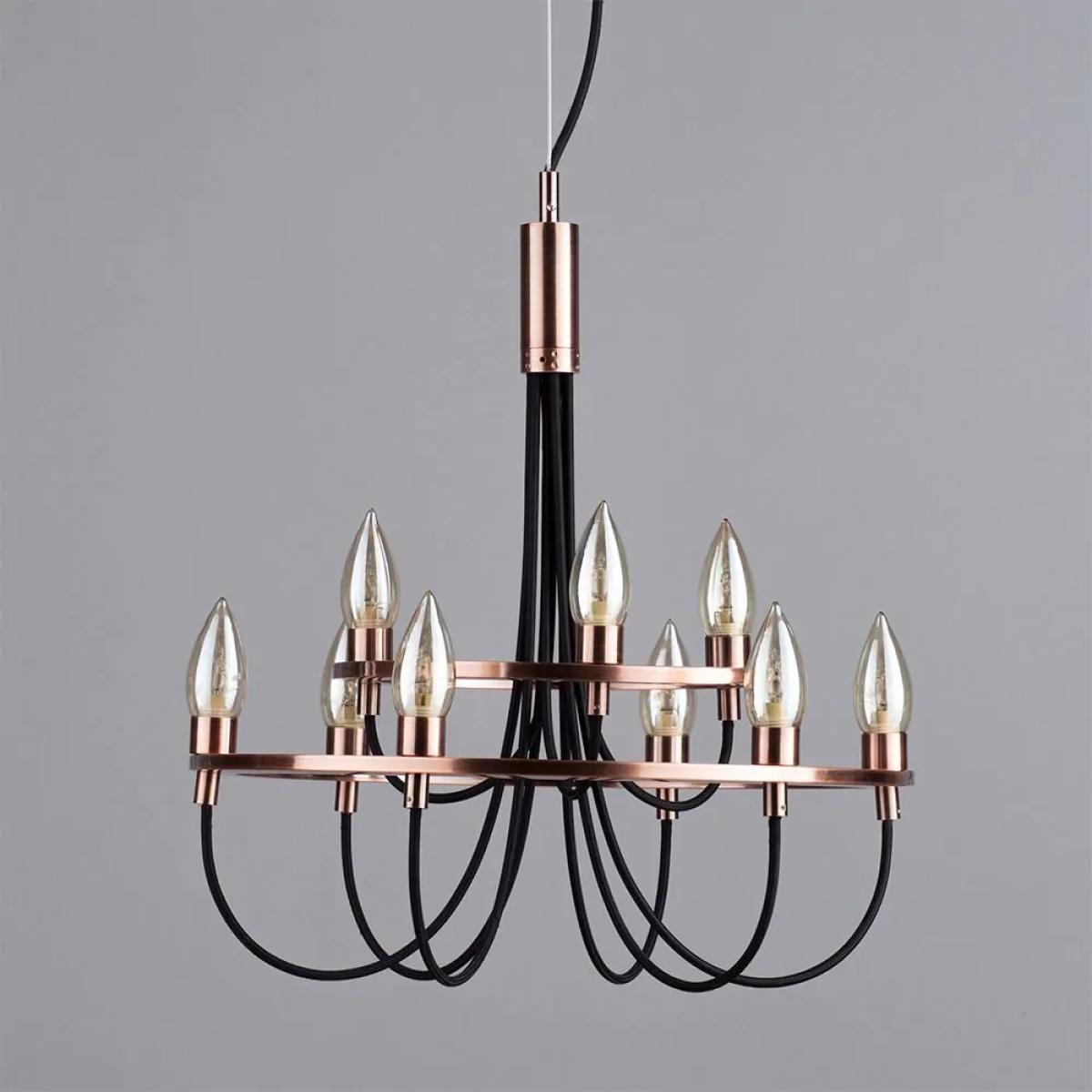 Alana is a statement chandelier with an industrial twist, bringing a fantastic urban style to your interiors with a practical spread of light thanks to the 9 light structure. With a combination of black cable and copper accents, this stunning piece is perfect for use over a dining room table or as a statement piece in the bedroom, giving a distinctive industrial theme to the space. This fitting features 9 lights in a 2 tier structure, so you’ll be sure to get a fantastic coverage of light within the interior that gives an ambient, yet still practical style of illumination to your home.