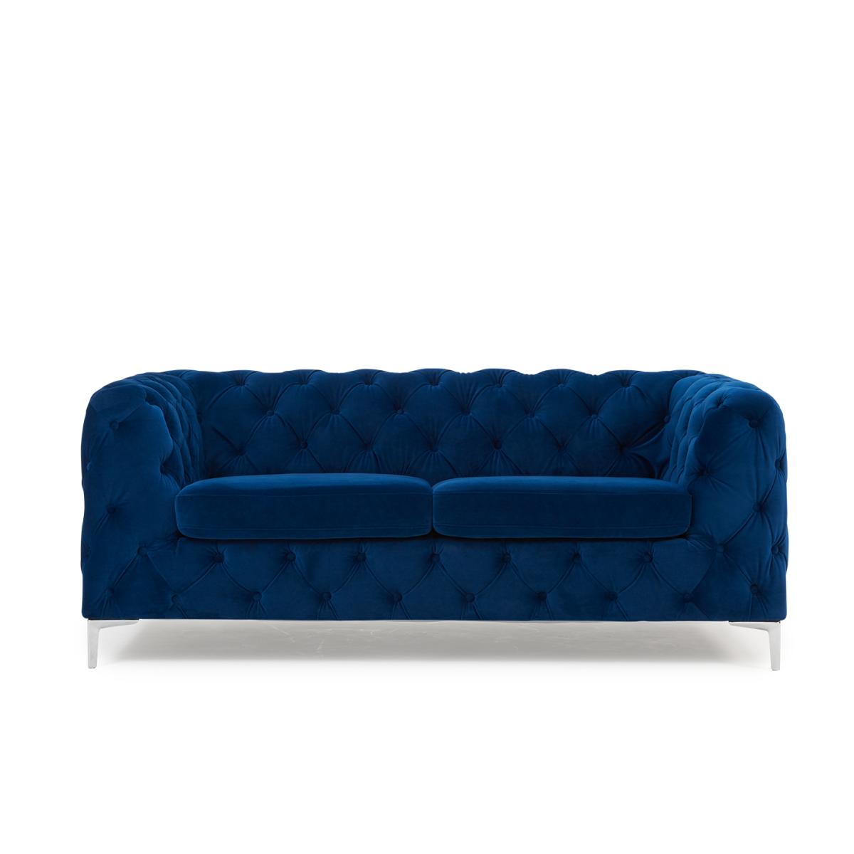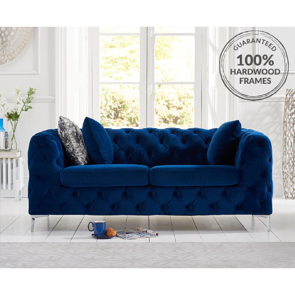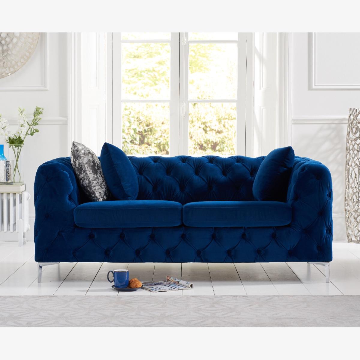 The Alara Blue Velvet 2 Seater Sofa screams luxury. With deep buttoning and cool chrome feet this sofa will suit any living room