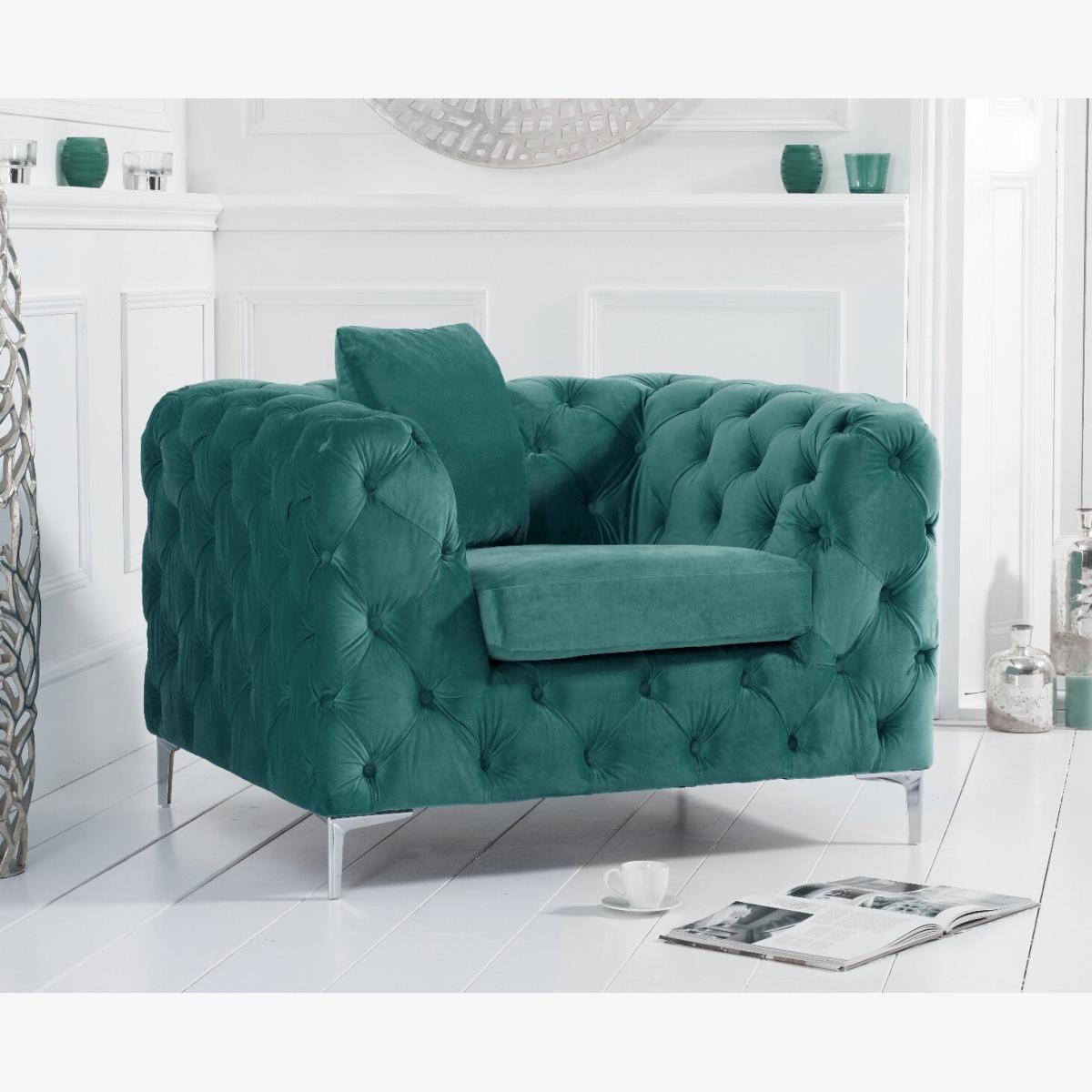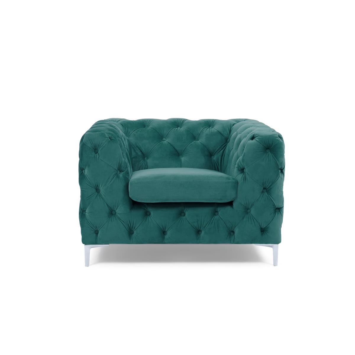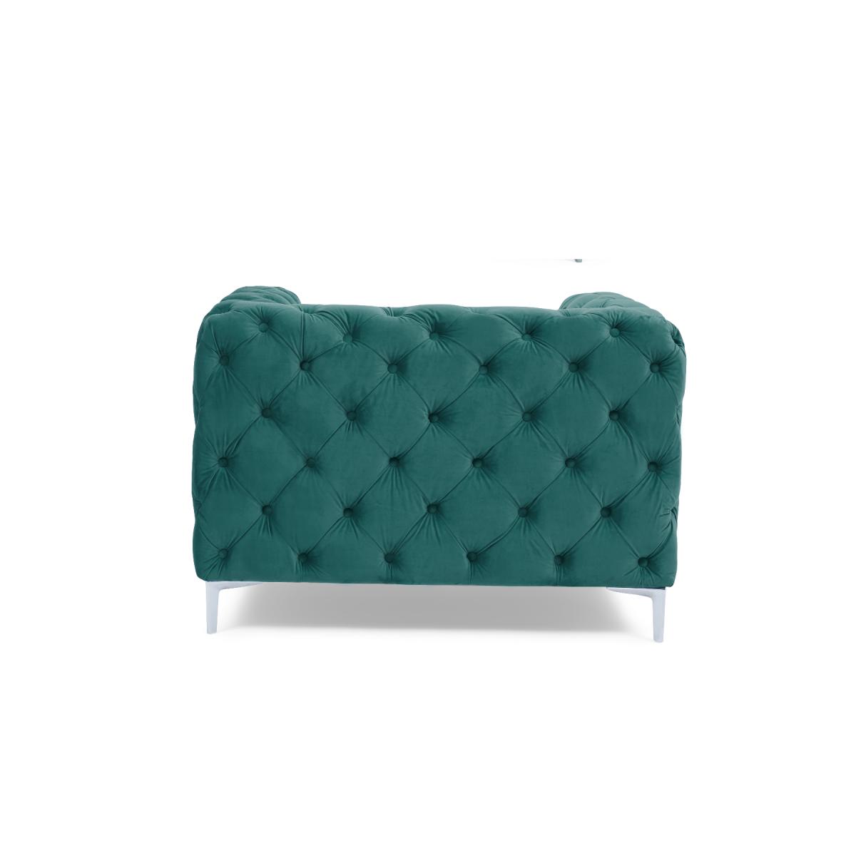 Our Alara Green Velvet Armchair completes a gorgeous living room set. Velvet upholstery and delicate tufting, this sofa is the missing piece