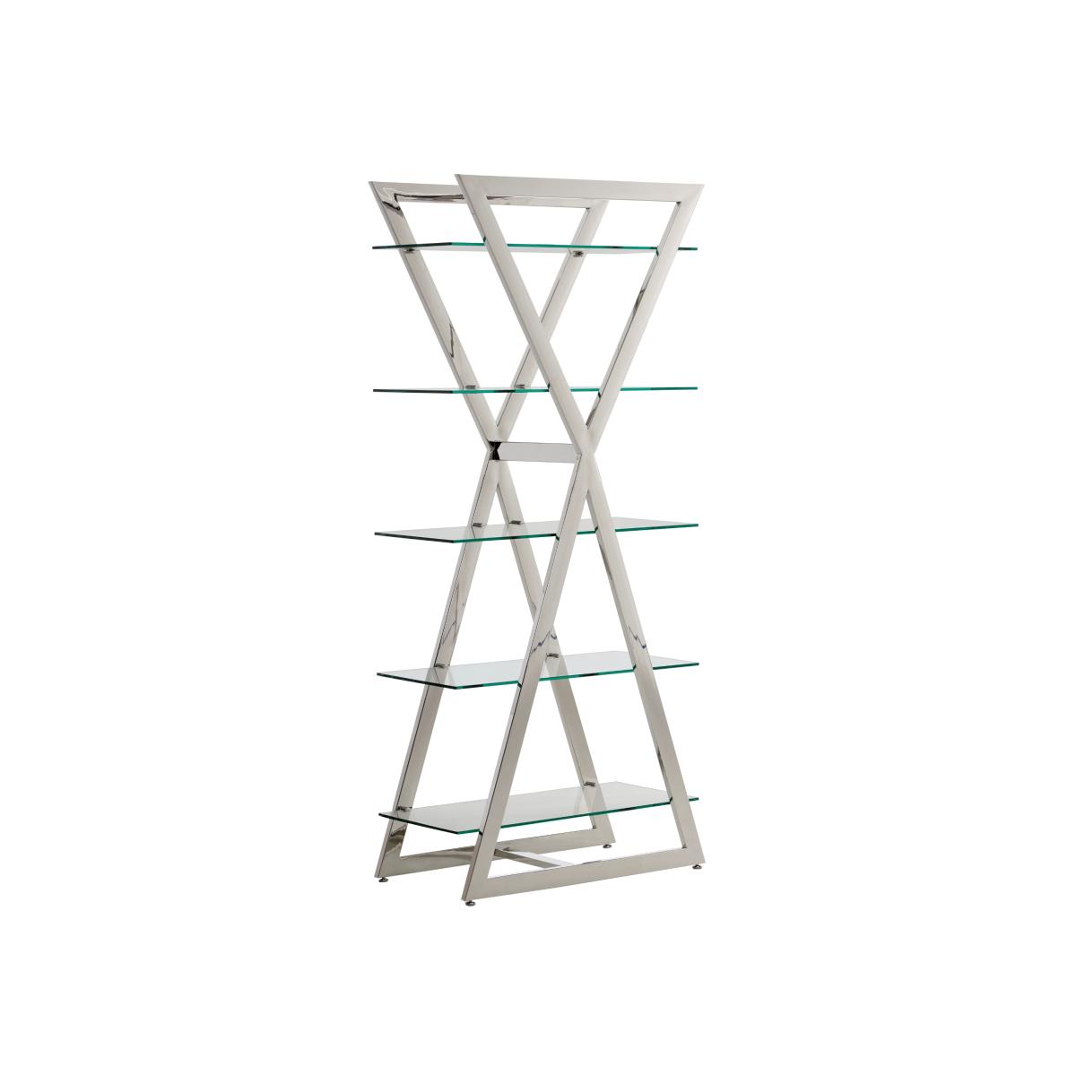 Five glass shelves appear to float in a crossed polished stainless steel frame. Why you’ll love it Ultra-modern shelf unit for the contemporary home. Makes a strong design statement. Tall, with a striking X-shaped polished steel frame. The five glass shelves appear to float in the air. Open shelves create a feeling of light and space. Plenty of room to show off your treasured possessions. What you need to know The frame is highly polished stainless steel. Toughened glass shelves. Fully assembled on delivery. Under direct light, glass surfaces may reveal the polishing process in the form of small scratches. We recommend using protective mats under any objects which could potentially scratch the glass shelves.