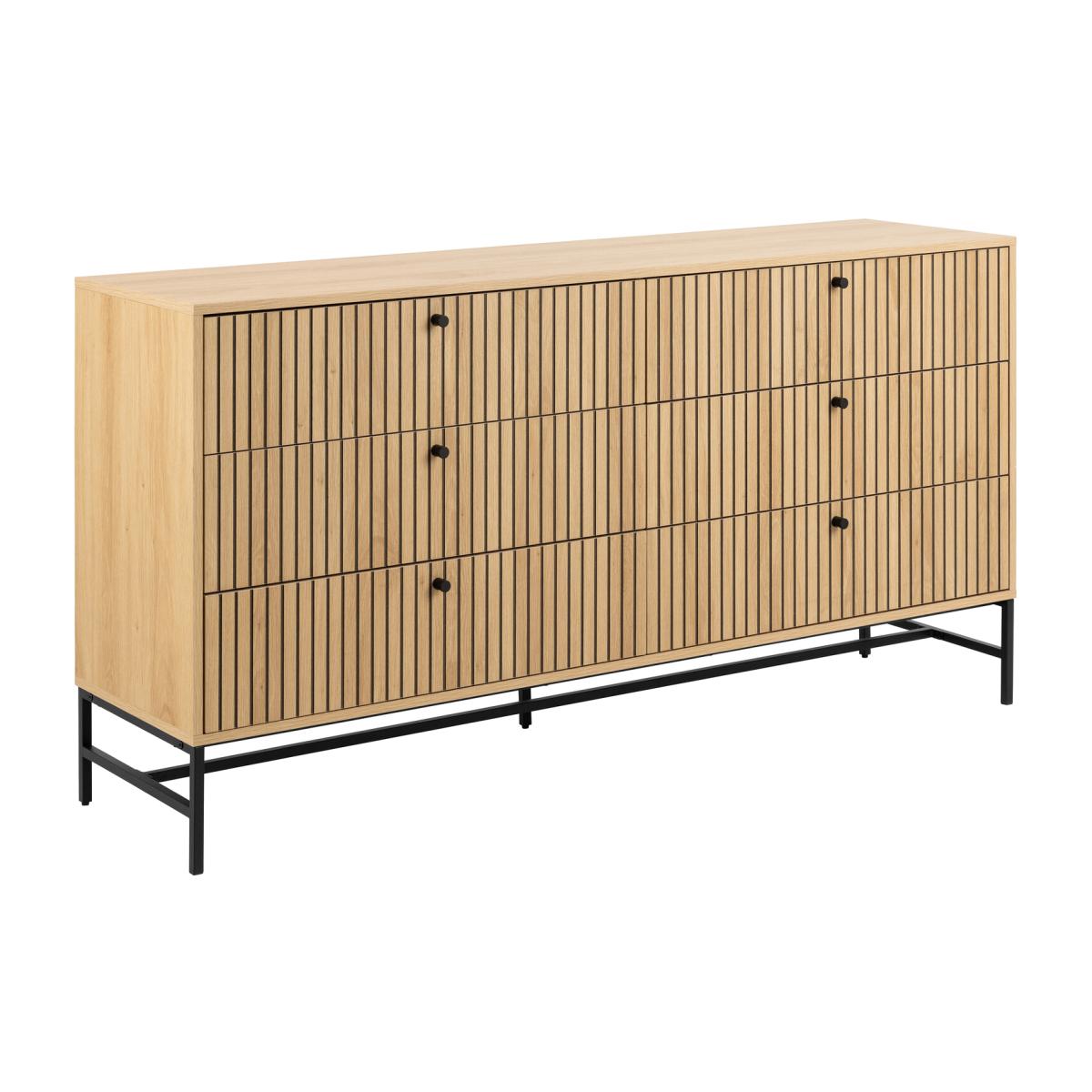 Organise your space in style with the Albany Chest of Drawers. This stunning piece of furniture blends modern design with natural charm to infuse your indoors with a contemporary touch. Featuring an oak finish and flaunting textured lamella fronts, it adds character and elegance to any room. Ideal for adding a sleek, industrial touch to your space, the storage chest is not just pretty but practical. Its sturdy melamine construction and powder-coated steel legs ensure stability with lasting use. With spacious drawers for all your essentials, this unit makes a great way to declutter your home. Pair it with other furniture items from the Albany collection to create a striking decor.
