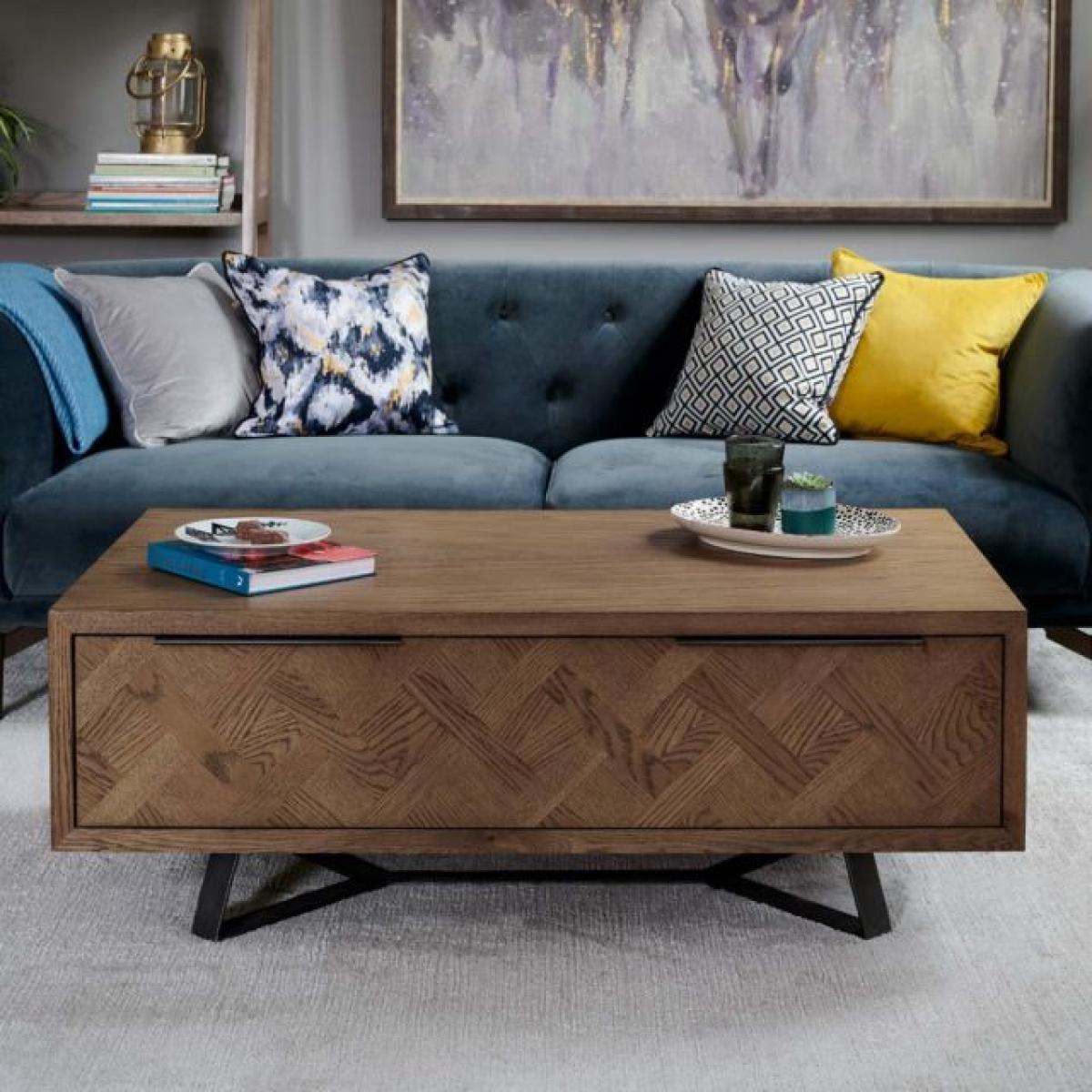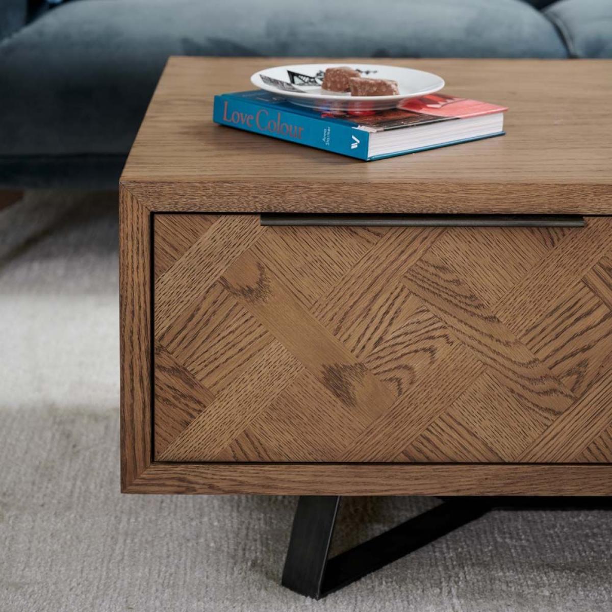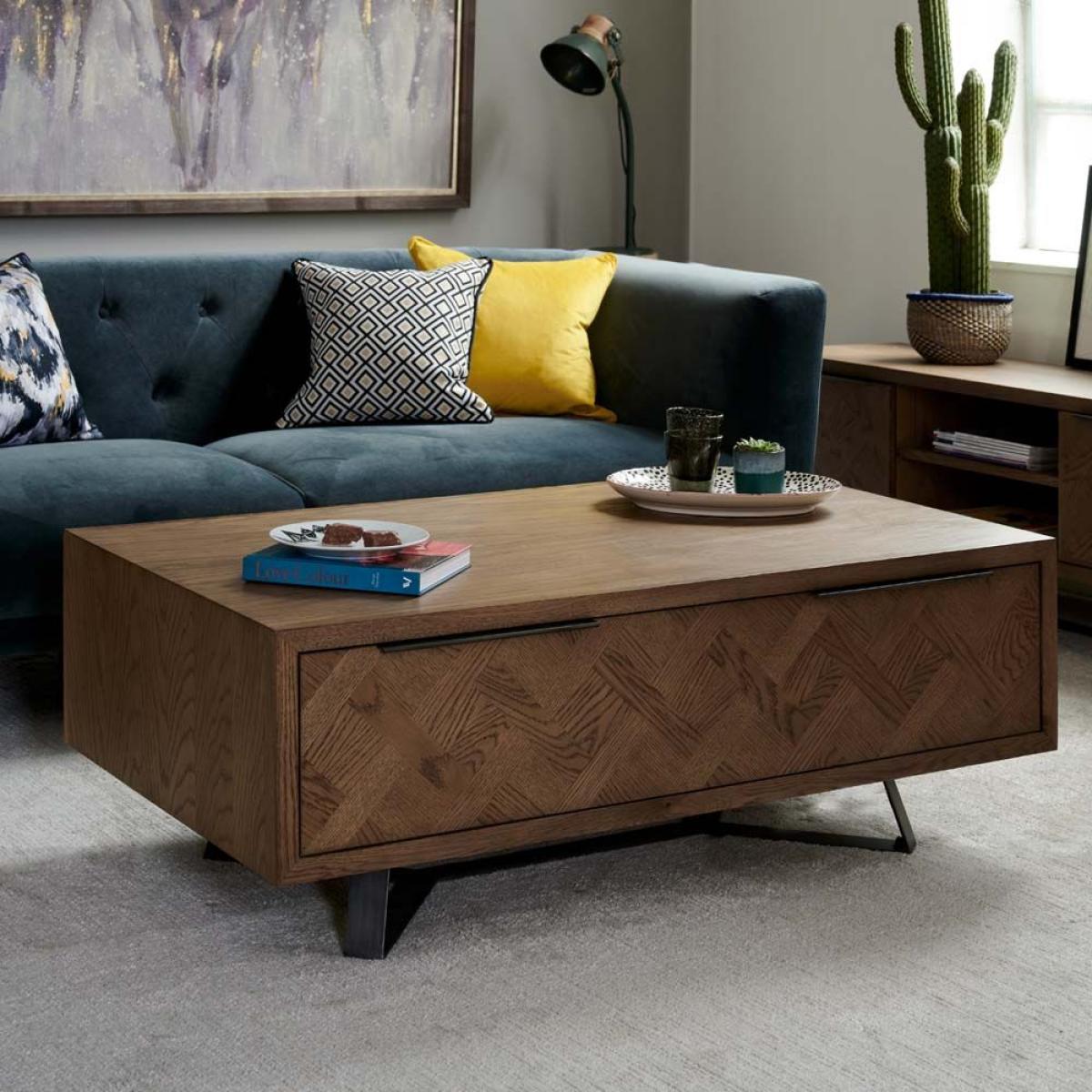 The Albany Coffee Table is part of the wonderful Albany Living amp; Dining Collection. Featuring intracate interwoven wood panelling style veneer with contrasting grains and extraordinary crafstmanship. The table features one very spacious drawer and sleek metal handles and perches on industrial style criss cross legs. Contrasting grain wood design Metal criss cross legs design. One large spacious drawer. Dimensions W120cm x D70cm x H45cm Simple self assembly