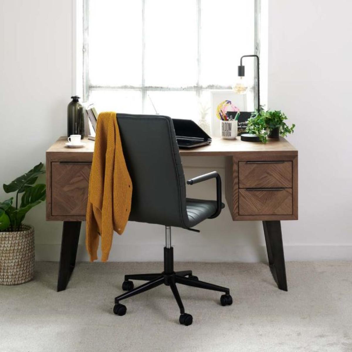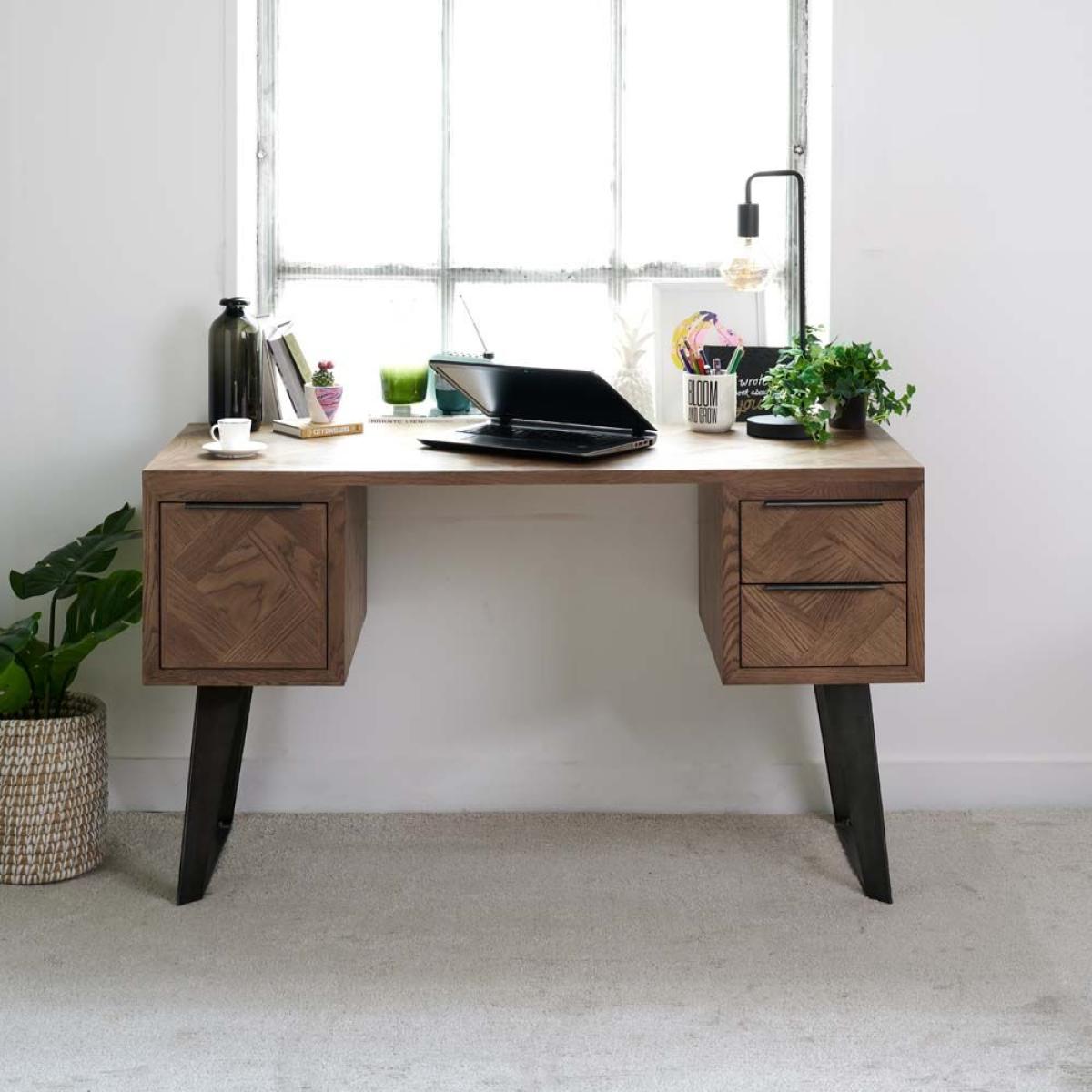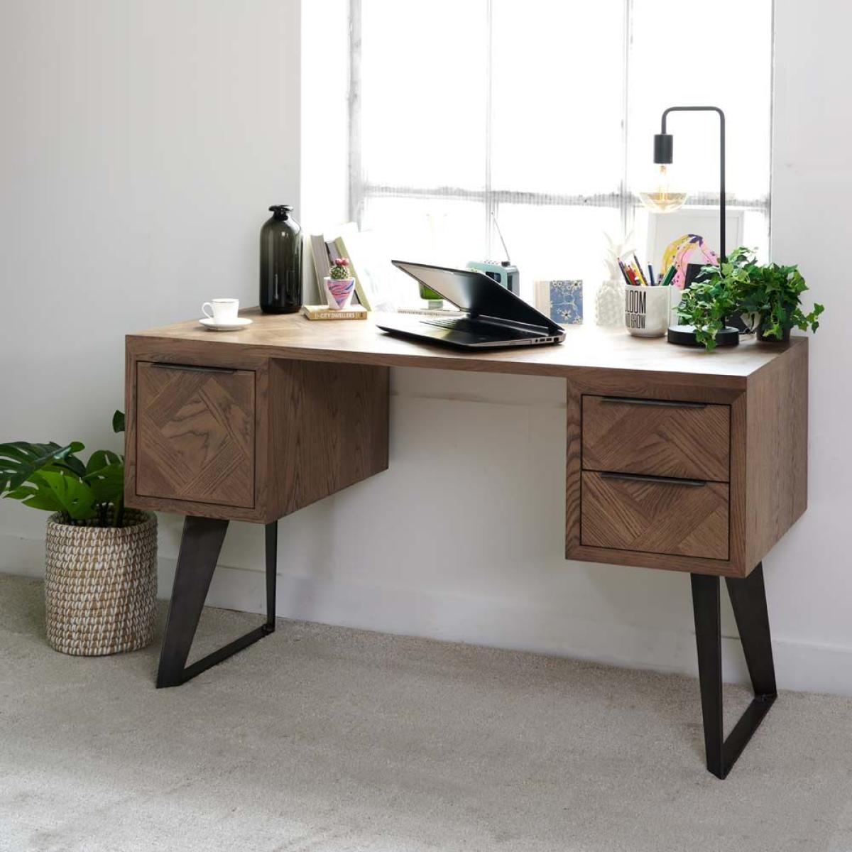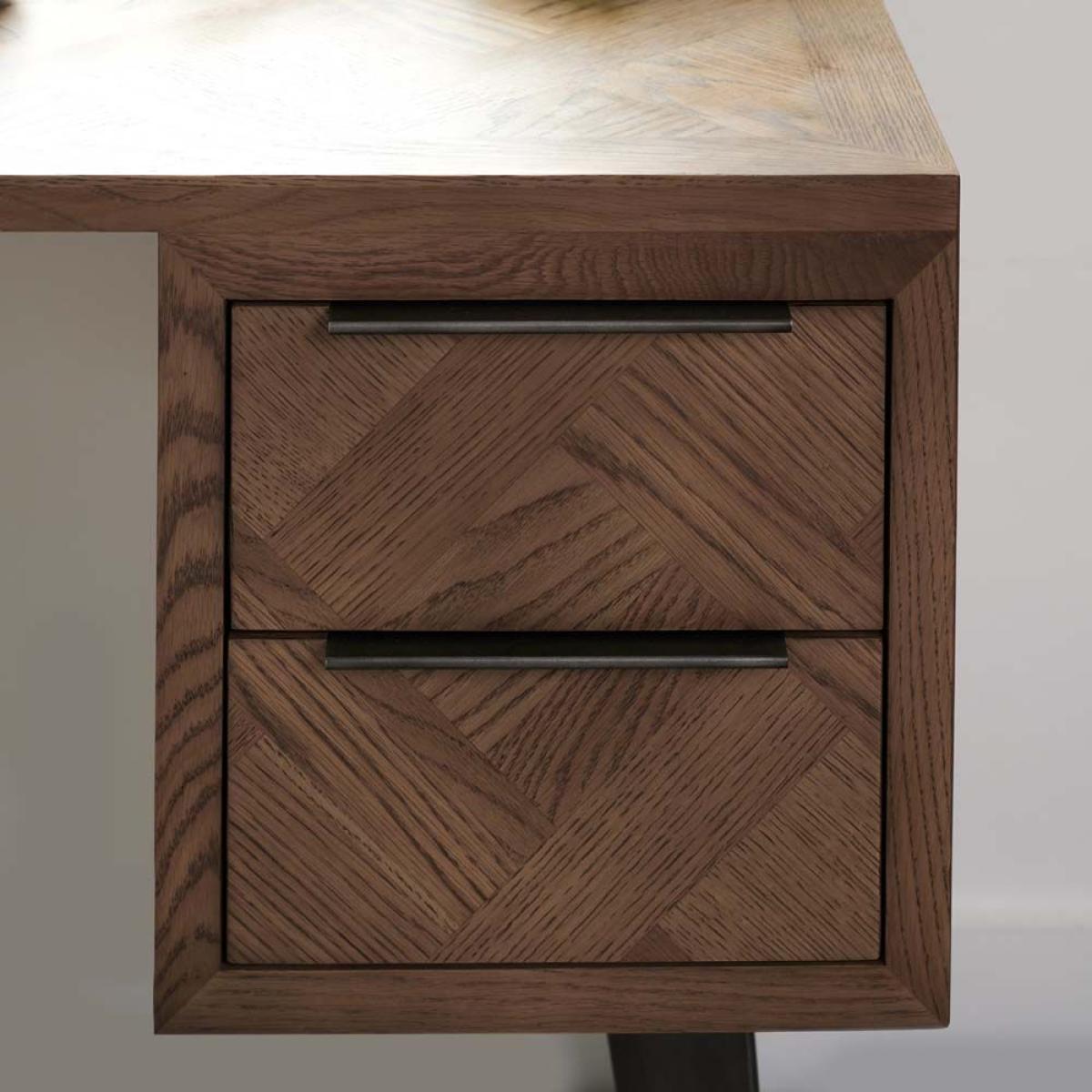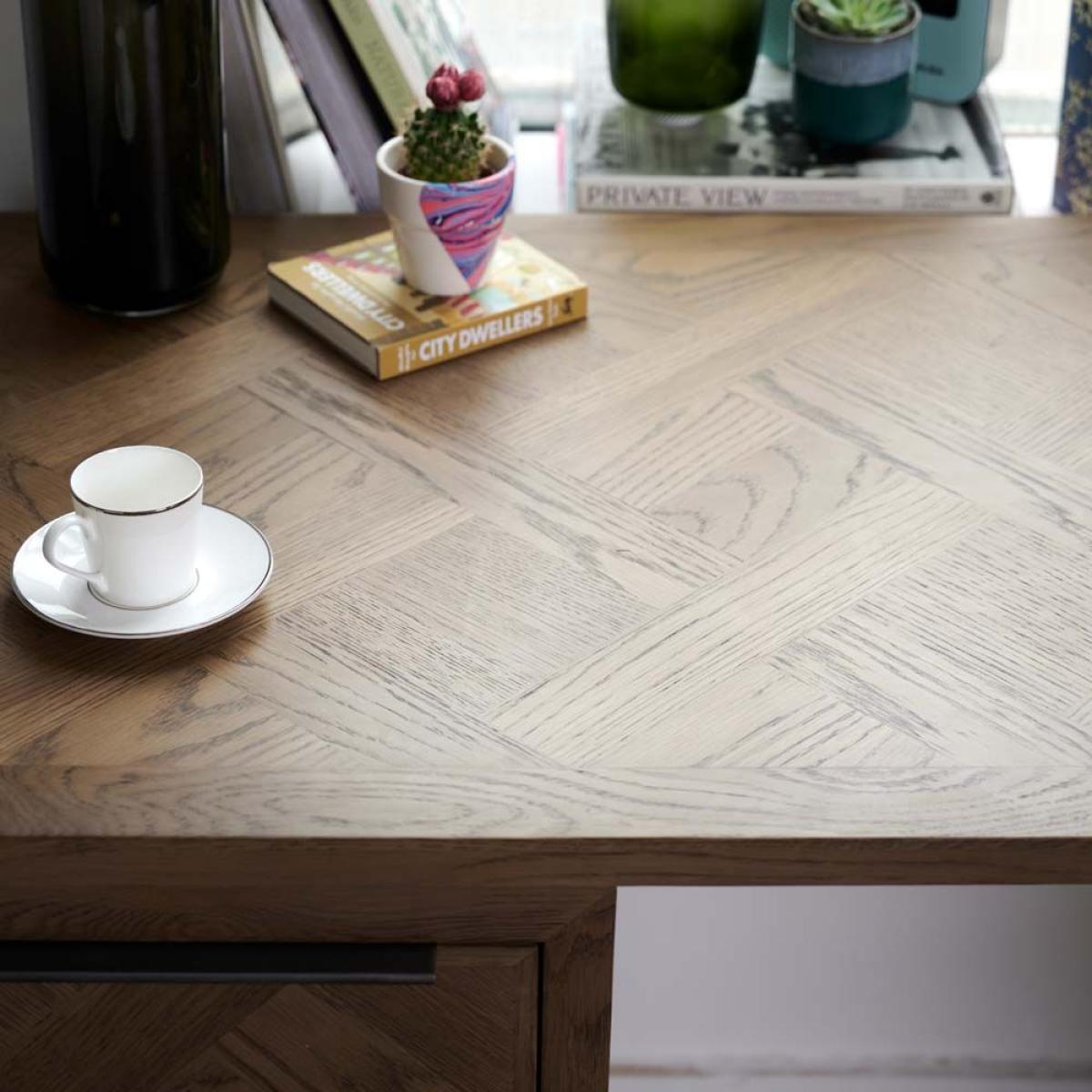 The Albany Desk is part of the Albany Living & Dining Collection. Featuring intracate interwoven wood panelling style veneer with contrasting grains and extraordinary crafstmanship. The desk benfits from one large cupboard section to the left side and two drawers on the right. Sleek metal handle details finish off this stylish addition to any home office.