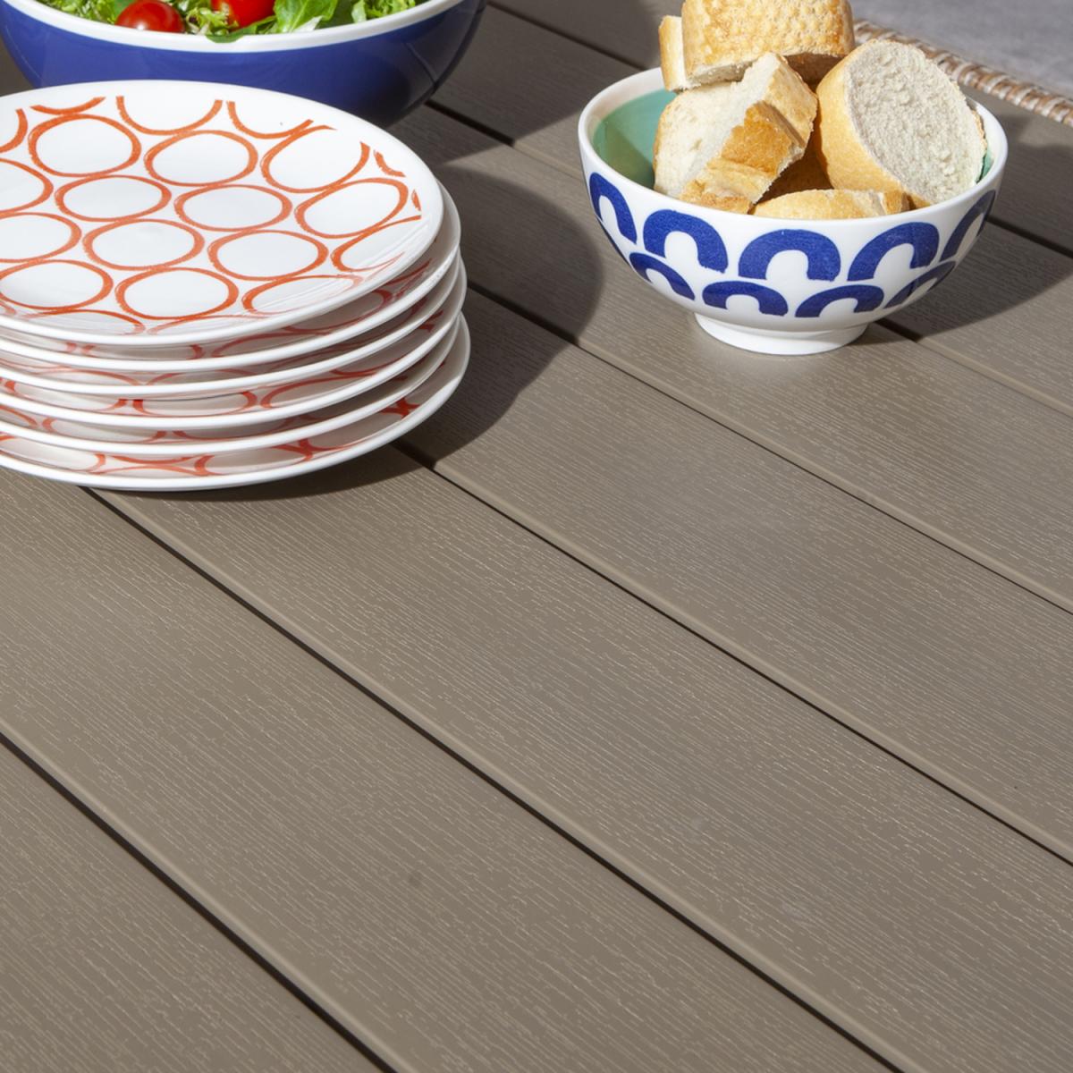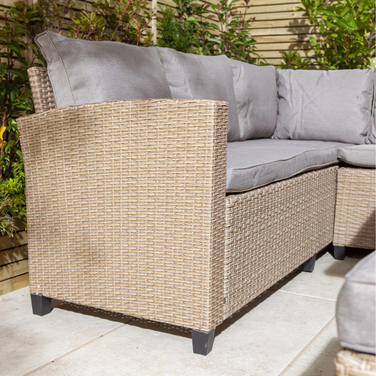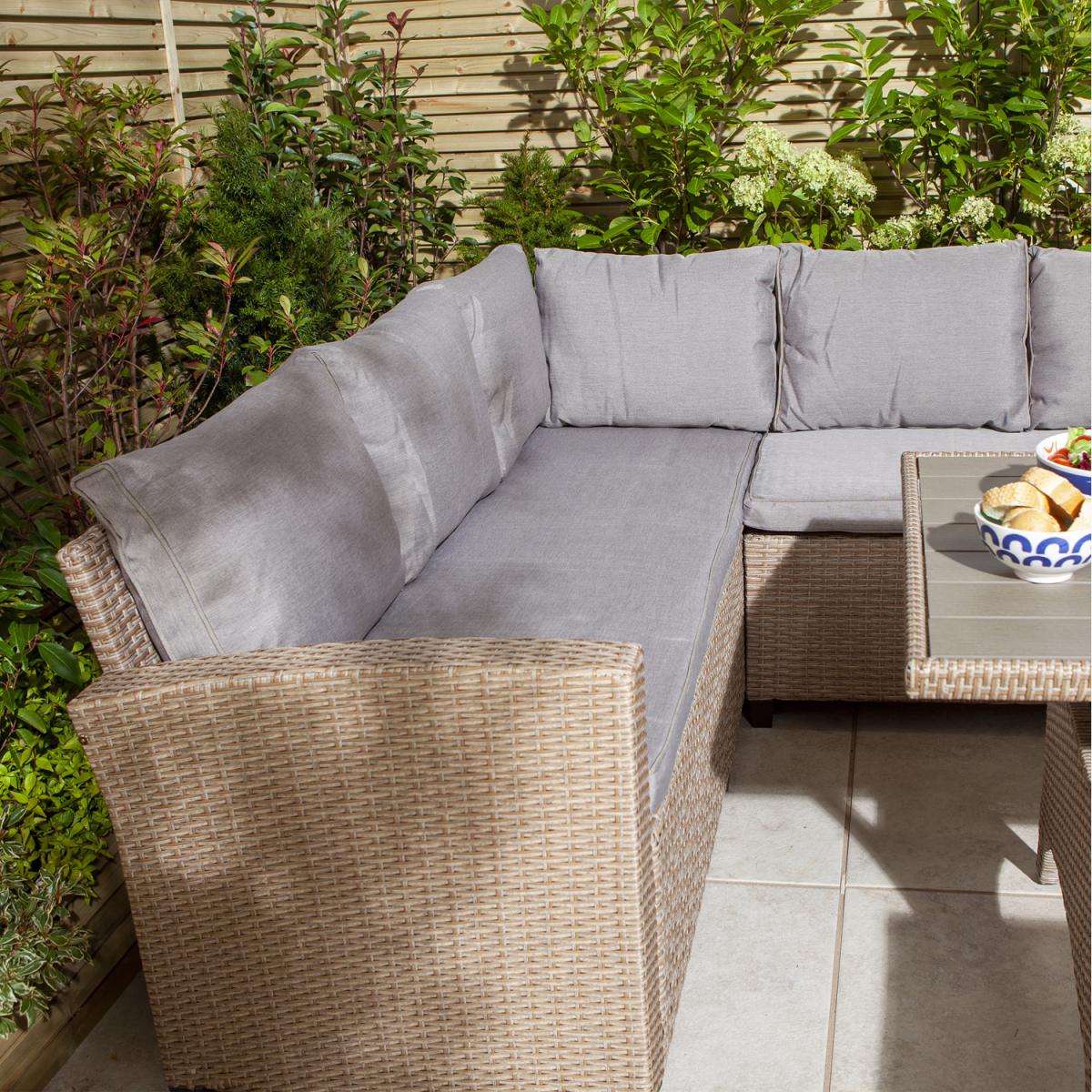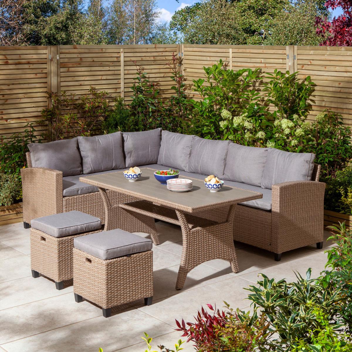 Let the 8-person dining set from Rowlinson's Albany corner sofa help you and your friends and family enjoy time together in the yard. For customers on a tight budget who don't want to forgo quality and style, this set is a fantastic option. The Fowey set is contemporary-looking and includes a cozy corner couch, a dining table, and two ottoman stools. The cushions for the couch and stools are a flattering beige color that perfectly matches the rattan's natural tone and looks at home in any style of patio or garden. You can enjoy drinks, finger foods, or even a Sunday roast in your yard while sitting at the large, sturdy table that can accommodate a variety of dishes.