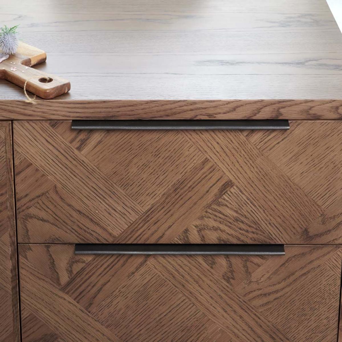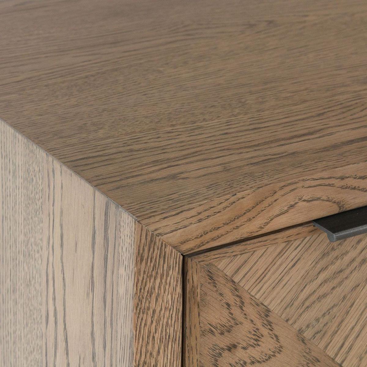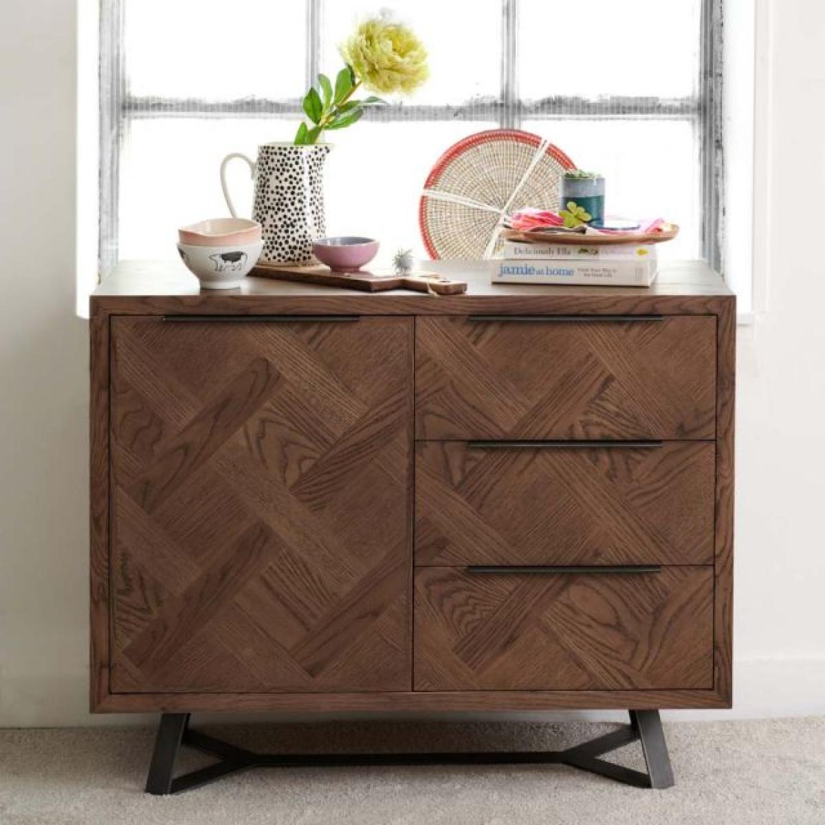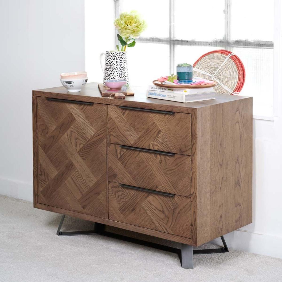 The Albany small sideboard is a more compact sideboard in comparison to the larger sideboard available in this range. A perfect storage solution for crockery and other items for dining such as table cloths bowls and napknis. It's part of the Albany Living & Dining Collection and features intracate interwoven wood panelling style veneer with contrasting grains. The sideboard sits on industrial style metal feet and features one door leading to a shelf inside, and three drawers.