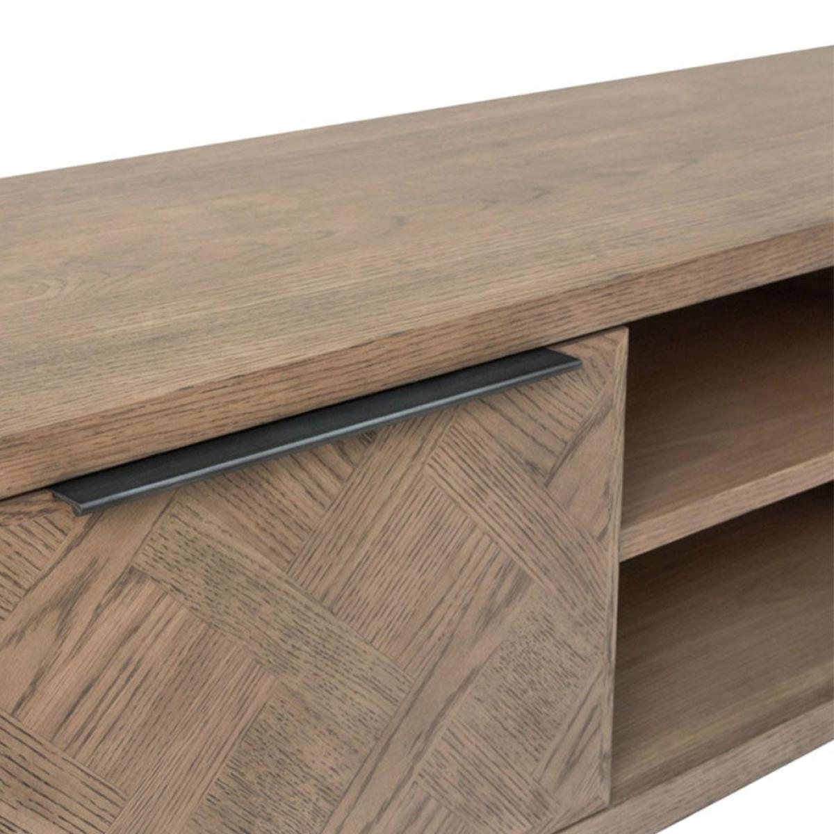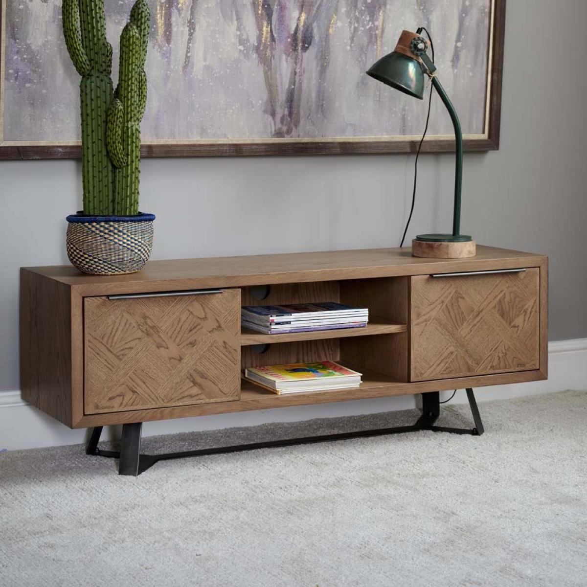 The Albany TV Cabinet is a gorgeous solution for the entertainment area of your sitting room. The TV unit features two doors topped by sleek metal handles and two shelves at the centre with holes specifically designed to feed unsightly cables through. The TV unit is part of the Albany Living amp; Dining Collection and features intracate interwoven wood panelling style veneer with contrasting grains. The unit sits on industrial style metal feet. Contrasting grain wood design Metal industrial style feet. Two doors and two central shelves. Dimensions W140cm x D40cm x H50cm Simple self assembly