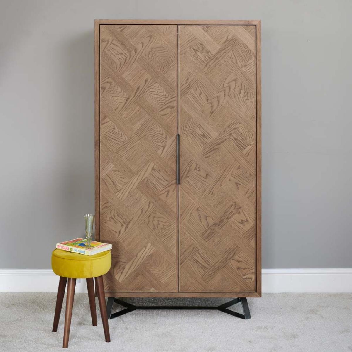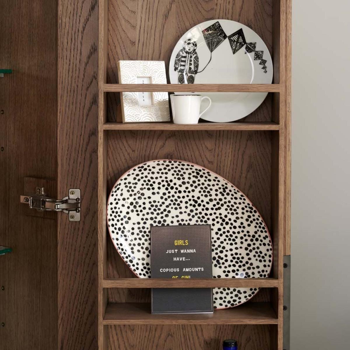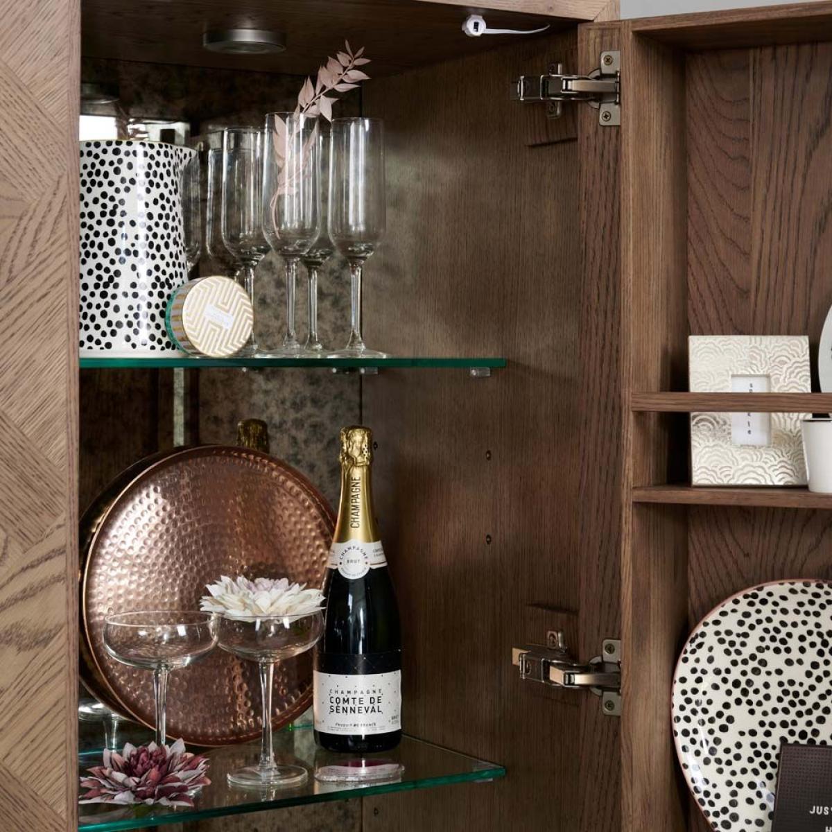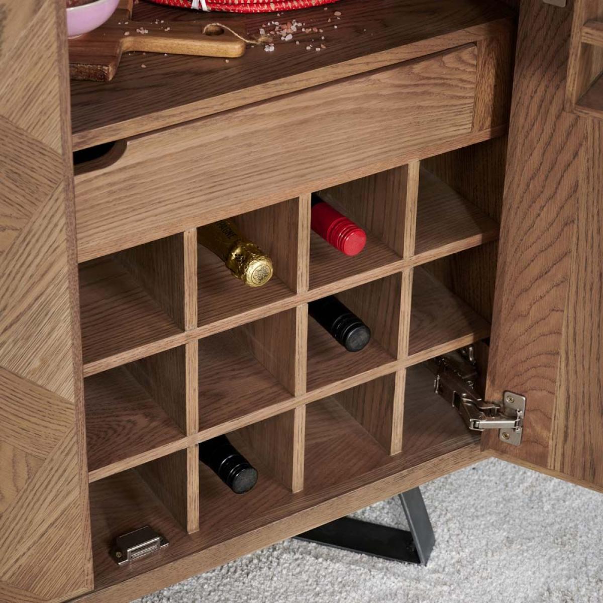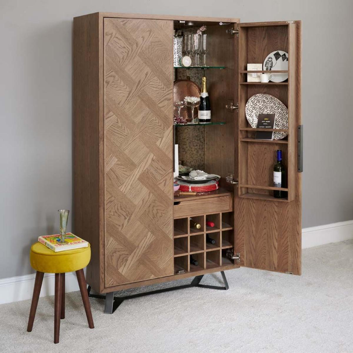 The Albany Wine Cabinet is a full on drinks showcase. A real statement piece, this cabinet opens to reveal a mirrored back and two glass shelves. Each door contains three shelves with wooden barriers to protect your glassware from falling. Below the main section, there is a drawer that sits on top of a genrous wine rack. To top off this incredible piece, the whole interior is fitted with two spot lights that shroud the interior in light. The cabinet is part of the Albany Living & Dining Collection and features intracate interwoven wood panelling style veneer with contrasting grains. The cabinet sits on industrial style metal feet.