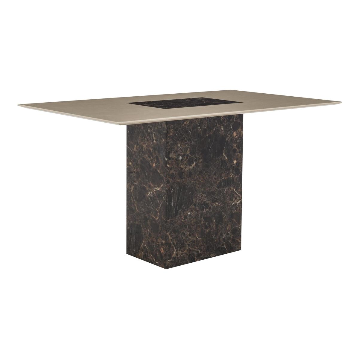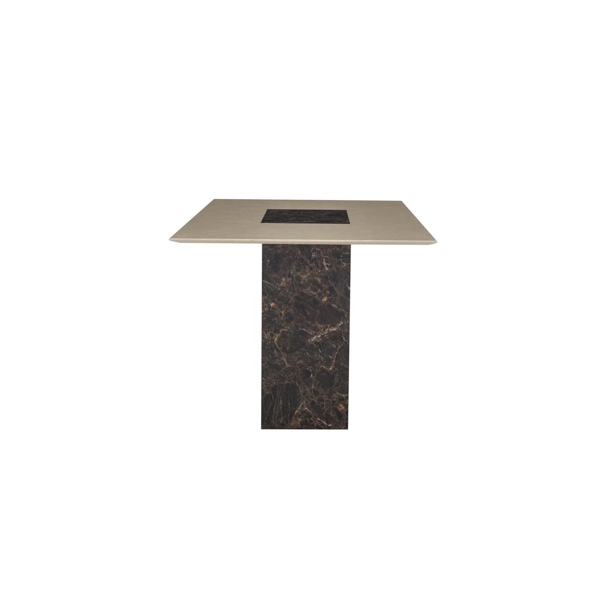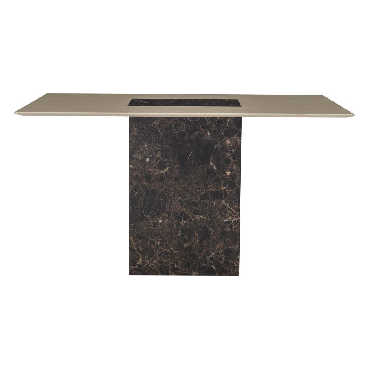 Want to make a very stylish impact in your dining room? Few pieces of furniture are quite as striking as a marble dining table. The Albarino dining table is a beauty both in design and finish, and its compact design means it’s perfect for smaller rooms. Made from white quartz marble topped with a precisely rendered marble-effect finish, this is an extremely substantial dining table that makes good use of marble’s natural durability. The gorgeous two-tone patterning is finished with a hand-poured high-gloss lacquer which gives it a fabulous marble shine and it’s also very easy to keep clean. The pedestal base and inlaid section of the table top have a stunning dark emperador marble finish in distinctive brown and gold, while the rest of the table top features a cool, classic white marble finish. While it’s compact, the table seats 6 comfortably, and the pedestal base of this large dining table allows for plenty of leg room. Exclusively available at Furniture Village, the Albarino dining table is part of the Albarino collection. Top tip: To clean, wipe any spills with a damp cloth and then dry using a soft duster. Avoid using abrasive cleaners as these may scratch the surface.