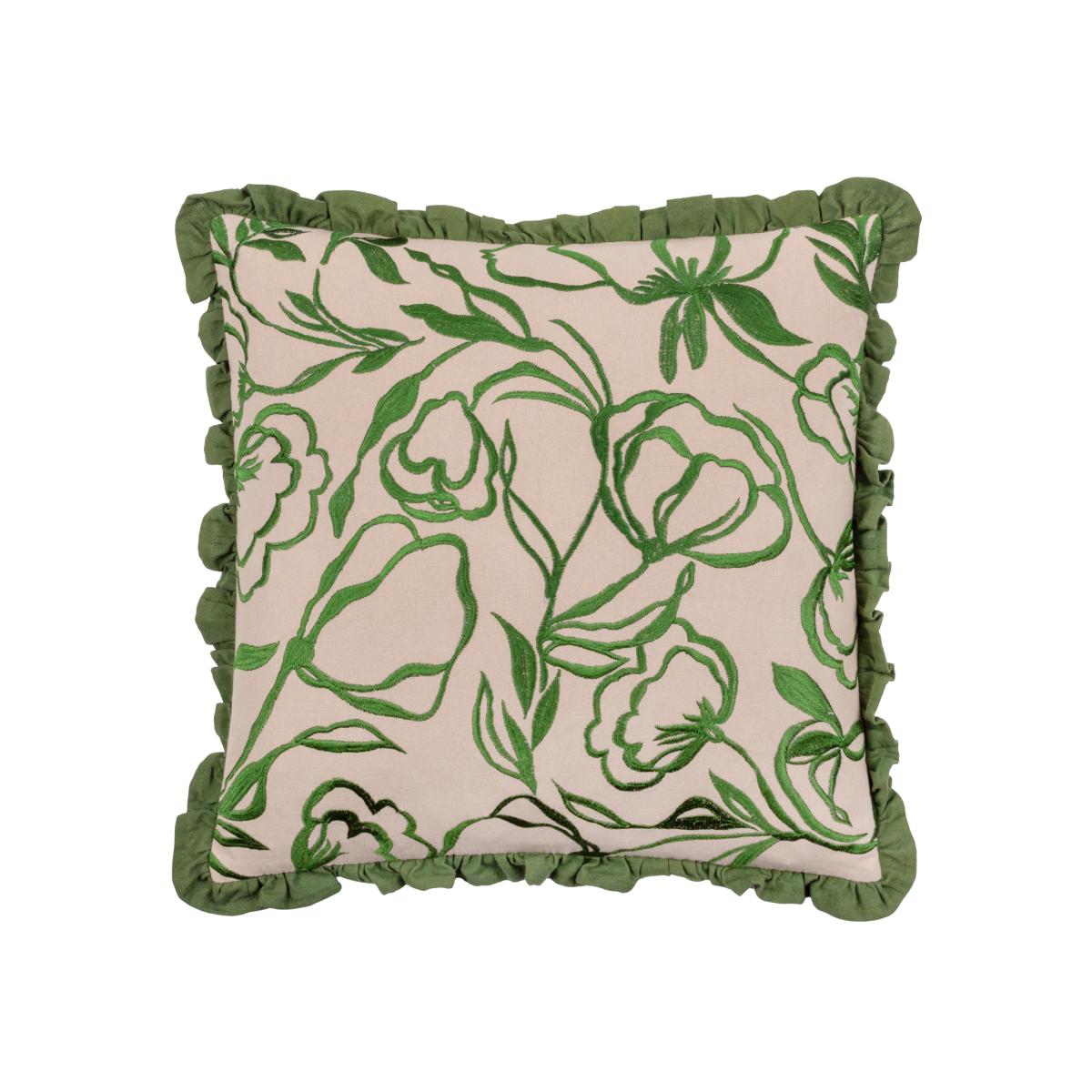 Albera Floral Embroidered Cushion - Linen/Green / 80 Feather 20 Polyester / 80 Polyester 20 Feather
