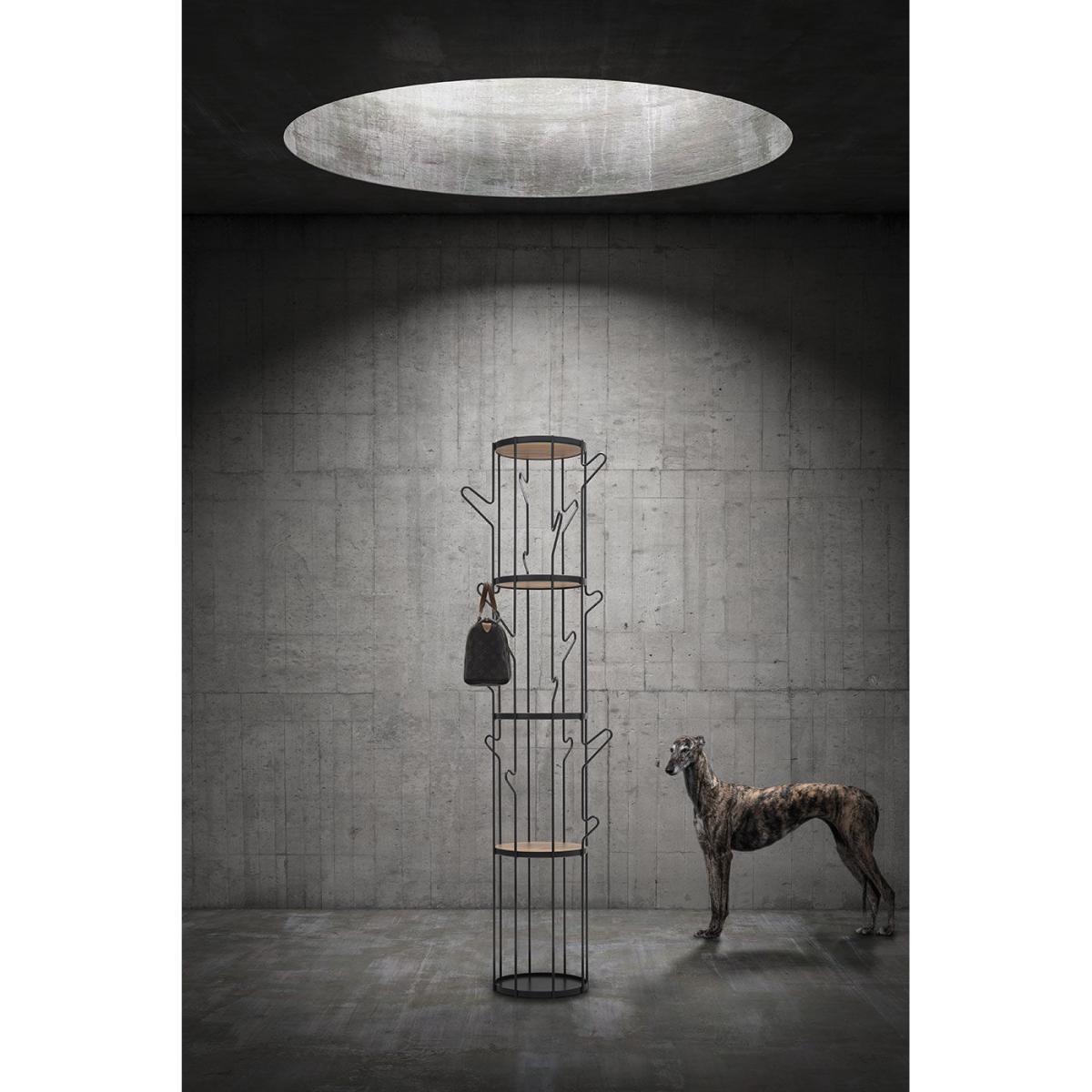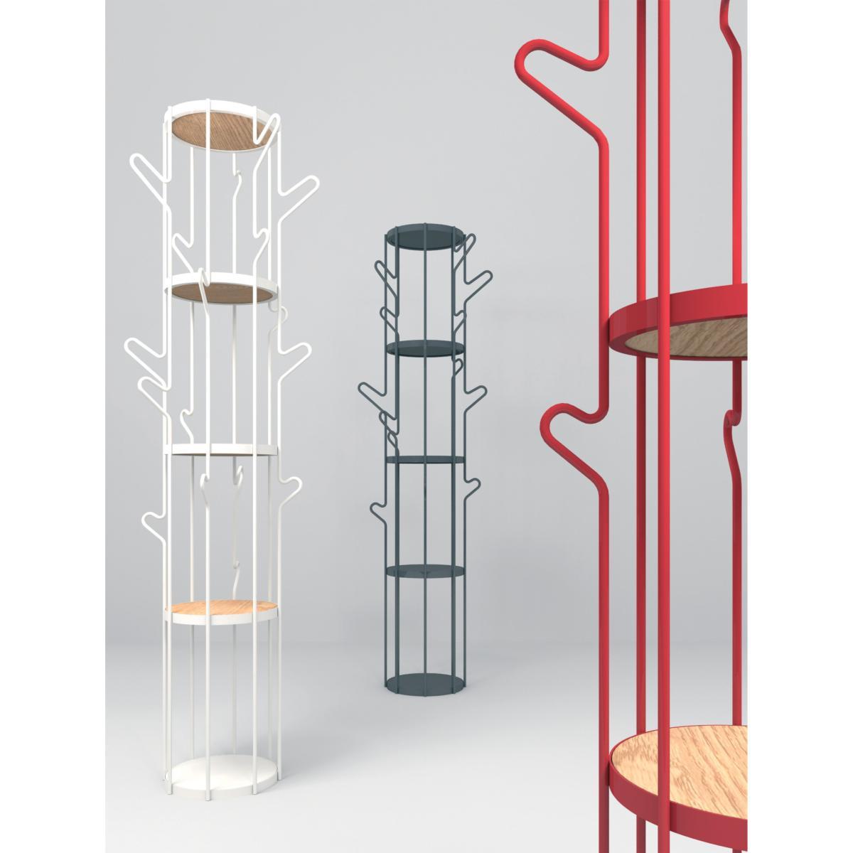 Plant inspiration for this 2-in-1 piece of furniture, both a shelf and a coat rack. Functional and elegant, Albero takes on the stylised silhouette of a tree. The sleek metal structure surrounds four round wooden shelves that provide a refined setting to show off your most treasured objects, handbags, jewellery or plants. In a bathroom, Albero holds all your beauty products, jewellery. In an entrance, you can put your keys and glasses there. Its numerous branch-shaped hooks can hold coats, bags or towels. Albero provides a centrepiece for your decoration.