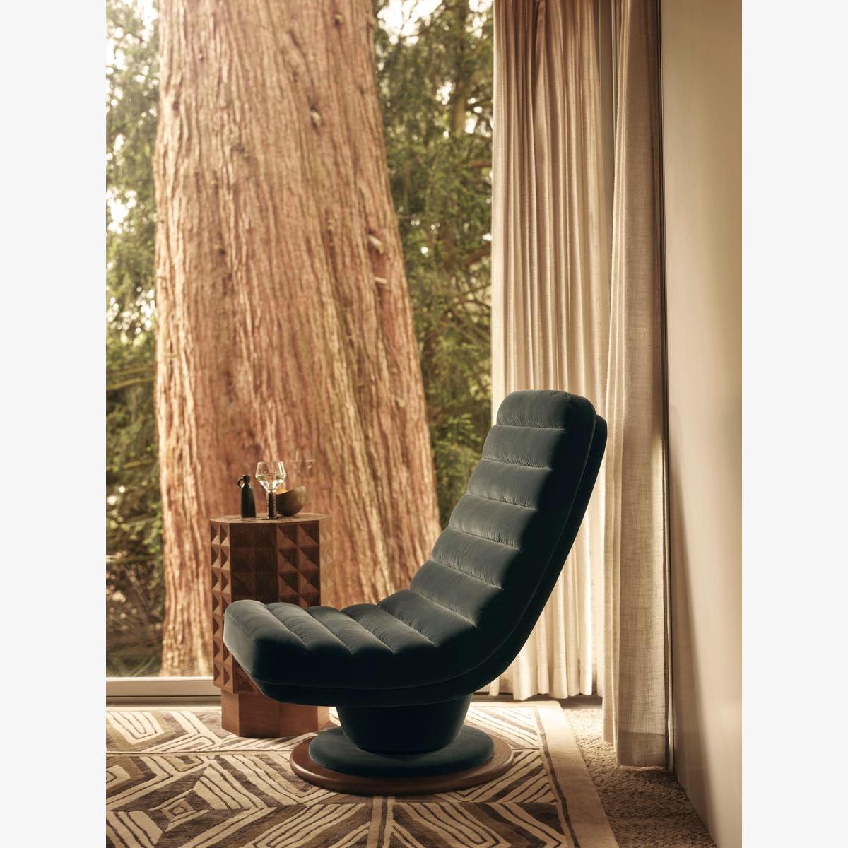 Distinguished by a tall, laid-back profile fully upholstered in velvet. Inspired by the seating styles of 180 House, the Albert armchair is fully upholstered in a deep, grey-blue velvet. Softened by a curved edge, its solid oak base swivels 360 degrees for multiple viewpoints around the room.
