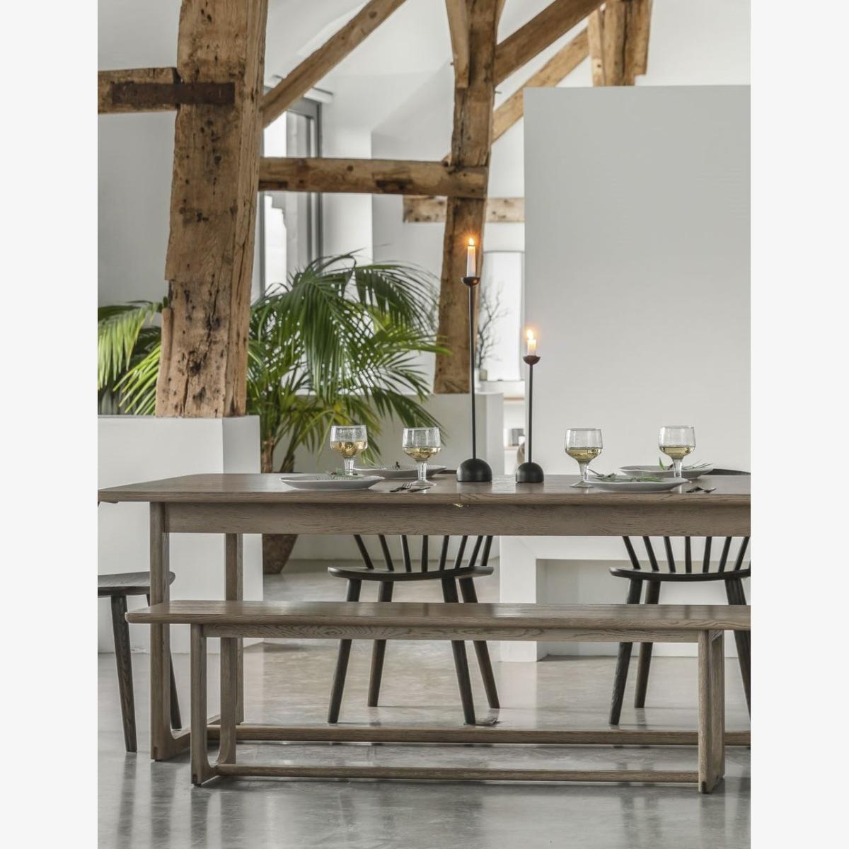 Crafted from the finest oak and structural oak veneers where practical, this stunning extending dining table pairs perfectly with the matching dining bench or chairs. The table, which extends for added practicality, offers elegant design, with its simple top and beautifully shaped underframe. The wood has a smoked oak finish. The table is also available in a natural finish, and matching pieces are available. The Albie range brings beautiful minimalism to your dining room.
