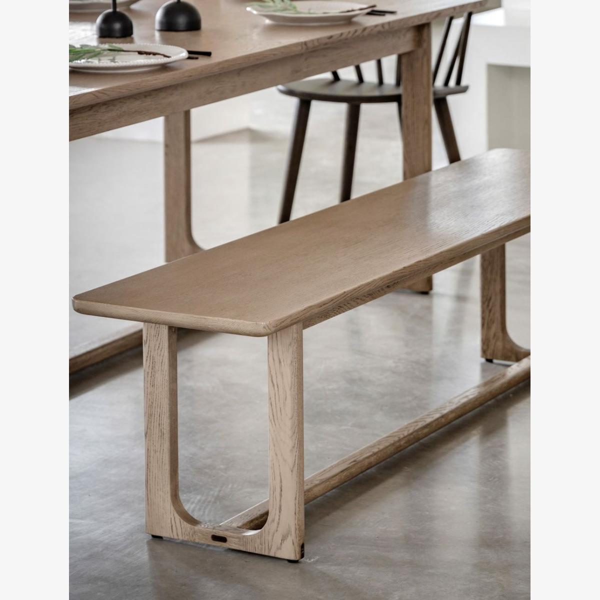Crafted from the finest oak and structural oak veneers where practical, this stunning dining bench pairs perfectly with the matching dining tables. The bench offers elegant design, with its simple top and beautifully shaped underframe. The wood has a lovely smoked oak finish. The bench is also available in a natural finish, and matching pieces are available. The Albie range brings beautiful minimalism to your dining room.
