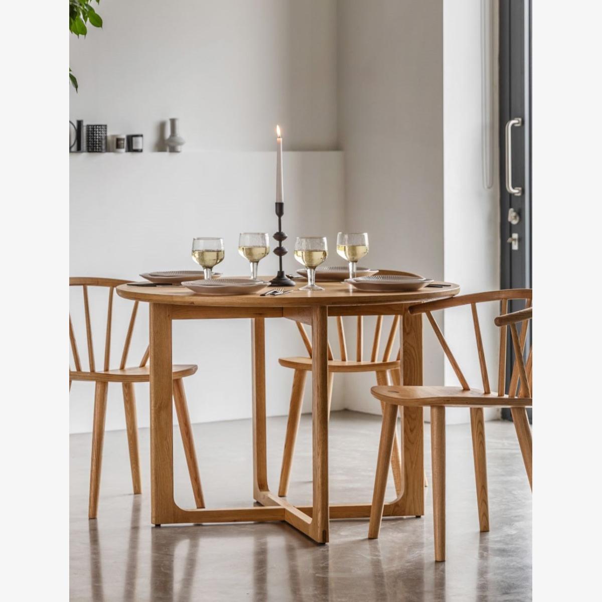 I favour the Albie round table for its pared-back silhouette and warm oak finish, which sit well in Scandi, modern farmhouse or mid-century interiors. To style, layer a neutral linen runner with contrasting ceramic plates and a simple vase of seasonal foliage, then add texture through woven dining seats or a jute rug beneath. Its circular top encourages sociable layouts in compact nooks and larger open-plan spaces alike - pair with upholstered chairs in muted tones to keep the look relaxed and inviting.