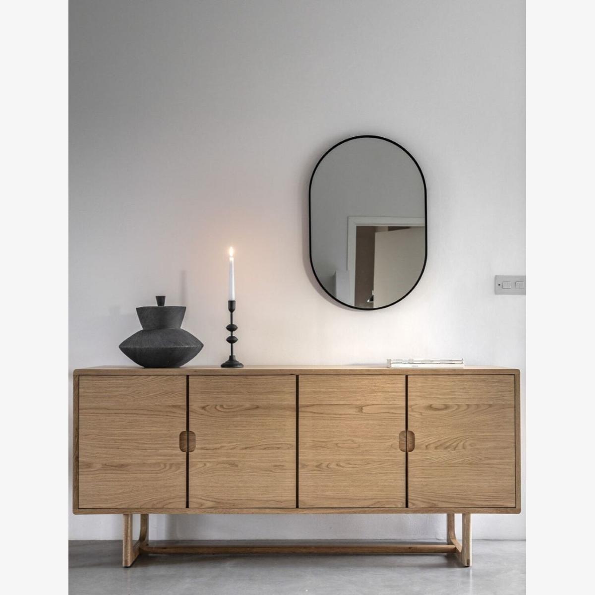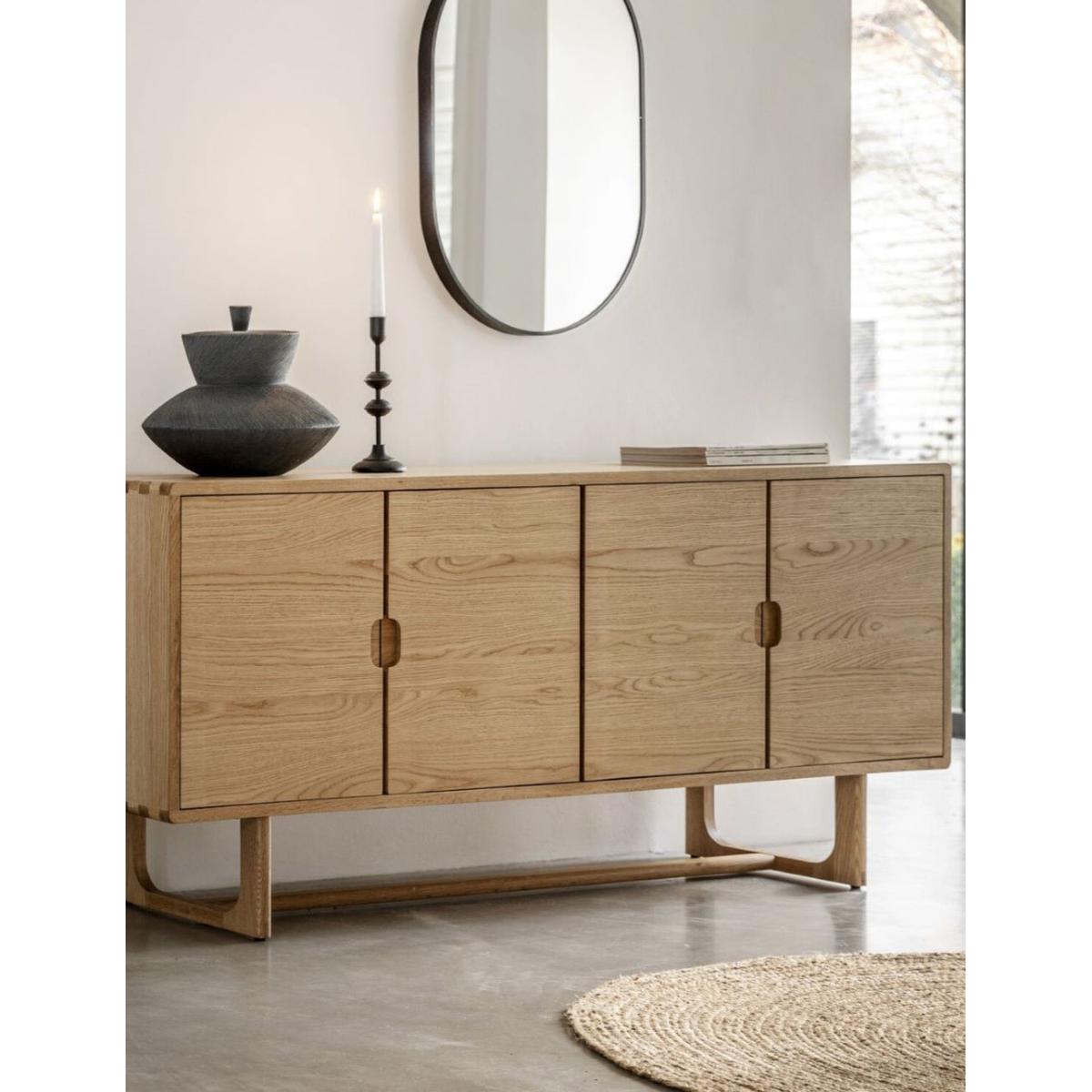 This stylish sideboard is crafted from the finest oak and oak structural veneers where practical, with a lovely natural finish. Finger joints, a technique used on only the finest cabinetry, on the exposed corners give strength and a sense of purpose and tradition to create long-lasting, legacy furniture that can be collected and handed down through generations. Also offered in a smoked finish. Matching pieces available. This beautifully minimalist sideboard give a unique look in any home interior