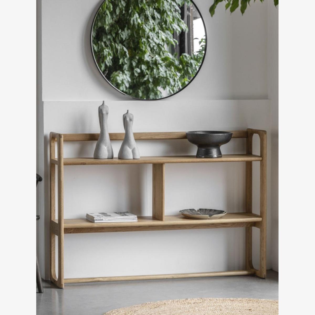 I’m a big fan of this Albie shelf for its clean lines and light oak finish - it slots straight into Scandi-inspired, minimalist or coastal schemes without fuss. The low, open design makes it ideal for hallways, living rooms or even a home office where you want display space without overwhelming the room. For styling, keep a balanced mix of books laid flat and upright, interspersed with small plants, sculptural ceramics or woven baskets to hide clutter. Stick to a simple palette of natural textures and one or two accent colours, and leave plenty of negative space so the shelf feels organised rather than crowded.