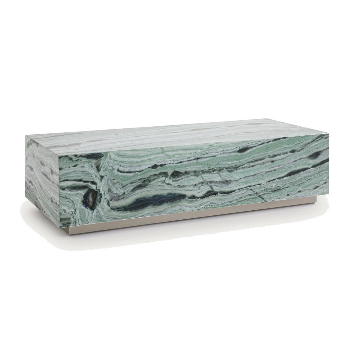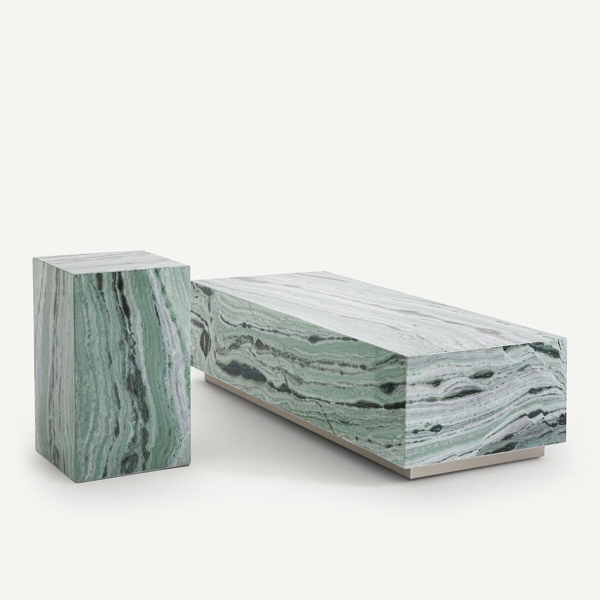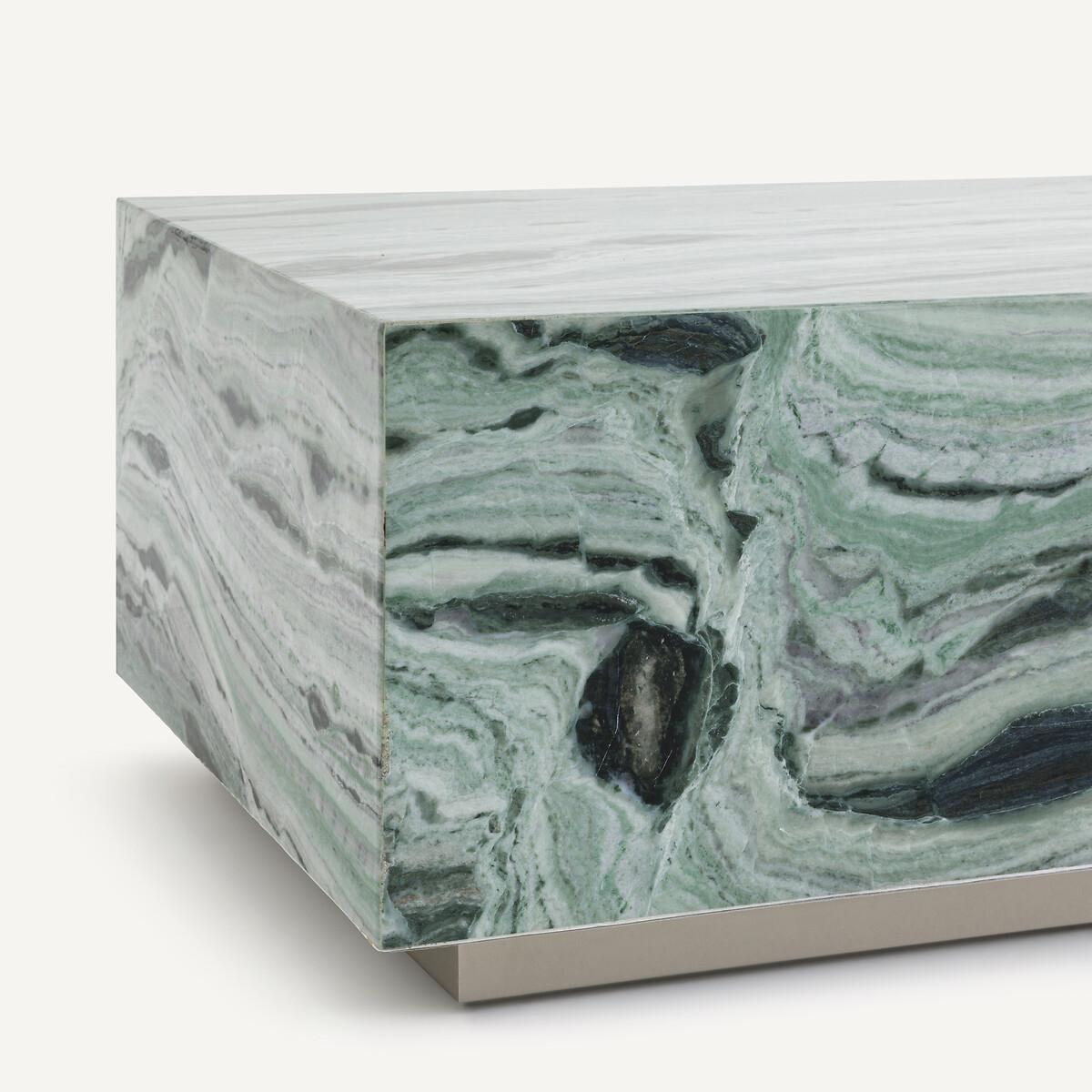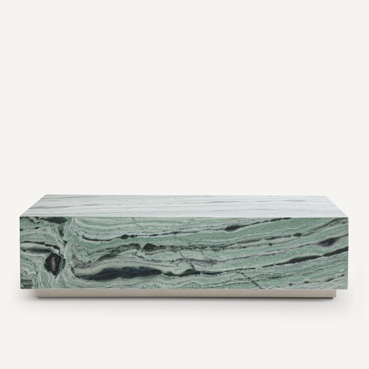A marble table with a sheen whose veins draw abstract patterns in random hues. Each Alcana piece of furniture is unique. Product Details • Structure in FSC® certified plywood (poplar wood), covered in green marble. Each piece is unique, the marbling can be more or less marked and the colours varied. • Iron base with satin nickel finish. Care Advice • Marble is a naturally porous material that is sensitive to stains. To keep it in good condition, follow the maintenance advice below: • Avoid placing hot objects on the surface, use coasters and trivets. • Immediately wipe up any spilled liquid with a white cloth dipped in lukewarm water and wrung out. • Maintain your marble regularly with products from our partner Akemi®. • We advise you to use Akemi® Crystal Clean Spray for your daily maintenance and, at least once a month, Akemi® Triple Effect Spray to clean and protect your marble surface.. This will reinforce the initial treatment and its water-repellent effect will prevent dirt from easily penetrating the stone.. • If you want to use products other than those of our partner Akemi®, choose only p. H-neutral cleaners. • Acid, anti-limescale or bleach-based products are not recommended. Dimensions • Width: 120cm • Height: 32cm • Depth: 50cmDelivery:. Sold pre-assembled. Available for home delivery. Dimensions and weight of parcel1 parcel • L135 x H45 x D63cm, 63kg