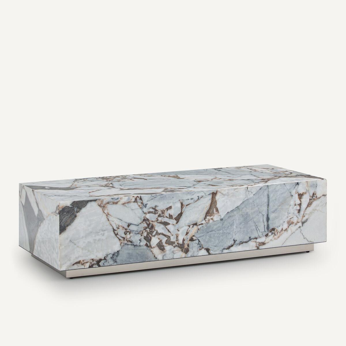 A marble table with a sheen whose veins draw abstract patterns in random hues. Each Alcana coffee table is unique. Robust and light, the structure is hollow and rests on a metal base with a satin nickel finish. An AMPM exclusive. Product Details • Structure in plywood (poplar wood), covered in marble. Each piece is unique, the marbling can be more or less marked and the colours varied. • Iron base with satin nickel finish. Care Advice. Marble is a naturally porous material that is susceptible to stains. To keep it in good condition, follow the maintenance advice below: • Avoid placing hot objects on the surface, use coasters and trivets. • Immediately wipe up any spilled liquid with a white cloth dipped in lukewarm water and wrung out. • Maintain your marble regularly with products from our partner Akemi®. • We advise you to use Akemi® Crystal Clean Spray for your daily maintenance and, at least once a month, Akemi® Triple Effect Spray to clean and protect your marble surface.. This will reinforce the initial treatment and its water-repellent effect will prevent dirt from easily penetrating the stone. • If you want to use products other than those of our partner Akemi®, choose only p. H-neutral cleaners. • Acid, anti-limescale or bleach-based products are not recommended. Dimensions • Width: 120cm • Height: 32cm • Depth: 50cm • Weight: 43kgDelivery:. Sold pre-assembled. Available for home delivery. Dimensions and weight of parcel1 parcel • L135 x D63 x H45cm, 62kg