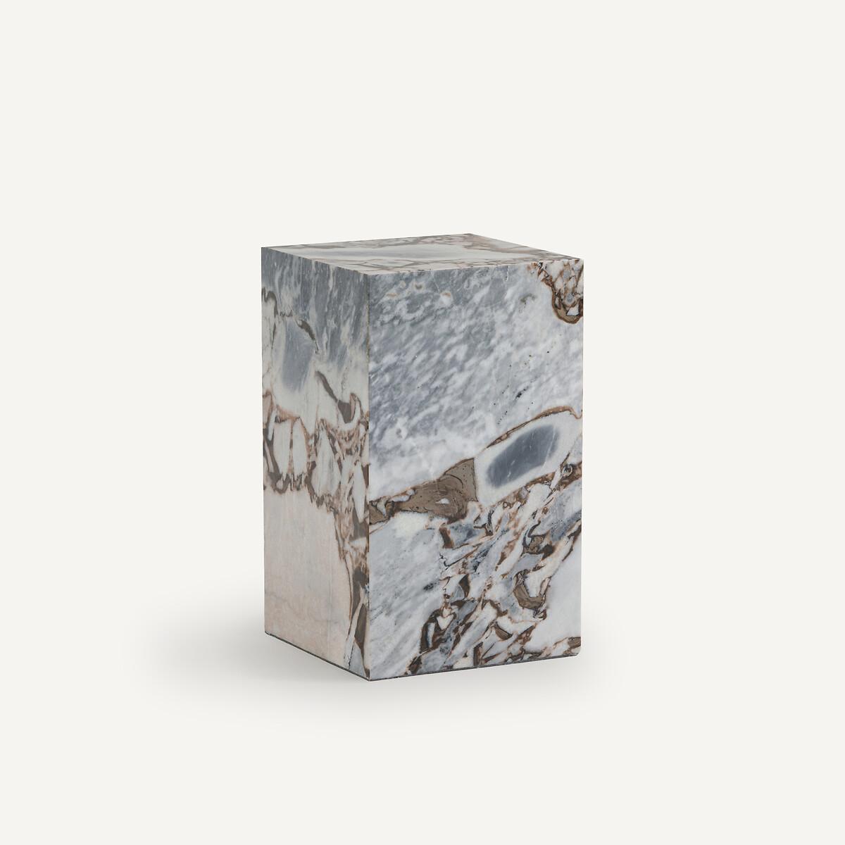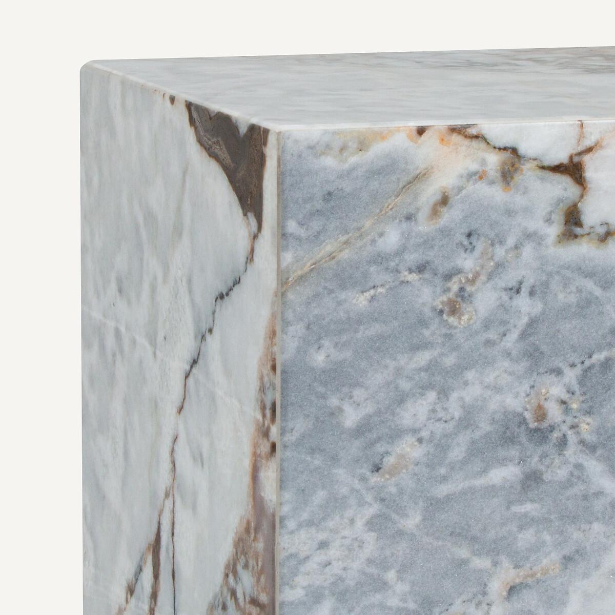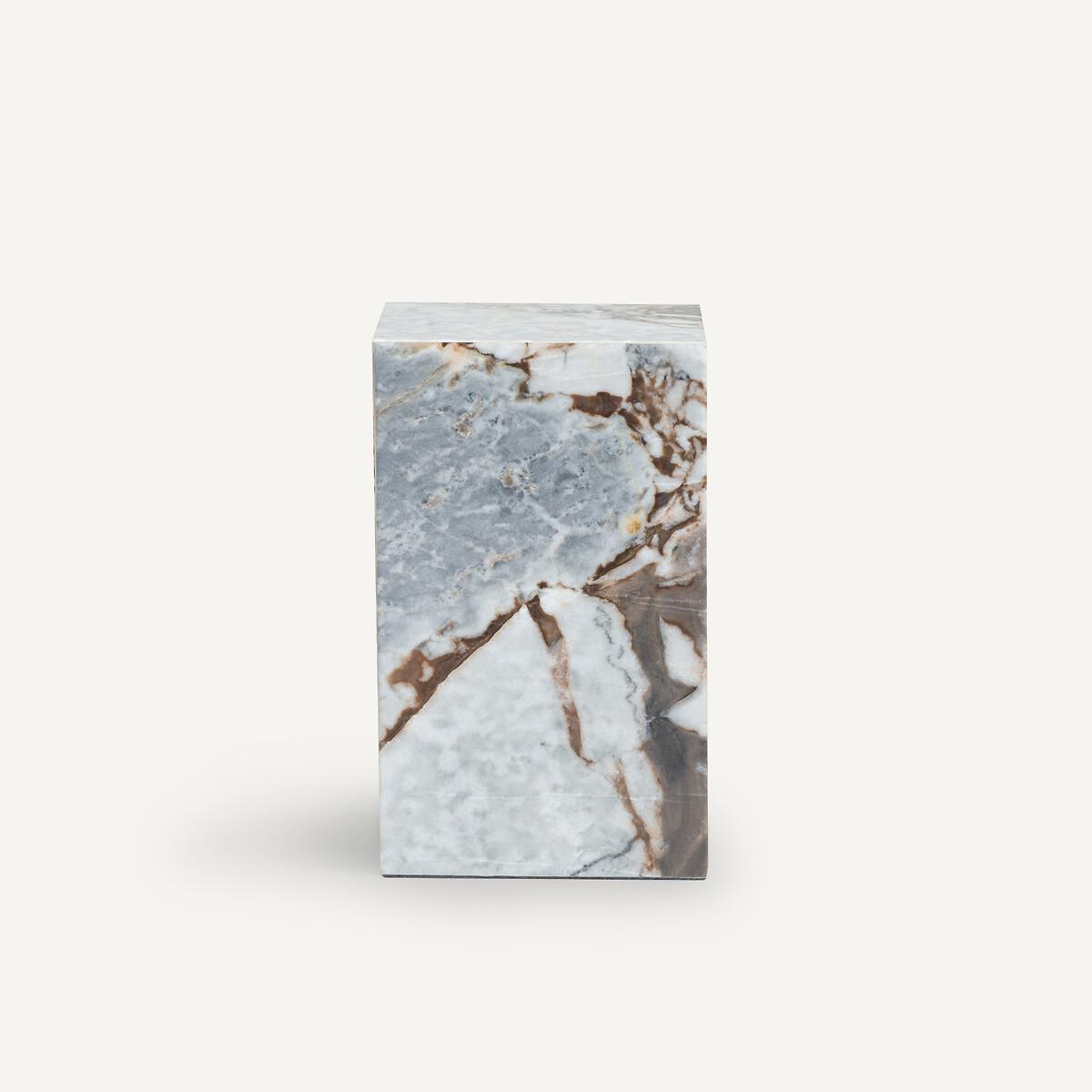 A marble table with a sheen whose veins draw abstract patterns in random hues. Each Alcana side table is a unique piece. Product Details • Structure in plywood (poplar wood), covered in marble. Each piece is unique, the marbling can be more or less marked and the colours varied.. Care Advice. Marble is a naturally porous material that is sensitive to stains. To preserve all its qualities, follow the advice below. :• Avoid placing hot objects on the surface, use coasters and trivets. • Immediately wipe up any spilled liquid with a white cloth dipped in lukewarm water and wrung out. • Maintain your marble regularly with products from our partner Akemi®. • We advise you to use Akemi® Crystal Clean Spray for your daily maintenance and, at least once a month, Akemi® Triple Effect Spray to clean and protect your marble surface.. This will reinforce the initial treatment and its water-repellent effect will prevent dirt from easily penetrating the stone. • If you want to use products other than those of our partner Akemi®, choose only p. H-neutral cleaners. • Acid, anti-limescale or bleach-based products are not recommended. Dimensions • Width: 30cm • Height: 50cm • Depth: 30cm • Weight: 15.5kgDelivery:. Sold pre-assembled. Available for home delivery. Dimensions and weight of parcel • 1 parcel • L64 x D44 x H43cm, 22kg.