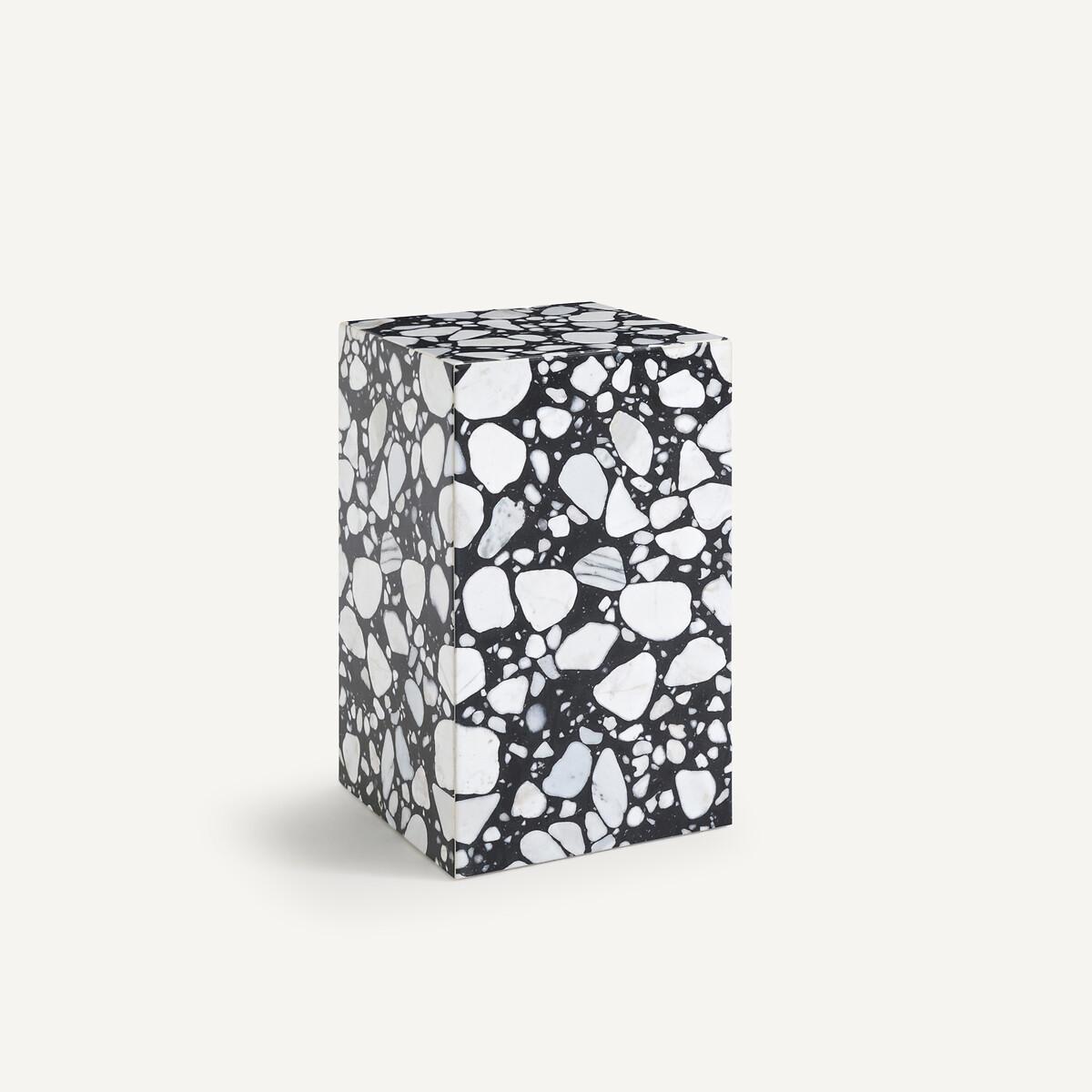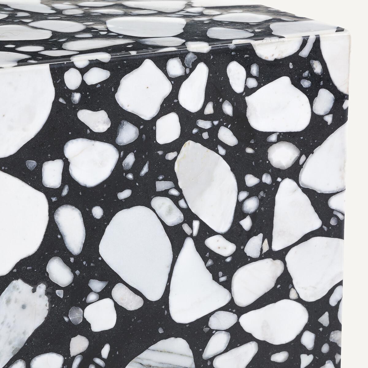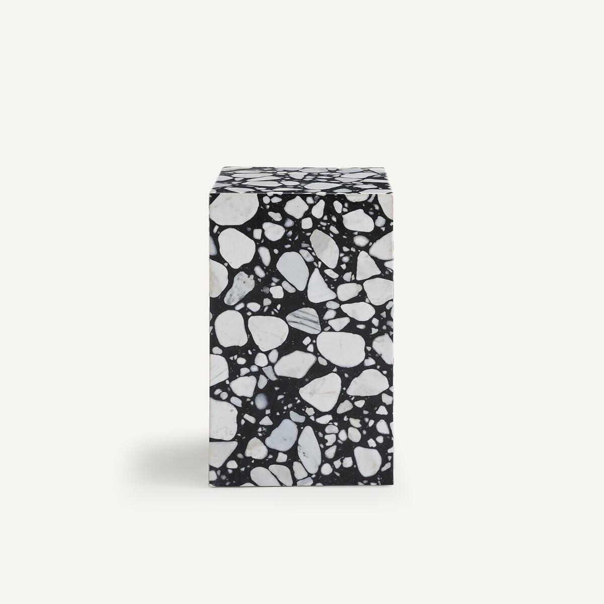 The beauty of a slightly satiny stone whose assembly of minerals creates abstract patterns in random shades. Each Alcana piece of furniture is unique. Product Details • Structure in plywood (poplar wood), covered with black and white terrazzo. Each piece is unique. The size of the stones and the colours may vary from one piece to another. Care Advice Terrazzo is a naturally porous and stain-sensitive material. To keep it in good condition, follow the maintenance advice below: • Avoid placing hot objects on the surface, use coasters and trivets. • Immediately wipe up any spilled liquid with a white cloth dipped in lukewarm water and wrung out. • Regularly maintain your terrazzo with products from our partner Akemi® • We advise you to use Akemi® Crystal Clean Spray for your daily maintenance and, at least once a month, Akemi® Triple Effect Spray to clean and protect your terrazzo surface.. This will reinforce the initial treatment and its water-repellent effect will prevent dirt from easily penetrating the stone. • If you want to use products other than those of our partner Akemi®, choose only p. H-neutral cleaners. • Acid, anti-limescale or bleach-based products are not recommended. Dimensions • Width: 30cm • Height: 50cm • Depth: 30cmDelivery:. Sold pre-assembled. It will be delivered to your door. Note! Please check that all access points are large enough to accommodate your delivery (doors, stairs, lifts).Dimensions and weight of parcel1 parcel • L64 x D44 x H44cm, 27kg