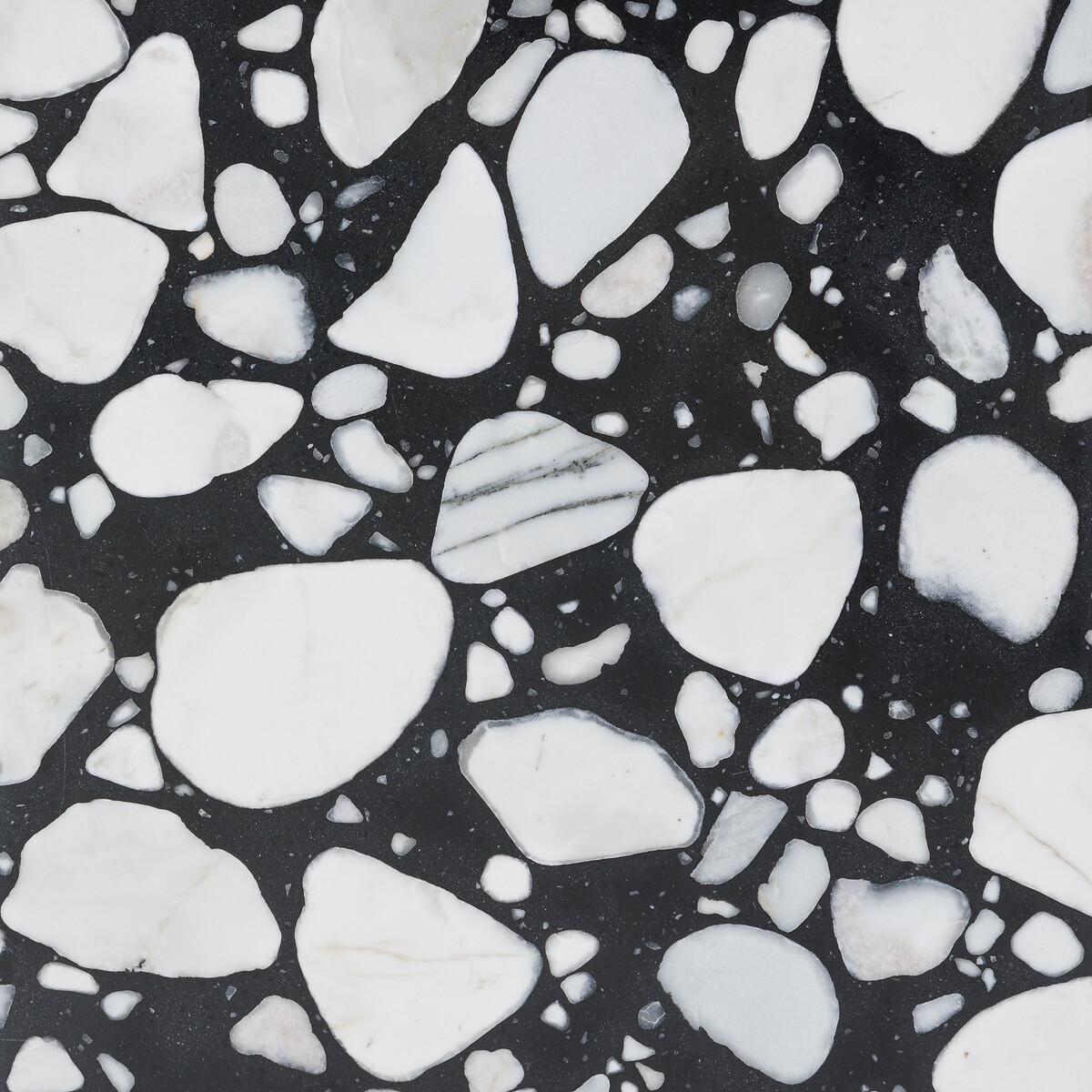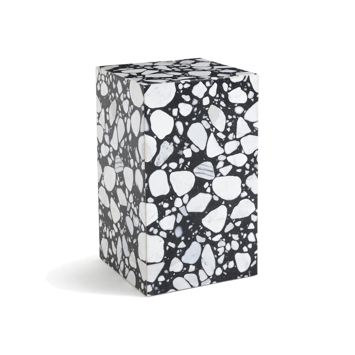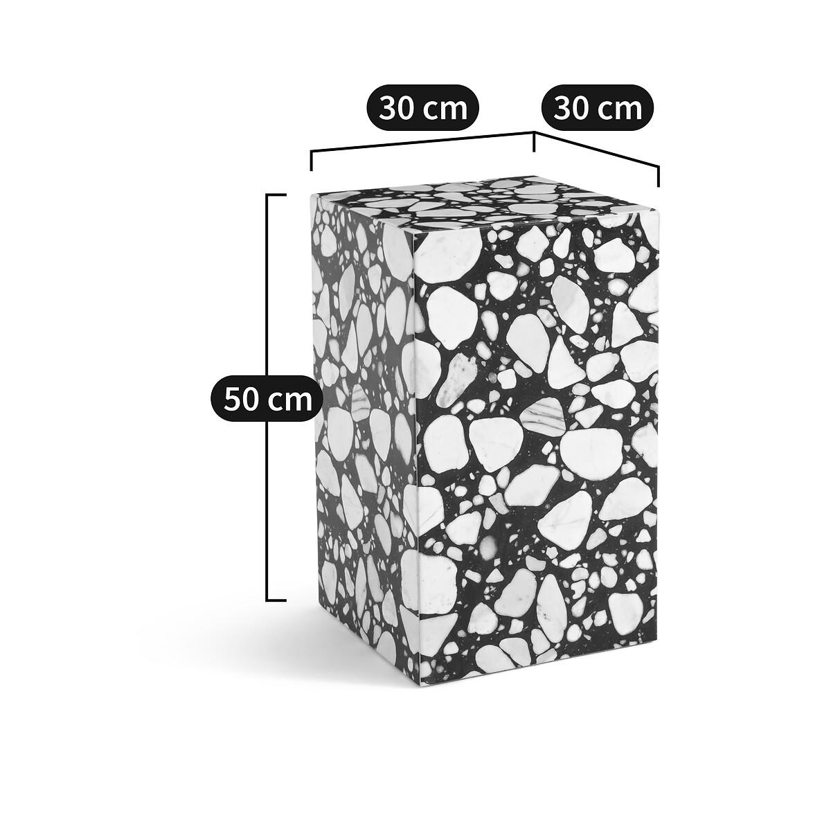 The beauty of a slightly satiny stone whose assembly of minerals creates abstract patterns in random shades. Each Alcana piece of furniture is unique. Product Details • Structure in plywood (poplar wood), covered with black and white terrazzo. Each piece is unique. The size of the stones and the colours may vary from one piece to another. Care Advice Terrazzo is a naturally porous and stain-sensitive material. To keep it in good condition, follow the maintenance advice below: • Avoid placing hot objects on the surface, use coasters and trivets. • Immediately wipe up any spilled liquid with a white cloth dipped in lukewarm water and wrung out. • Regularly maintain your terrazzo with products from our partner Akemi® • We advise you to use Akemi® Crystal Clean Spray for your daily maintenance and, at least once a month, Akemi® Triple Effect Spray to clean and protect your terrazzo surface.. This will reinforce the initial treatment and its water-repellent effect will prevent dirt from easily penetrating the stone. • If you want to use products other than those of our partner Akemi®, choose only p. H-neutral cleaners. • Acid, anti-limescale or bleach-based products are not recommended. Dimensions • Width: 30cm • Height: 50cm • Depth: 30cmDelivery:. Sold pre-assembled. It will be delivered to your door. Note! Please check that all access points are large enough to accommodate your delivery (doors, stairs, lifts).Dimensions and weight of parcel1 parcel • L64 x D44 x H44cm, 27kg