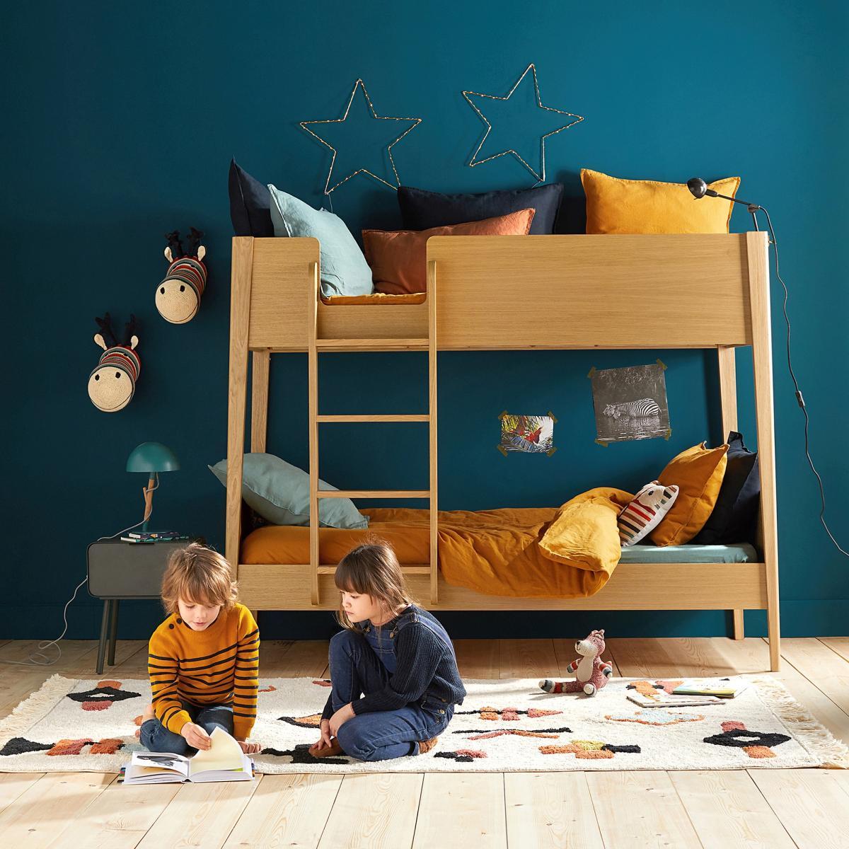 I love this bunk bed for its clean, minimalist design and natural wood finish, making it a versatile piece for various children’s rooms. Its simple aesthetic works well in contemporary, Scandi-inspired interiors, but it can also soften a more playful, eclectic space with the right accessories. Practical styling tips include pairing it with neutral bed linens to keep the look calm and adding colourful cushions or throws to inject personality. To maximise space, consider placing a cosy reading nook or a storage unit underneath. Its straightforward design makes it easy to adapt as the children grow, and the natural wood adds warmth and character to any children’s room.