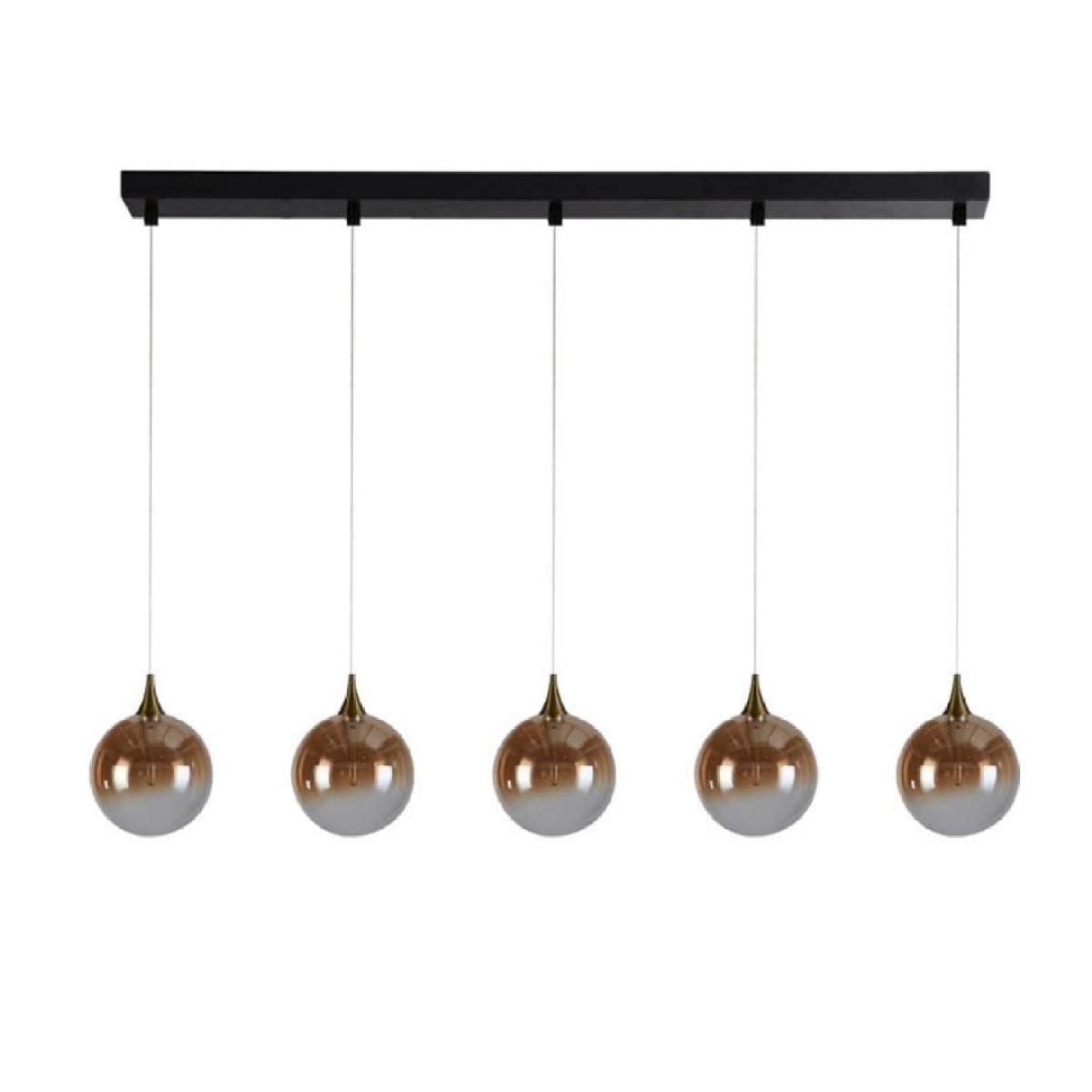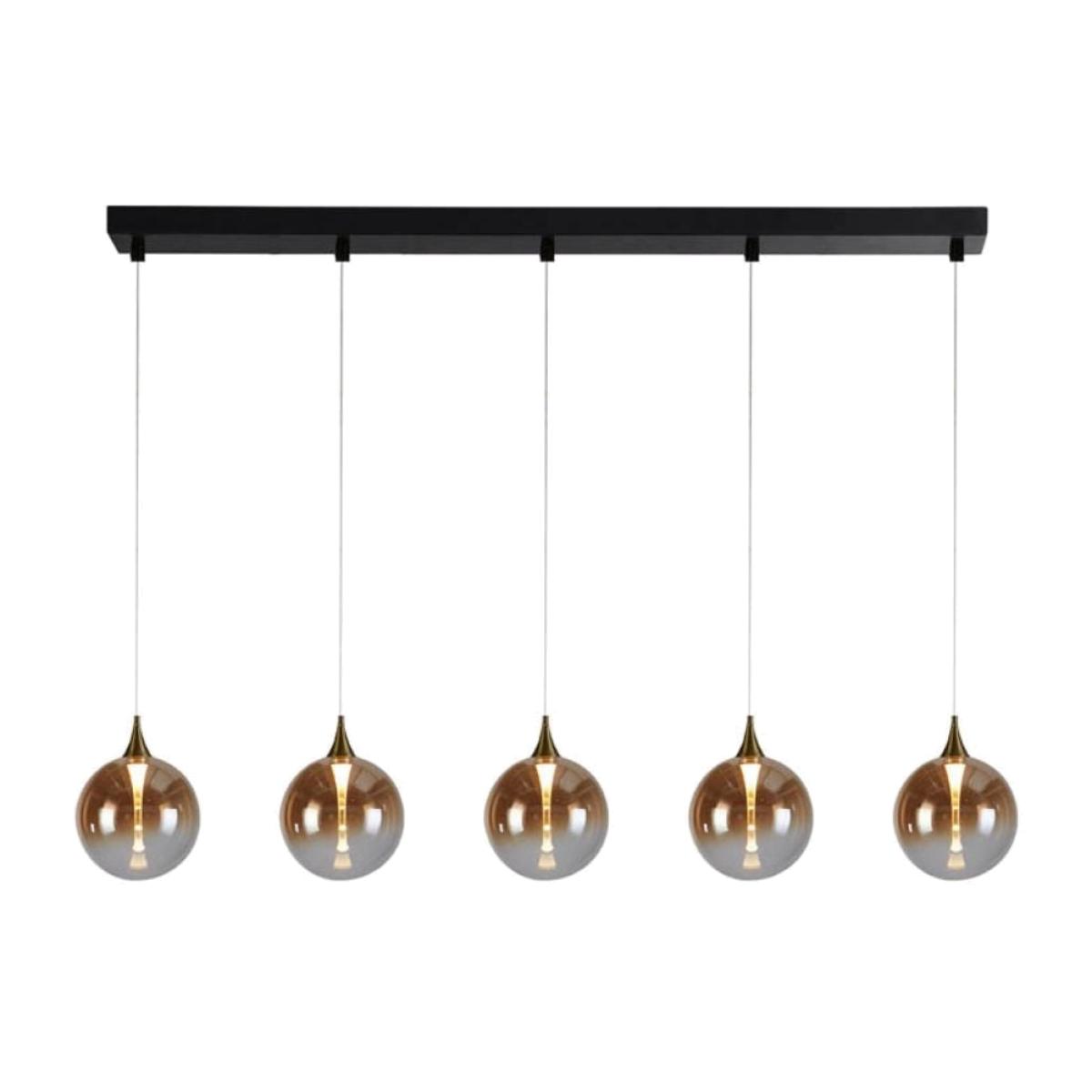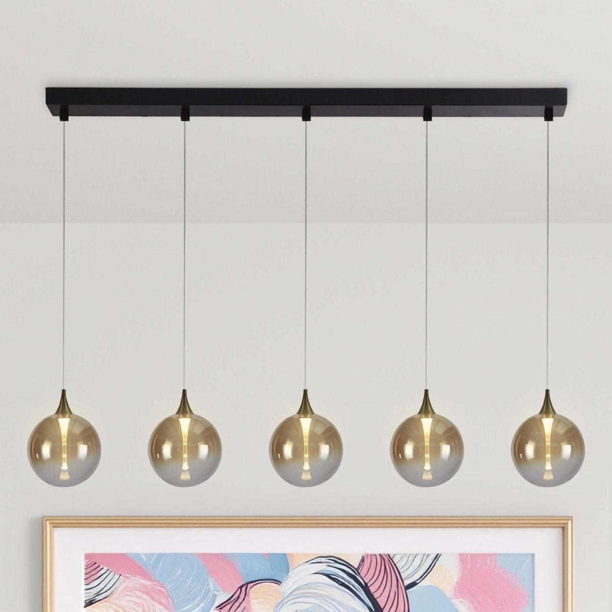 Alchemy 5-light LED ceiling pendant bar, featuring spherical ombre amber glass shades, gold finials and a matte black ceiling fixture. Introduce a striking focal point to your space with the Alchemy LED pendant bar, a perfect blend of modern elegance and warm ambiance. This pendant light showcases spherical amber glass shades that create a beautiful gradient effect, casting a soft, inviting glow. The gold finials add a luxurious touch, complementing the shades and enhancing the sophisticated appeal, while the matte black ceiling fixture provides a sleek contrast, anchoring the design in contemporary style. Ideal for dining areas, kitchen islands or living spaces, the Alchemy pendant bar seamlessly combines function with high-end aesthetics, transforming any room into an elevated, welcoming environment. Alchemy 5-light LED ceiling pendant bar, featuring spherical ombre amber glass shades, gold finials and a matte black ceiling fixture. Introduce a striking focal point to your space with the Alchemy LED pendant bar, a perfect blend of modern elegance and warm ambiance. This pendant light showcases spherical amber glass shades that create a beautiful gradient effect, casting a soft, inviting glow. The gold finials add a luxurious touch, complementing the shades and enhancing the sophisticated appeal, while the matte black ceiling fixture provides a sleek contrast, anchoring the design in contemporary style. Ideal for dining areas, kitchen islands or living spaces, the Alchemy pendant bar seamlessly combines function with high-end aesthetics, transforming any room into an elevated, welcoming environment.