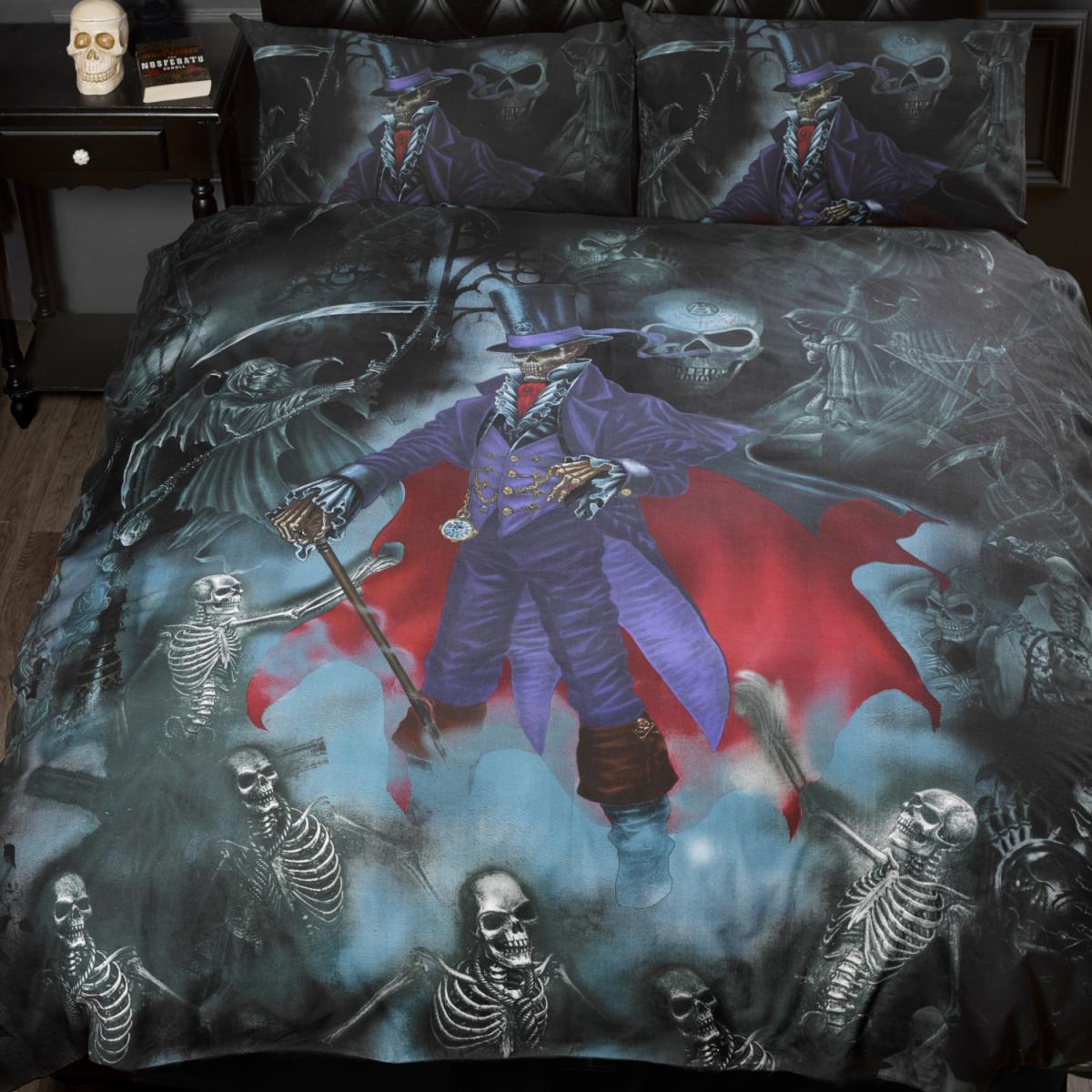 This officially licensed Alchemy merchandise features bold Count Magistus in shades of purple, red and gold, surrounded by skeletons and the grim reaper in whispy smoke on a bold black ground. This stunning range has matching accessories which are available separately. Add an alternative gothic touch to your home interiors with this bold set. Ideal addition for Halloween. Set Includes : 1 Double Bed Duvet Cover (200cm x 200cm) and 2 Pillowcases (50cm x 75cm). Sizes are approx.