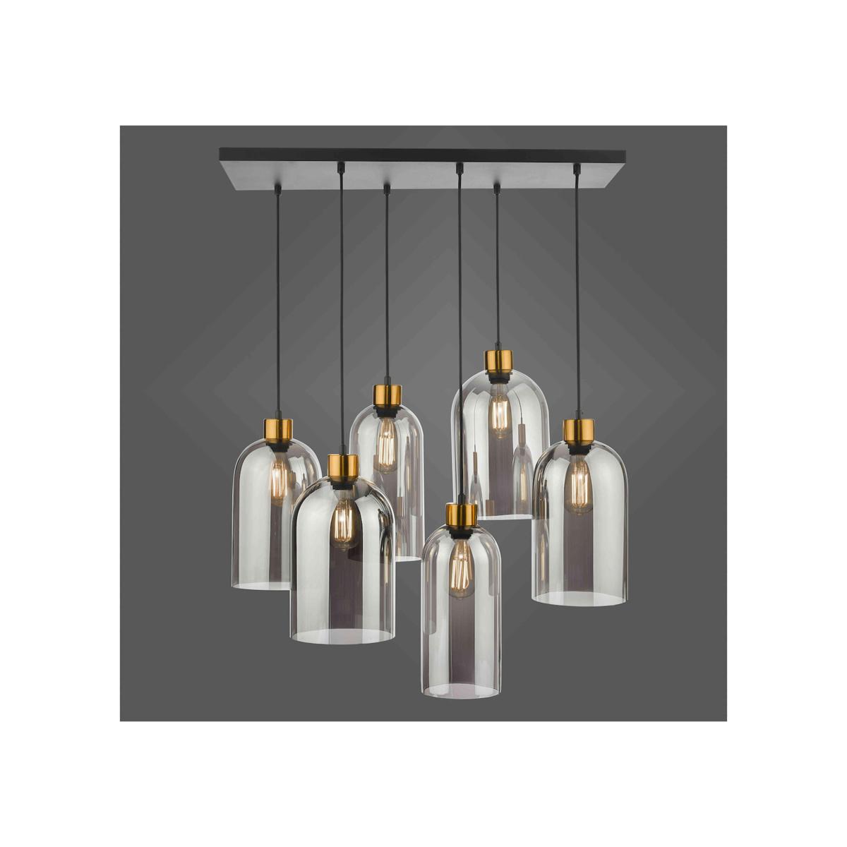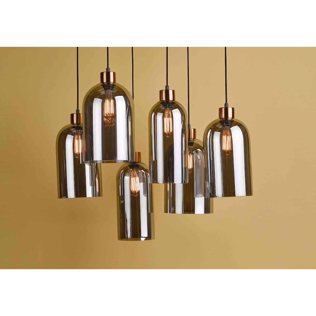 Metal and glass come together in perfect harmony in this very stylish modern ceiling pendant light. The details are fantastic and the light it creates is warm and inviting. Why you'll love it Elegant industrial bar pendant for a kitchen island or dining room. Cluster of 6 multi-sized light shades hang from a black metal ceiling plate. Aged bronze-effect metalwork. Cloche-shaped smoked glass light shades. Black fabric cables. This ceiling pendant is part of the Furniture Village lighting collection. What you need to know Metal and glass. Height adjustable on installation. With 6 x 100 cm lengths of cable. Inline rocker switch. Requires 6 x E27 GLS max. 60 W bulbs (not included). Professional installation recommended. Dimensions Height: 40 cm (16 in). Depth: 39 cm (16 in). Width: 77 cm (31 in). Shade dimensions Height: 30 cm (12 in). Diameter: 15 cm (6 in); 18 cm (8 in); 20 cm (8 in).