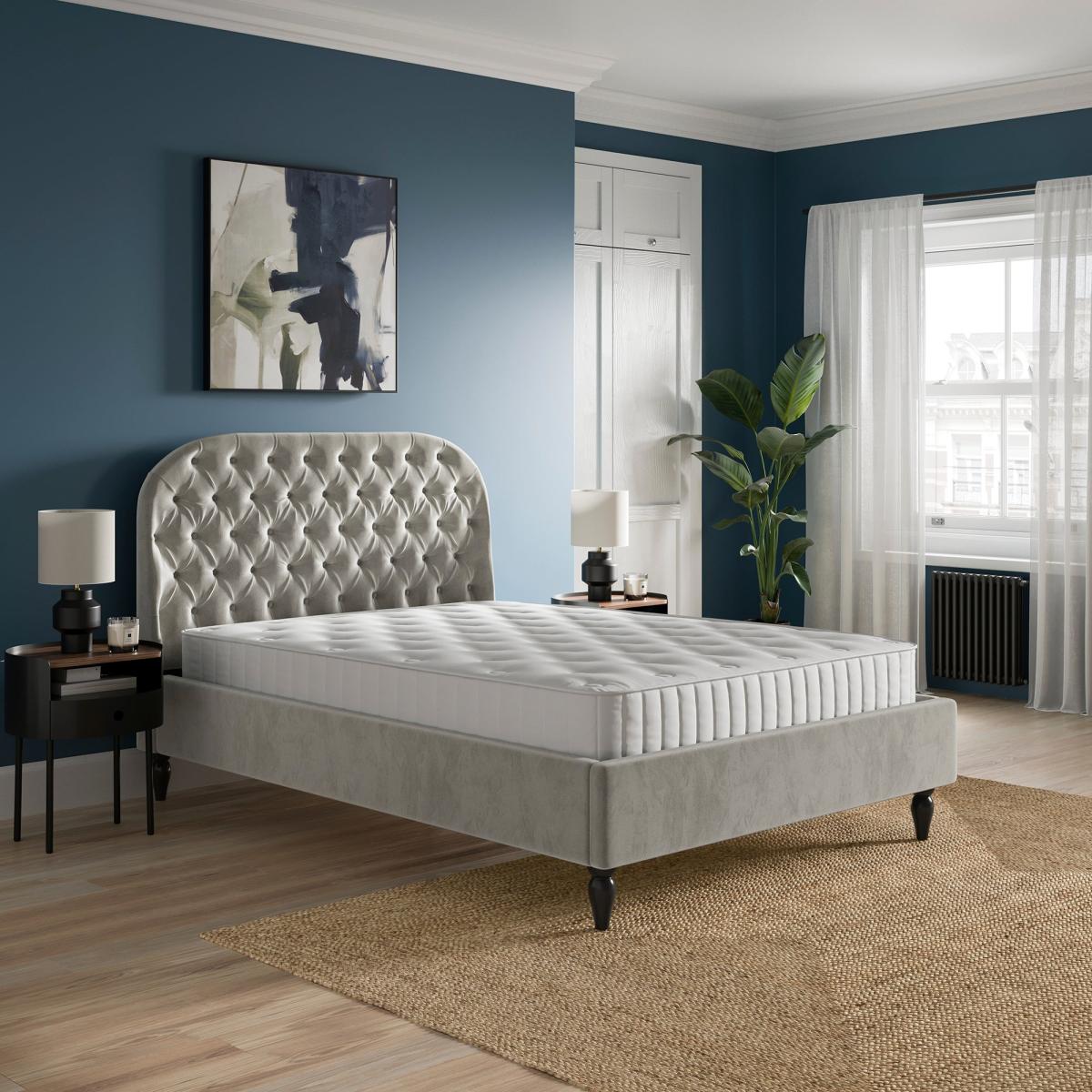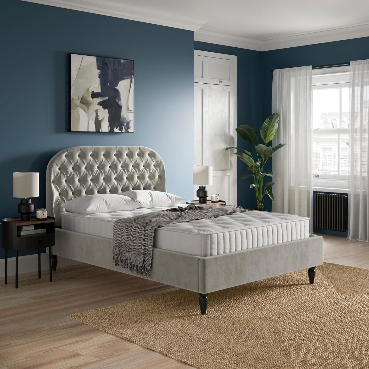 I’m a fan of the Aldbury bed for its classic button-tufted headboard and soft velvet upholstery - it instantly adds a touch of refined comfort without feeling over the top. It sits equally well in a contemporary scheme with clean lines or in a more traditional setting alongside dark wood furniture. For practical styling, layer with textured throws and a mix of plump cushions in complementary tones, then flank with slim-leg bedside tables and minimal metal lamps to let the headboard remain the focal point. A jute rug underneath will soften the look and introduce subtle natural contrast.