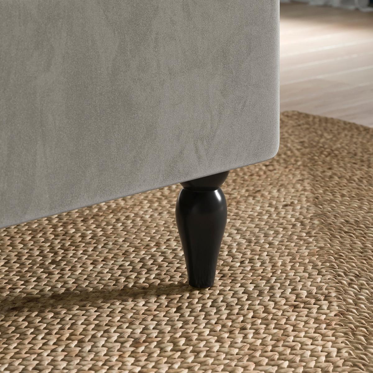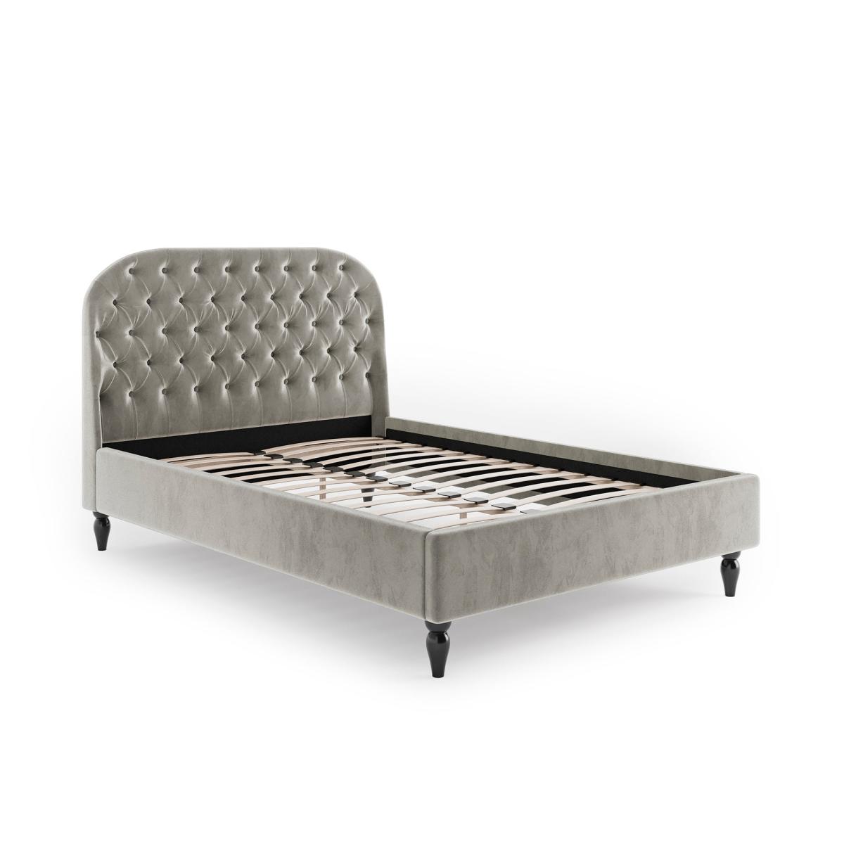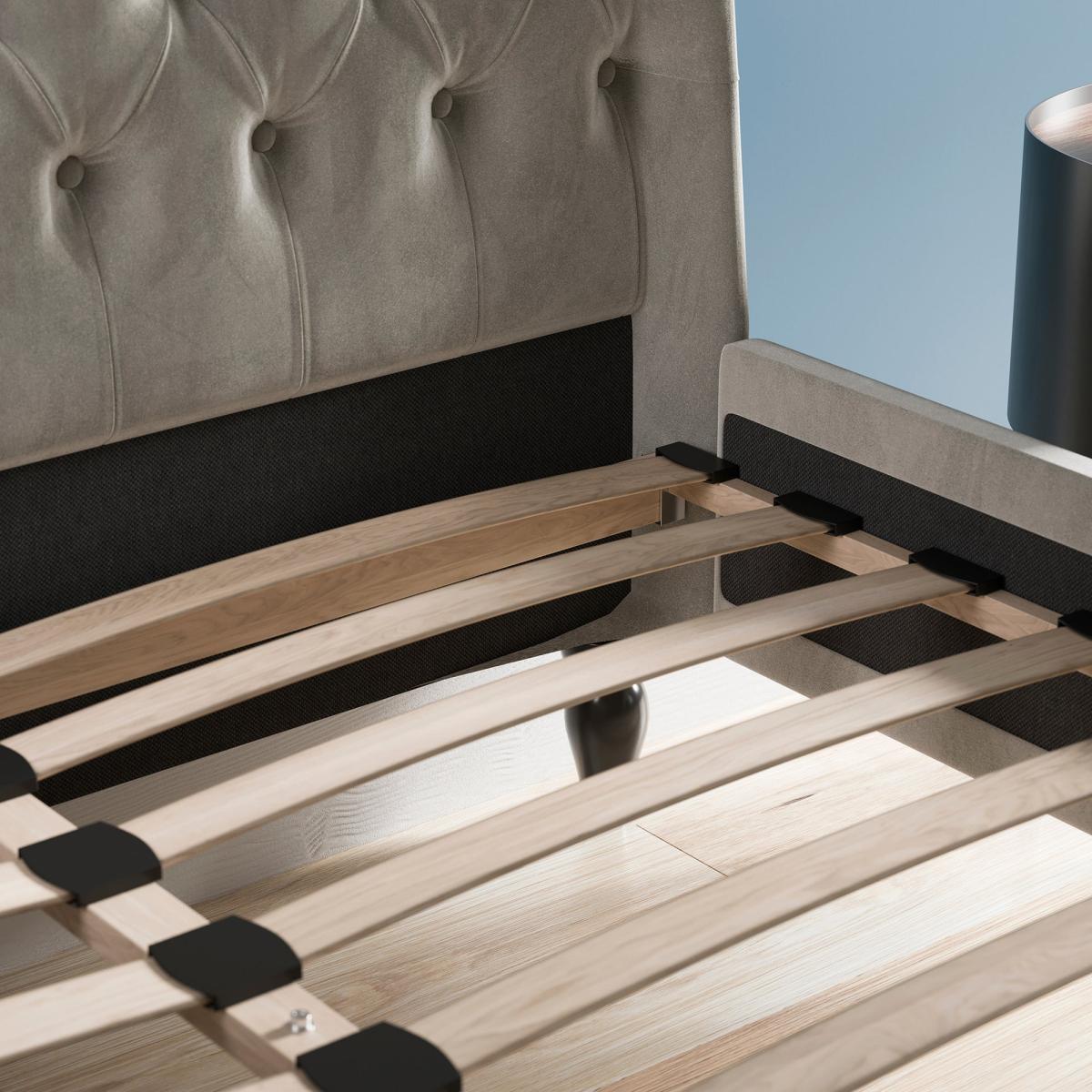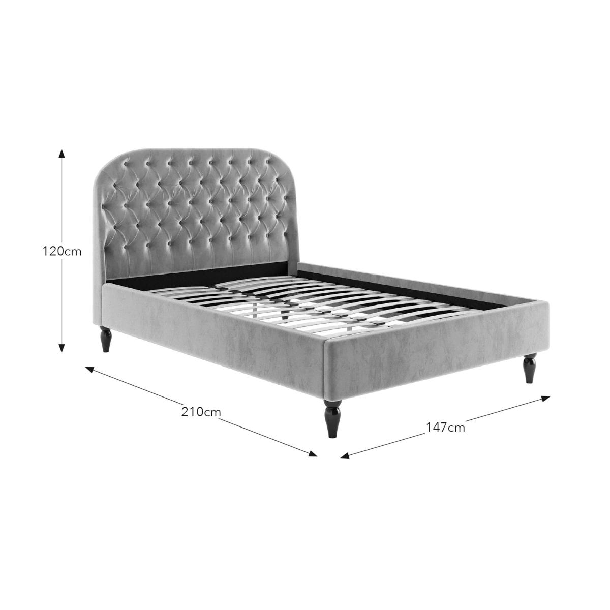 * Upholstered bed frame* Dark wood legs* Sprung slatted base This bed frame brings a touch of opulence and glamour to your bedroom with its luxurious hand-sewn fabric finish and elegant wooden legs. The bed features a stunning curved Chesterfield-style headboard, adding timeless sophistication to any décor. Equipped with a spring slatted base, it offers enhanced support and comfort for a restful night’s sleep.