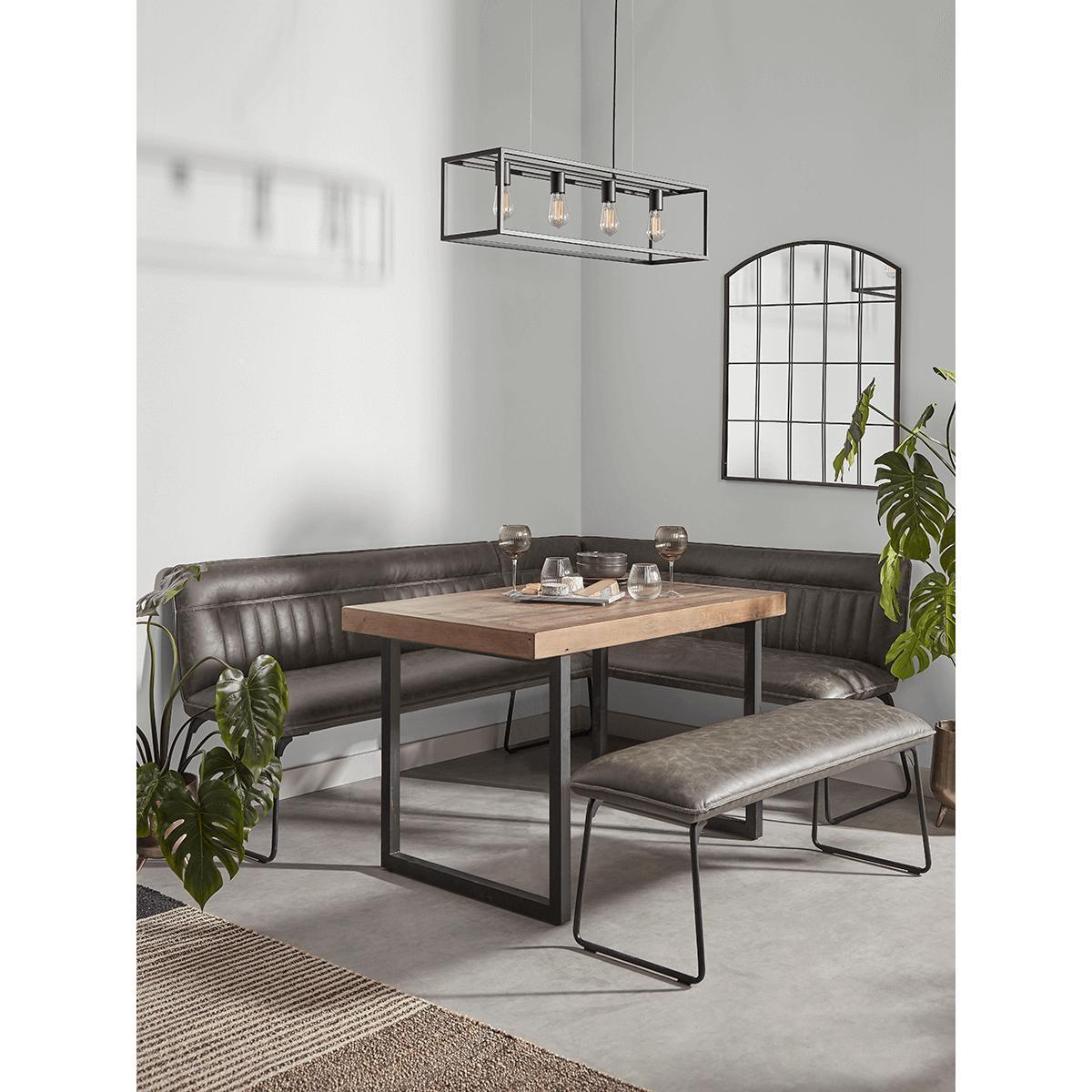 Our Alden Loft Corner Dining Set of a bench, corner bench and table, comes with plenty of New York loft-inspired style. The top of our industrial look table is crafted from solid wood with an aged character, encased in a smooth edge above a dark bracket frame. The accompanying bench and corner bench provide comfortable yet compact seating and both are upholstered in a rich-toned faux leather with cushioning stitch detailing. The versatile nature of a bench seat and compact table serves limited dining spaces and open plan spaces really well. Bench seats do not limit numbers in the same way a standard dining chair might, and their placement can put a focus on a dining table, which defines the space effectively. As kitchen and dining rooms continue to be the most social rooms of the house, we’re making your dining-living easy with our Alden Loft Corner Dining Set.