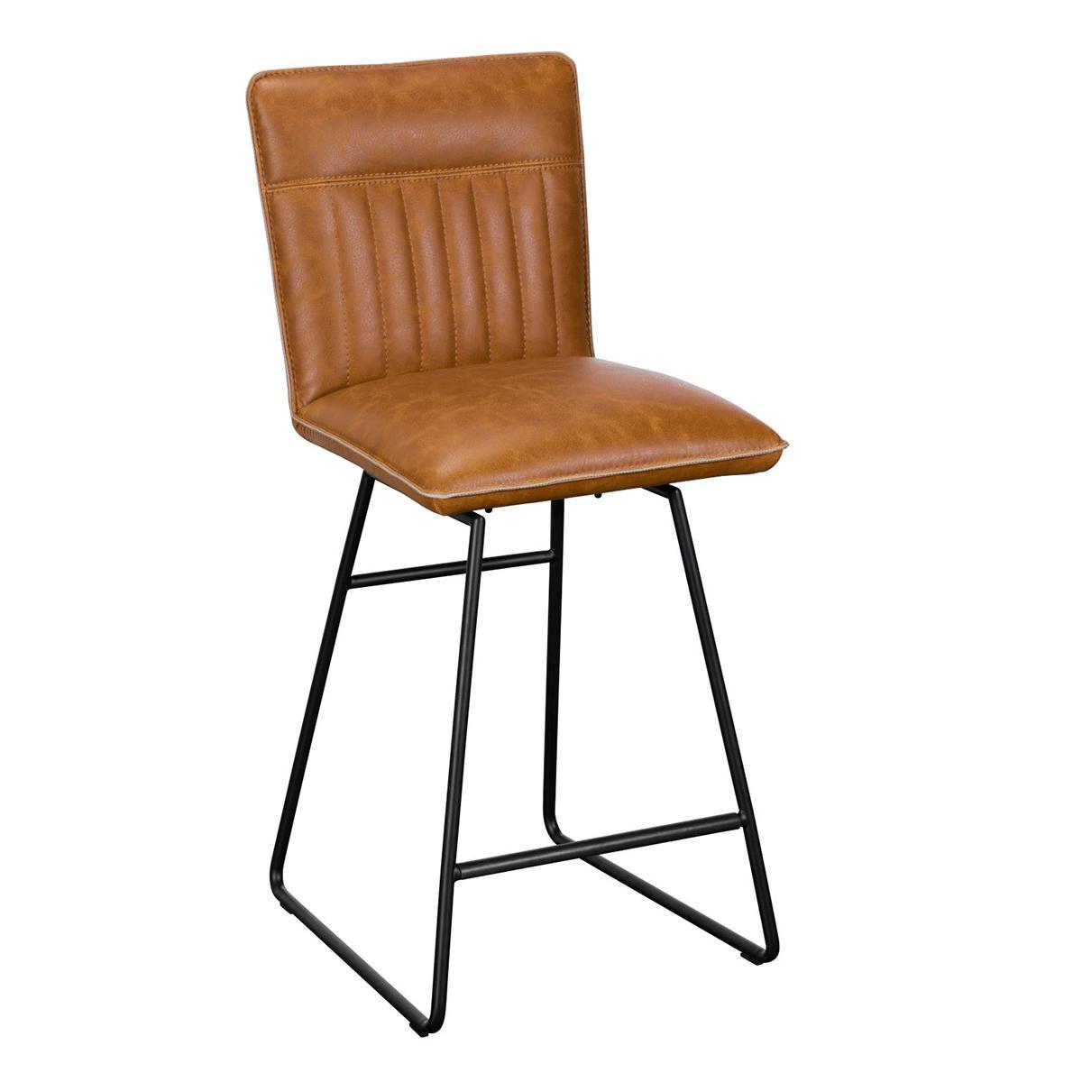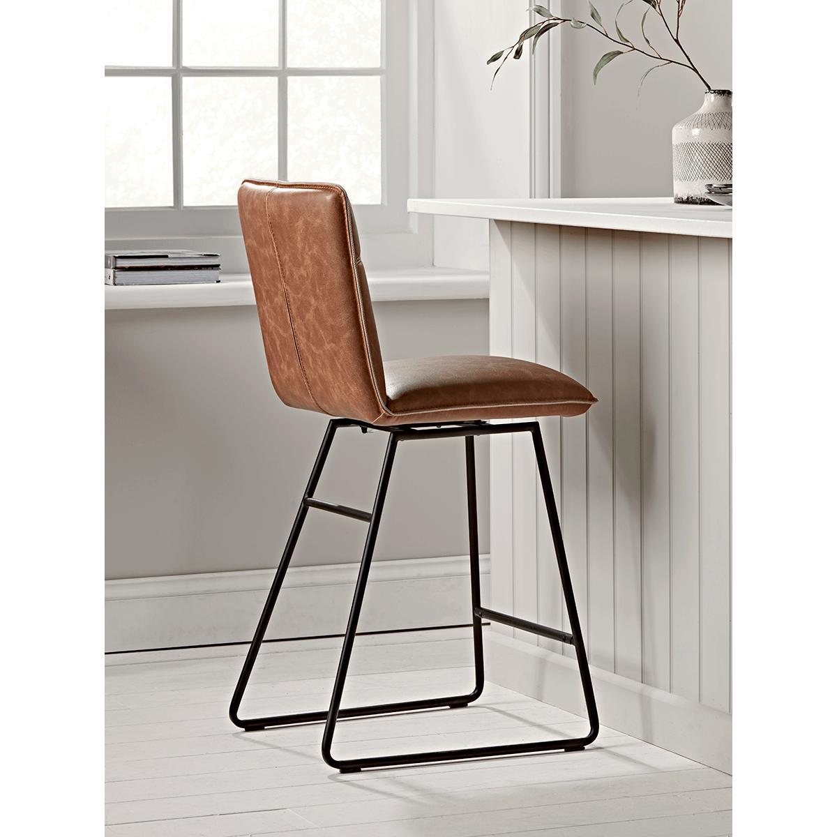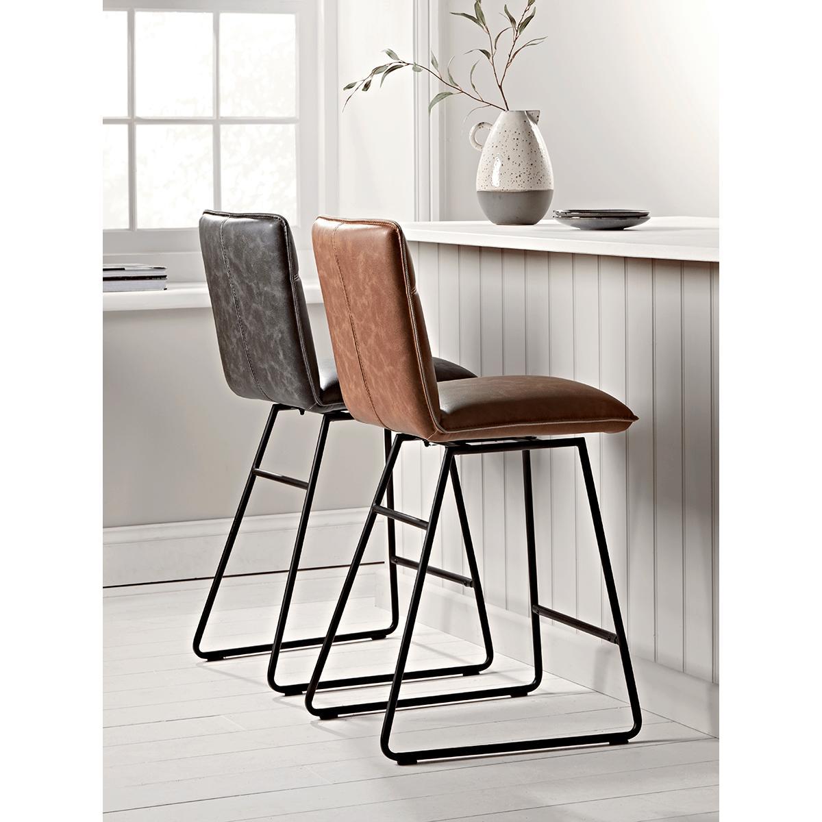 Perfect for an edgy, contemporary kitchen, our New York loft inspired bar stool features a black metal frame and faux tan leather upholstered seat and has a twisting seat function. Each stylish seat has a ribbed stitched detail to the backrest and a wide footprint for stability and comfort. Also available in. Grey.