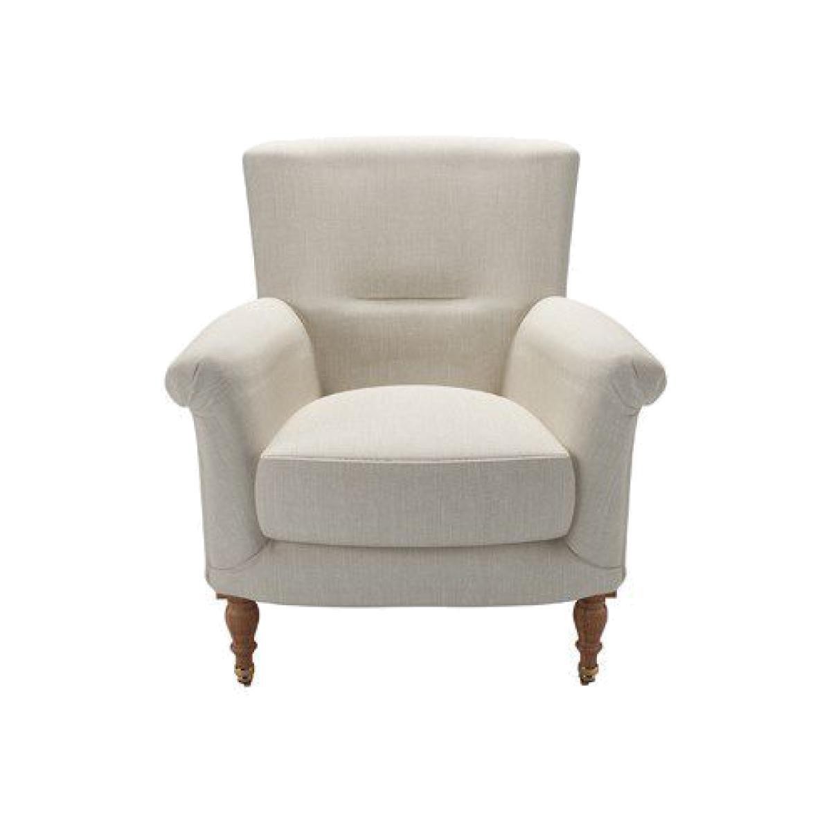 I love this armchair for its classic yet versatile silhouette, making it an easy addition to many interiors. Its neutral canvas linen cover offers a crisp, timeless look that pairs well with both contemporary and traditional spaces. It works especially well as an accent piece in living rooms or bedrooms, providing a comfortable spot to relax without overpowering the decor. For styling, consider adding a cosy textured throw or patterned cushion to introduce colour and personality. Pair it with warm wood furniture or softer pastel tones to enhance its understated charm, making it a functional and stylish focal point.