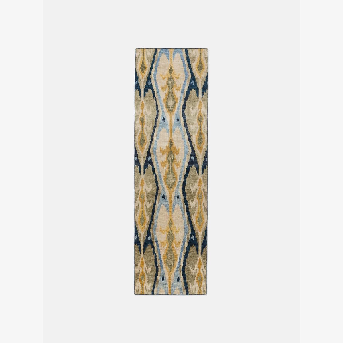 Hand-knotted in India by skilled artisans, the Alderton runner looks to the oversized, Ikat-inspired patterns found in Soho House Austin. A wool pile lends comfort, while a cool colour palette of navy, sage and olive tones instantly uplifts any area of the home. Wool pile with a cotton ground Hand-knotted in India Navy, sage and olive tones Inspired by Ikat-inspired fabrics in Soho House Austin Available in five rug sizes and two runners