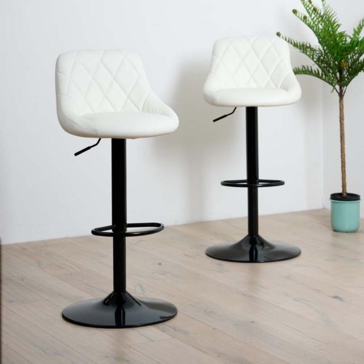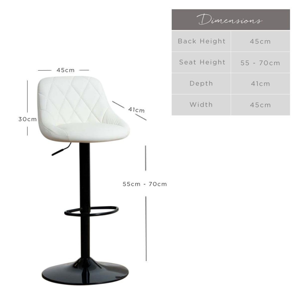 This Aldin bar stool is a great blend of soft upholstery and modern styling. From the sumptuously padded seat in the soft cream faux leathe to the stylish black base, the stool provides amazing comfort while in use. The smart gas lift mechanism allows to adjust your chosen height with ease. Sold as a set of 2 chairsW45cm x D41cm x H85 - 100cm Seat Height 55 - 70cm Simple self assembly
