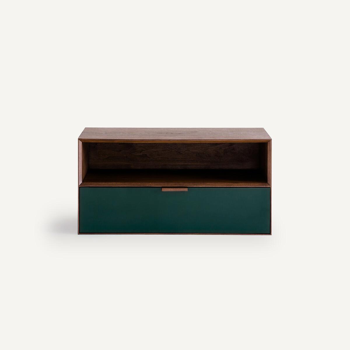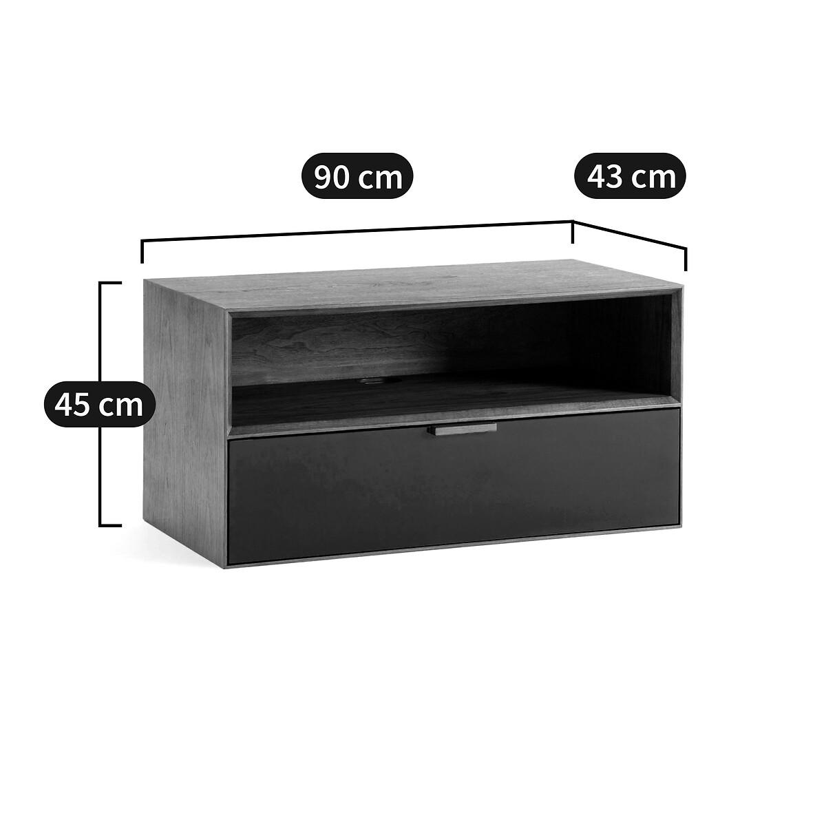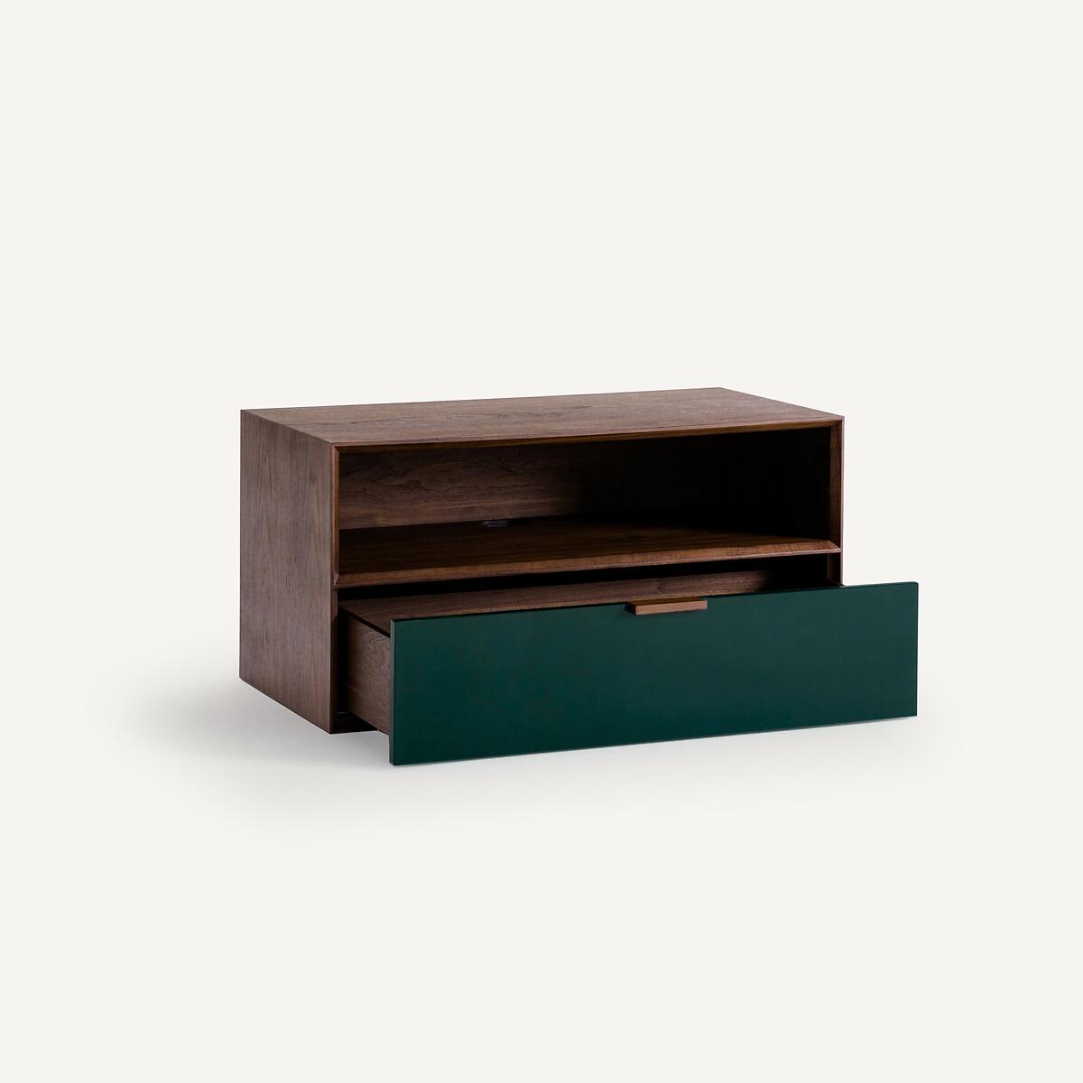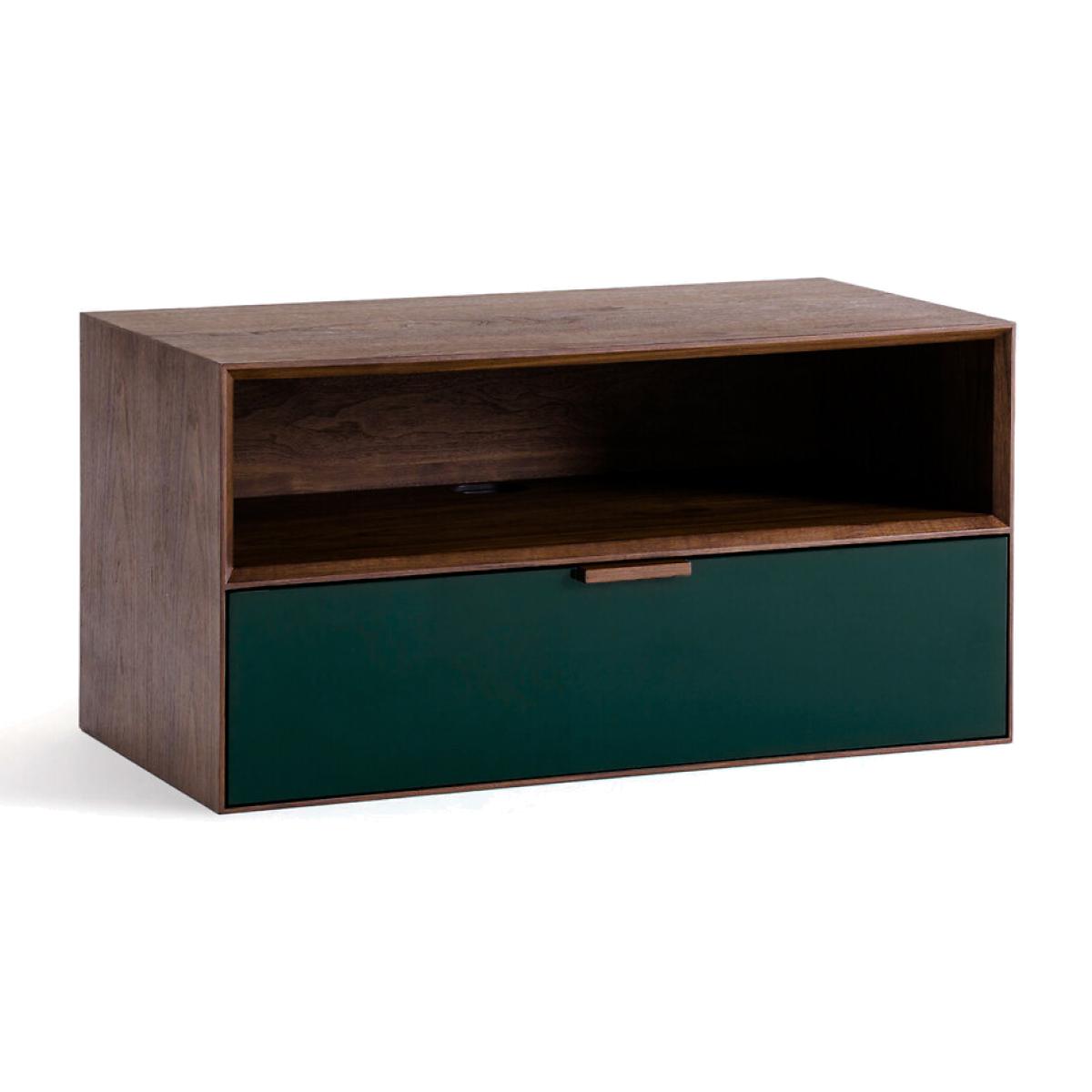 Taken from the Aldon modular storage system, this element can be used alone or combined with other modules in the range, in particular to create a TV cabinet.The finish of the unit and the horizontal compartment, whose profile has a 45° cut, is in FSC® walnut veneer. The drawer has a lacquered front and a soft closing finish. Aldon can be wall mounted, cantilever style, or mounted on feet sold separately. An AMPM exclusive designed to adapt to all spaces. Product Details • Unit and compartment in FSC®-certified walnut veneered MDF, nitrocellulose varnish finish • 1 drawer in FSC® certified walnut veneered MDF, painted front, semi-gloss lacquer finish, polyurethane varnish, soft closing system • 1 large compartment, edge detail cut at 45° • 1 cable entry port • To fix to the wall (screws and plugs not included) or to put on feet, sold separately. Quality Info • German brand hardware: reliable, discreet and functional. These accessories ensure the longevity of your product. • Soft-closing : system for closing doors smoothly, silently, also preventing fingers from getting caught. Dimensions. Overall • Width: 90cm • Height: 45cm • Depth: 43cm Usable space • Compartment: L86 x H19 x D39cm • Drawer: L82 x H12 x D28cm Delivery:Sold pre-assembled. It will be delivered to your door. Note! Please check that all access points are large enough to accommodate your delivery (doors, stairs, lifts). • WOOD FROM SUSTAINABLY MANAGED FORESTS. FSC® certified wood comes from forests that are environmentally, socially and economically well managed. Dimensions and weight of parcel 1 parcel • L99 x H56 x D52cm. 42kg.