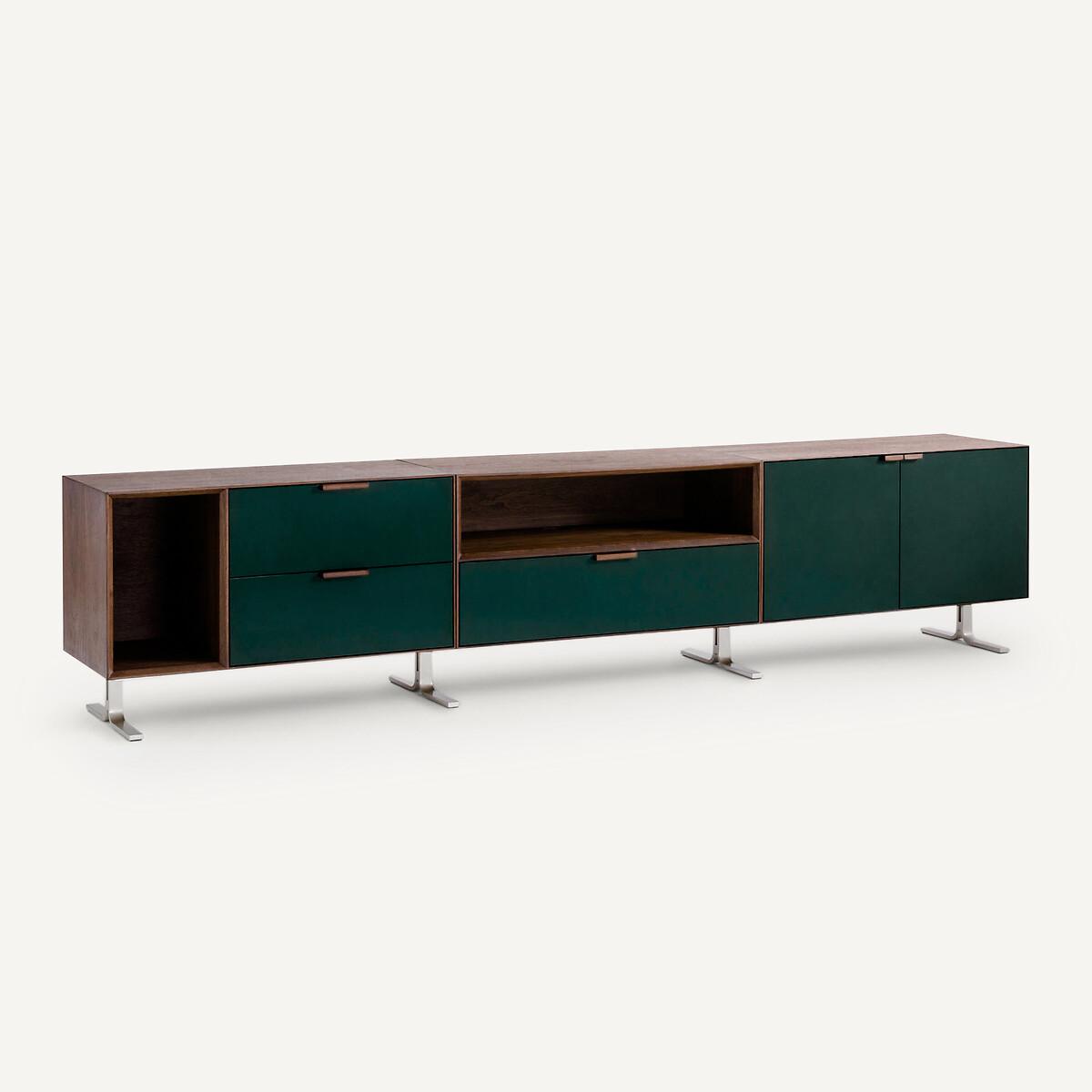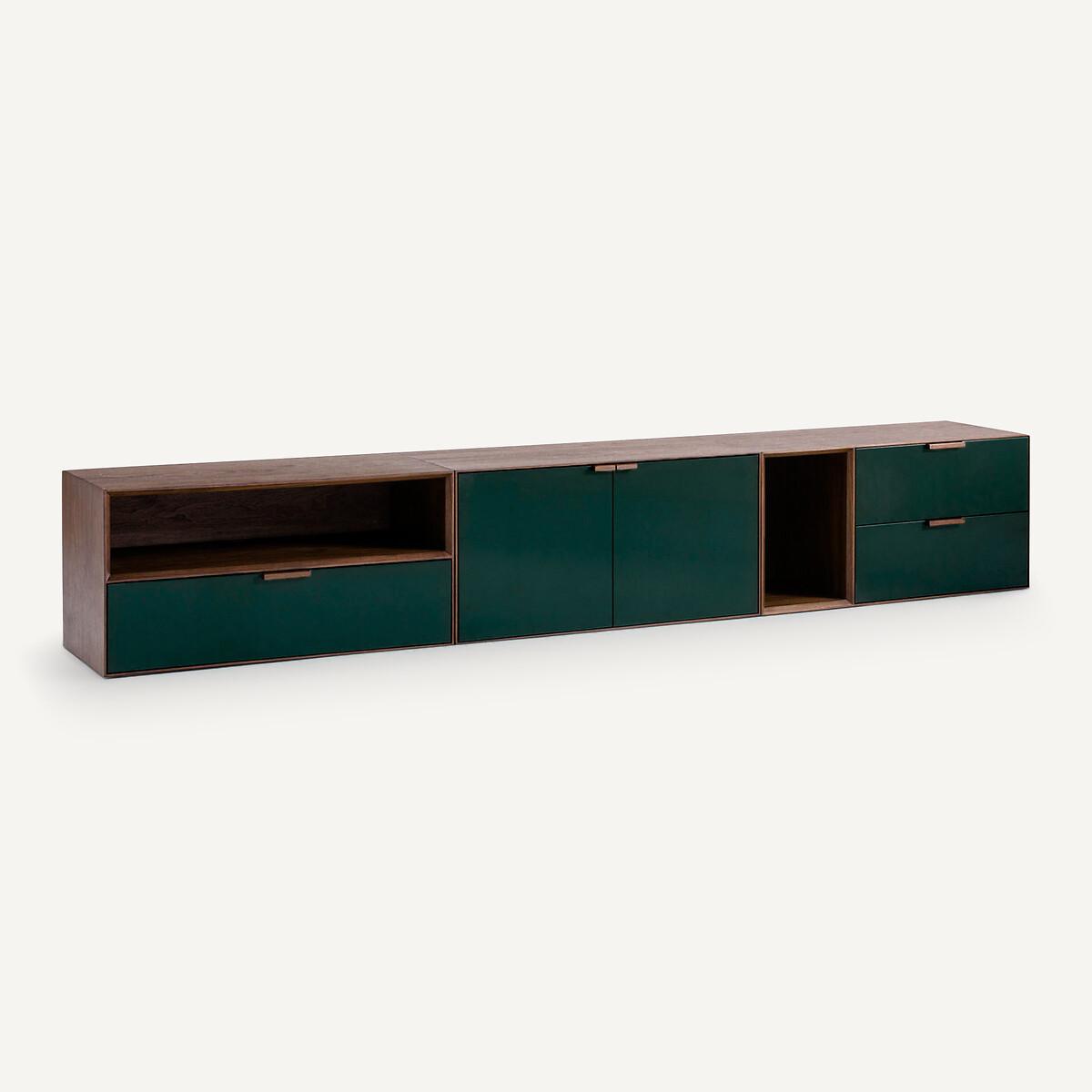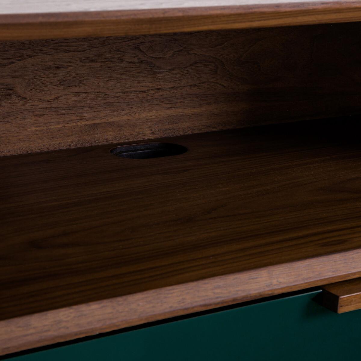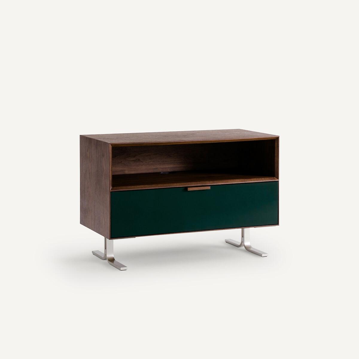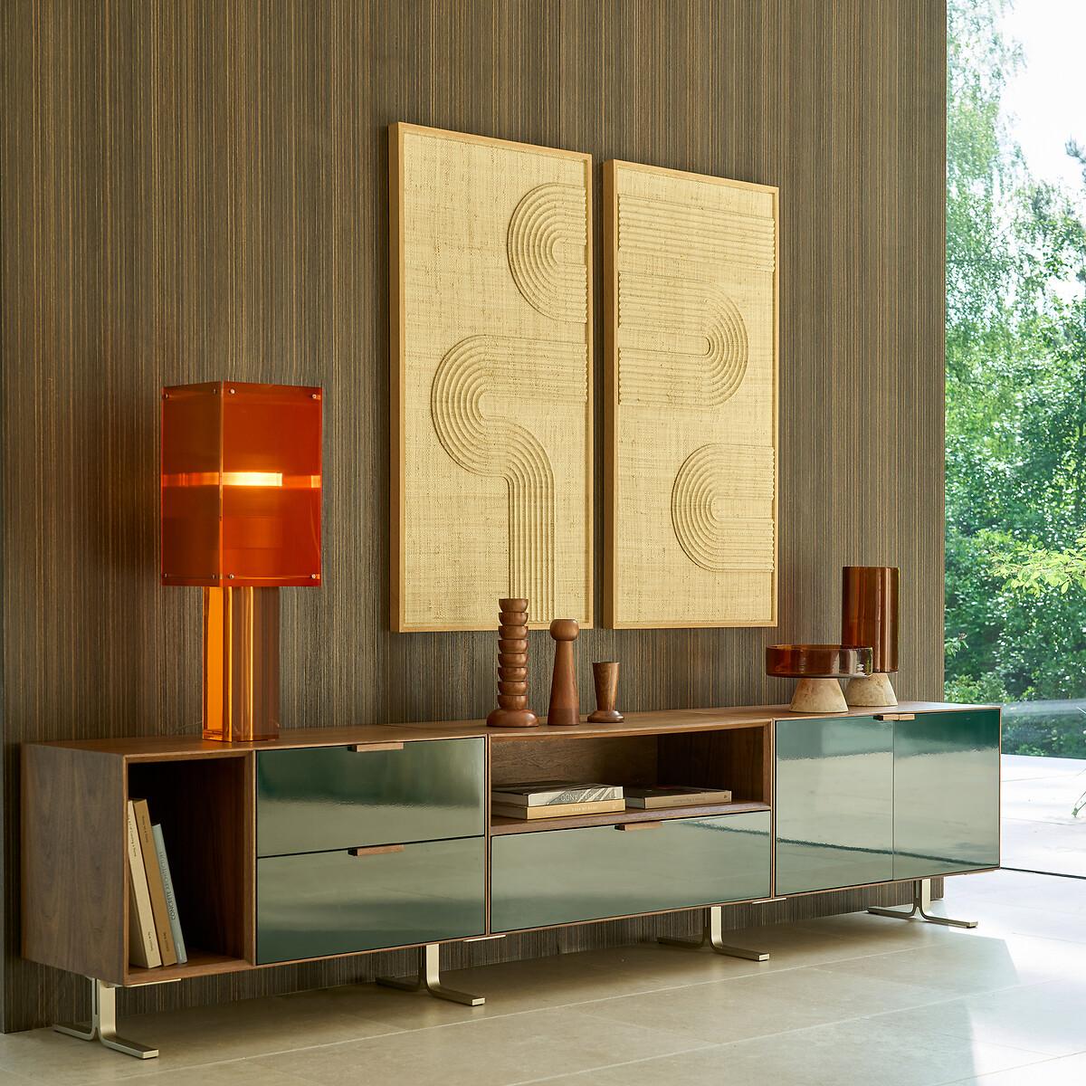 Taken from the Aldon modular storage system, this element can be used alone or combined with other modules in the range, in particular to create a TV cabinet.The finish of the unit and the horizontal compartment, whose profile has a 45° cut, is in FSC® walnut veneer. The drawer has a lacquered front and a soft closing finish. Aldon can be wall mounted, cantilever style, or mounted on feet sold separately. An AMPM exclusive designed to adapt to all spaces. Product Details • Unit and compartment in FSC®-certified walnut veneered MDF, nitrocellulose varnish finish • 1 drawer in FSC® certified walnut veneered MDF, painted front, semi-gloss lacquer finish, polyurethane varnish, soft closing system • 1 large compartment, edge detail cut at 45° • 1 cable entry port • To fix to the wall (screws and plugs not included) or to put on feet, sold separately. Quality Info • German brand hardware: reliable, discreet and functional. These accessories ensure the longevity of your product. • Soft-closing : system for closing doors smoothly, silently, also preventing fingers from getting caught. Dimensions. Overall • Width: 90cm • Height: 45cm • Depth: 43cm Usable space • Compartment: L86 x H19 x D39cm • Drawer: L82 x H12 x D28cm Delivery:Sold pre-assembled. It will be delivered to your door. Note! Please check that all access points are large enough to accommodate your delivery (doors, stairs, lifts). • WOOD FROM SUSTAINABLY MANAGED FORESTS. FSC® certified wood comes from forests that are environmentally, socially and economically well managed. Dimensions and weight of parcel 1 parcel • L99 x H56 x D52cm. 42kg.