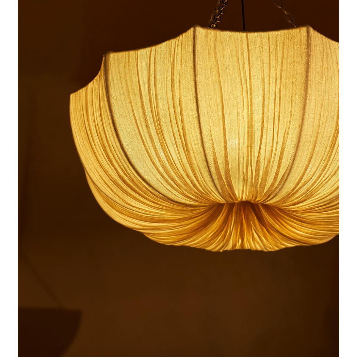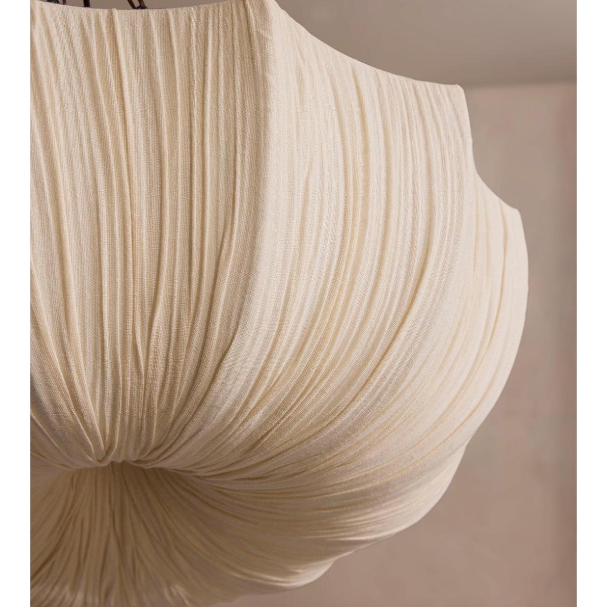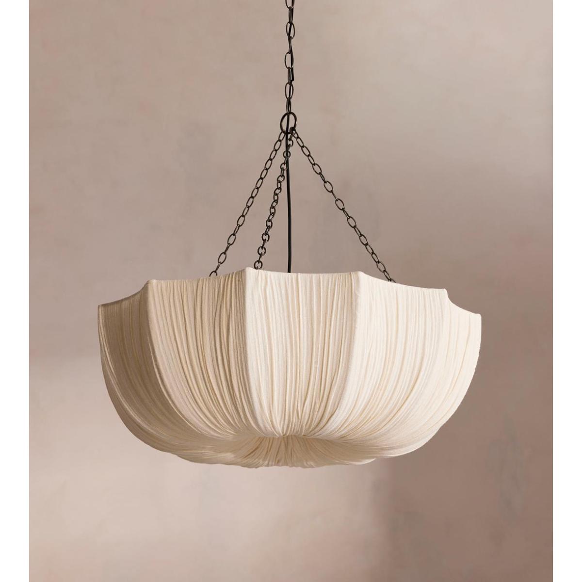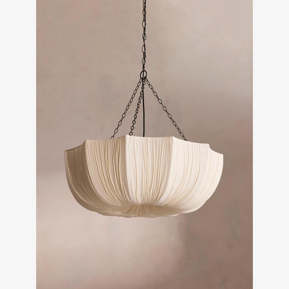 Soft, hand-ruched cotton in a neutral tone contrasts against the blackened brass of this pendant light. Inspired by the original features that run throughout Soho House Berlin, the Aldwin pendant's soft, domed silhouette is covered with light, woven cotton. Suspended from adjustable chains, it can be hung lower or closer to the ceiling.
