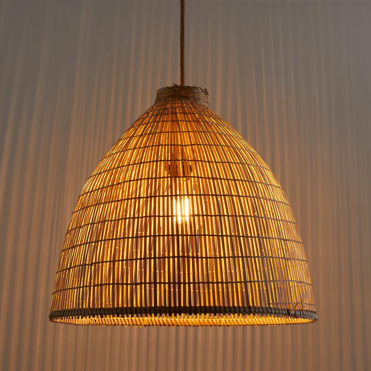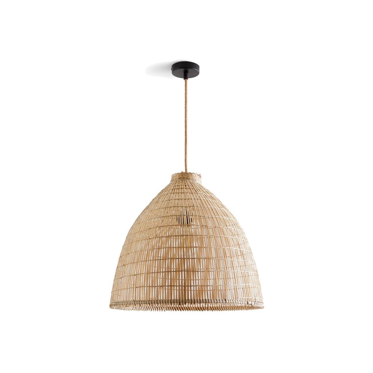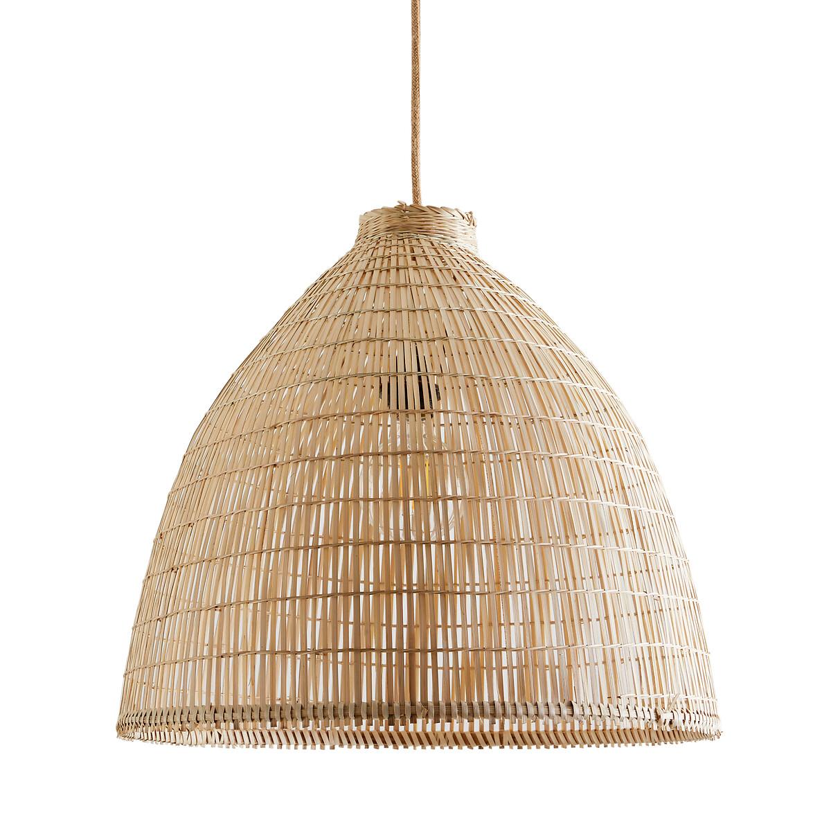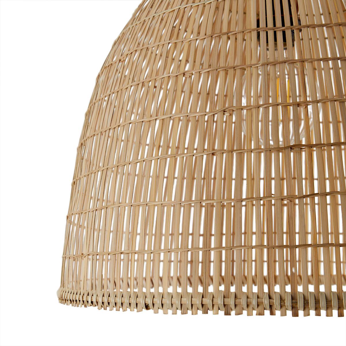 Inspired by a fisherman's trap, this bamboo pendant light releases a soft and warm light. Perfect for giving a bohemian and summer atmosphere to all interiors. Product Details • Bamboo • Iron structure covered with epoxy paint • Supports E27 bulb (not supplied) • Artisanal craftsmanship • This product is sold non-electrified. Find the Baulind electric cable sold on the site. Dimensions • Diameter: 50cm • Height: 44cm Parcel dimensions and weight: • 1 parcel • L53 x H47 x D53cm. 2.5kg.